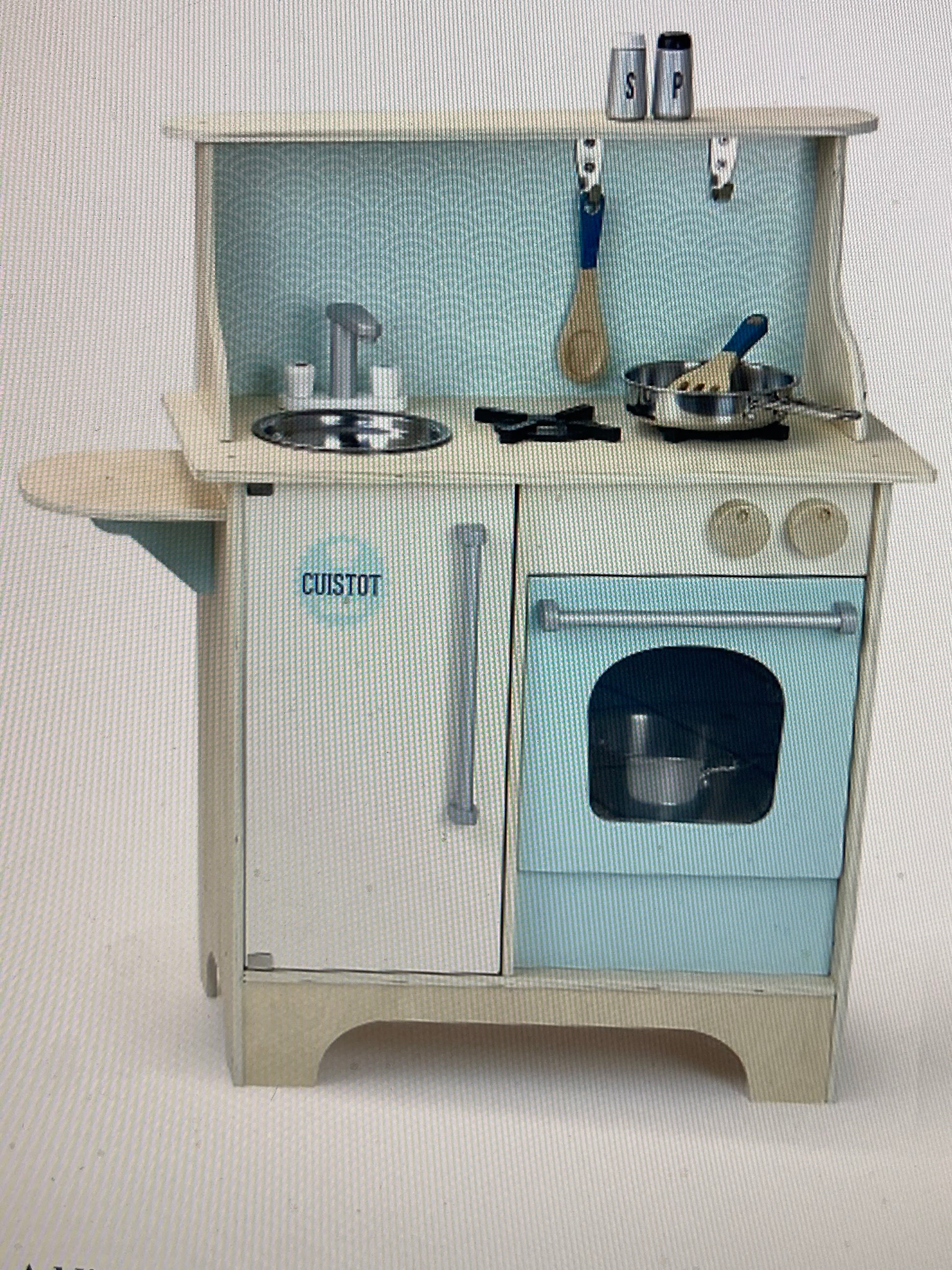 From Vilac Toys, France this is a COMPLETE KITCHEN sized just right for children. Made of real wood, with 2 STAINLESS POTS, and 2 WOODEN SPOONS for cooking... with 2 doors that open for a cupboard, with 2 wooden shelves for storing items, and an oven for cooking in, with a wooden shelf. In a lovely light blue! (Not available in yellow.)