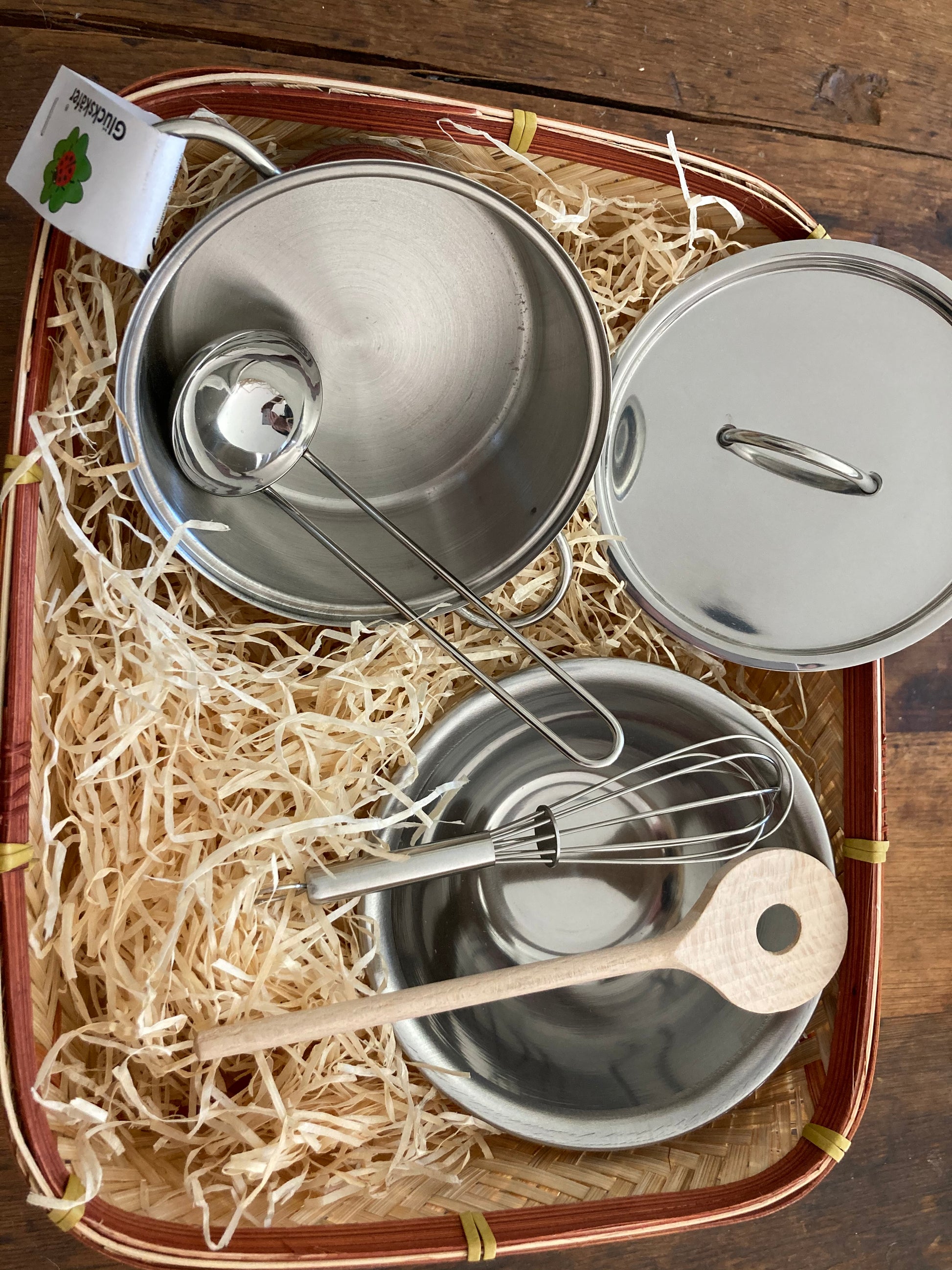 Can actually be used in your home kitchen. Child sized STAINLESS POT, BOWL, WHISK, WOODEN SPOON and SOUP LADLE to encourage cooking and baking skills. View our Keeping House Play Collection.