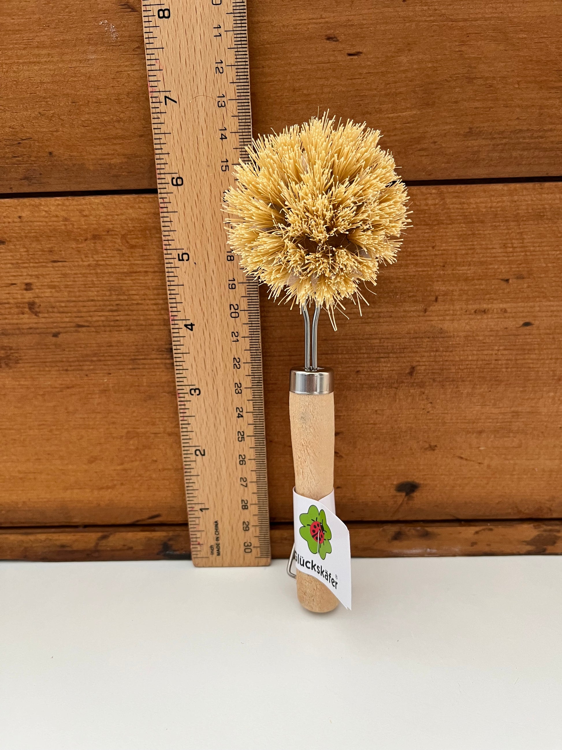 With wooden handle, and hanging hook and real dish scrubbing bristles. 16 cm long (6,5inches).
