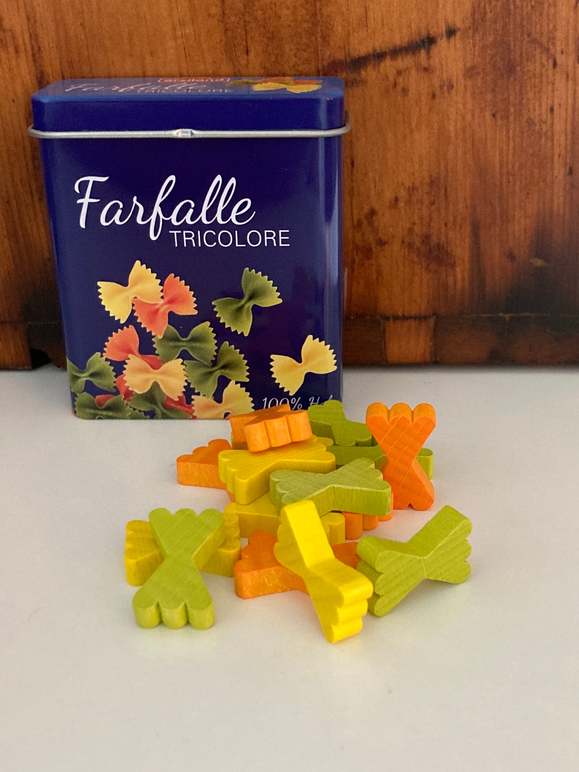 Kitchen Play Food - Wooden PASTA BOWTIES, in a TIN, 15 pieces!