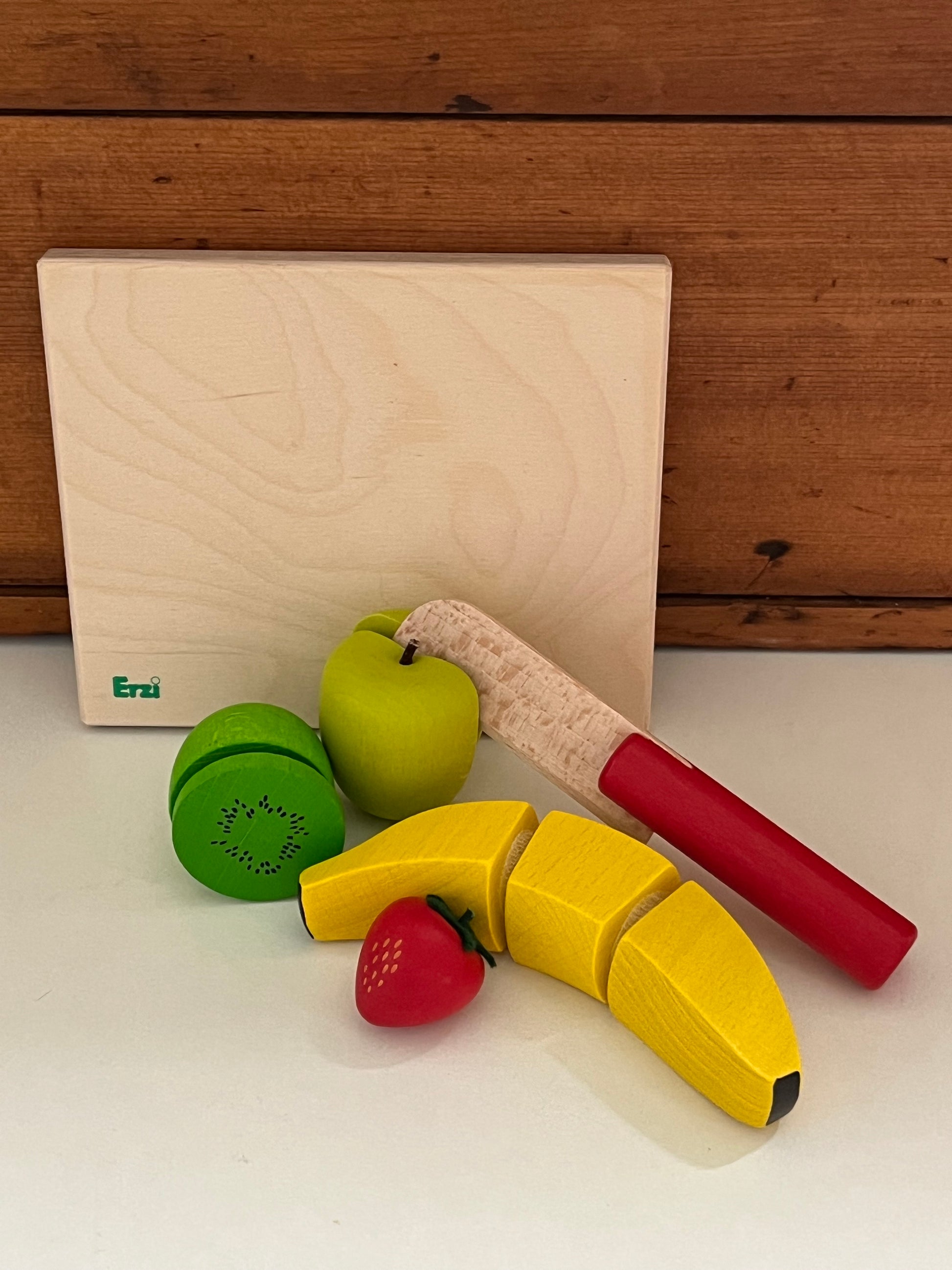 All fruit is solid wood, and the set includes a WOODEN KNIFE to help cut up the fruit, and a small WOODEN BOARD to serve with. The board is 15x15cm (6x6inches). Everything comes in a cardboard box.