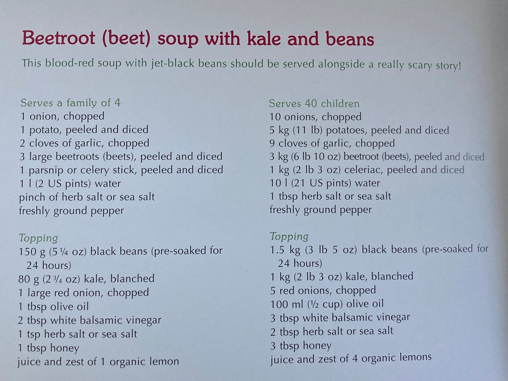 Contains over 80 seasonal recipes that celebrate Nature. The book is divided into the 4 seasons with recipes and activities. From winter campfire soup to spring strawberry ice pops. From summer green pea cake to fall cherry focaccia. Delicious! Easy! Fun! Nutritious!