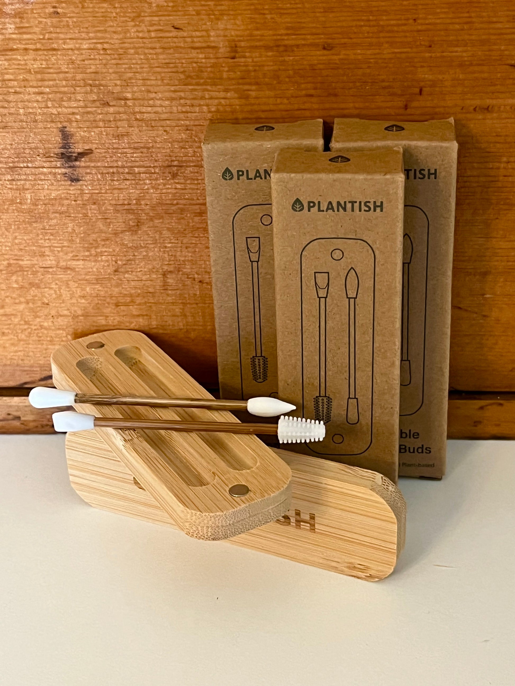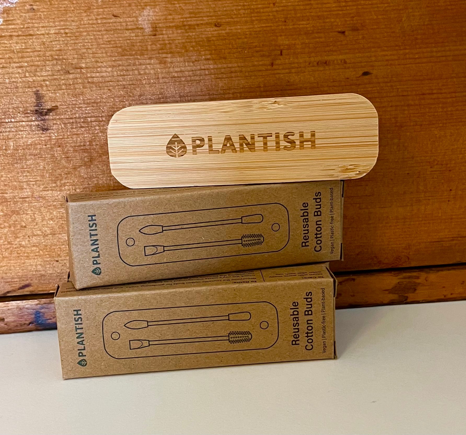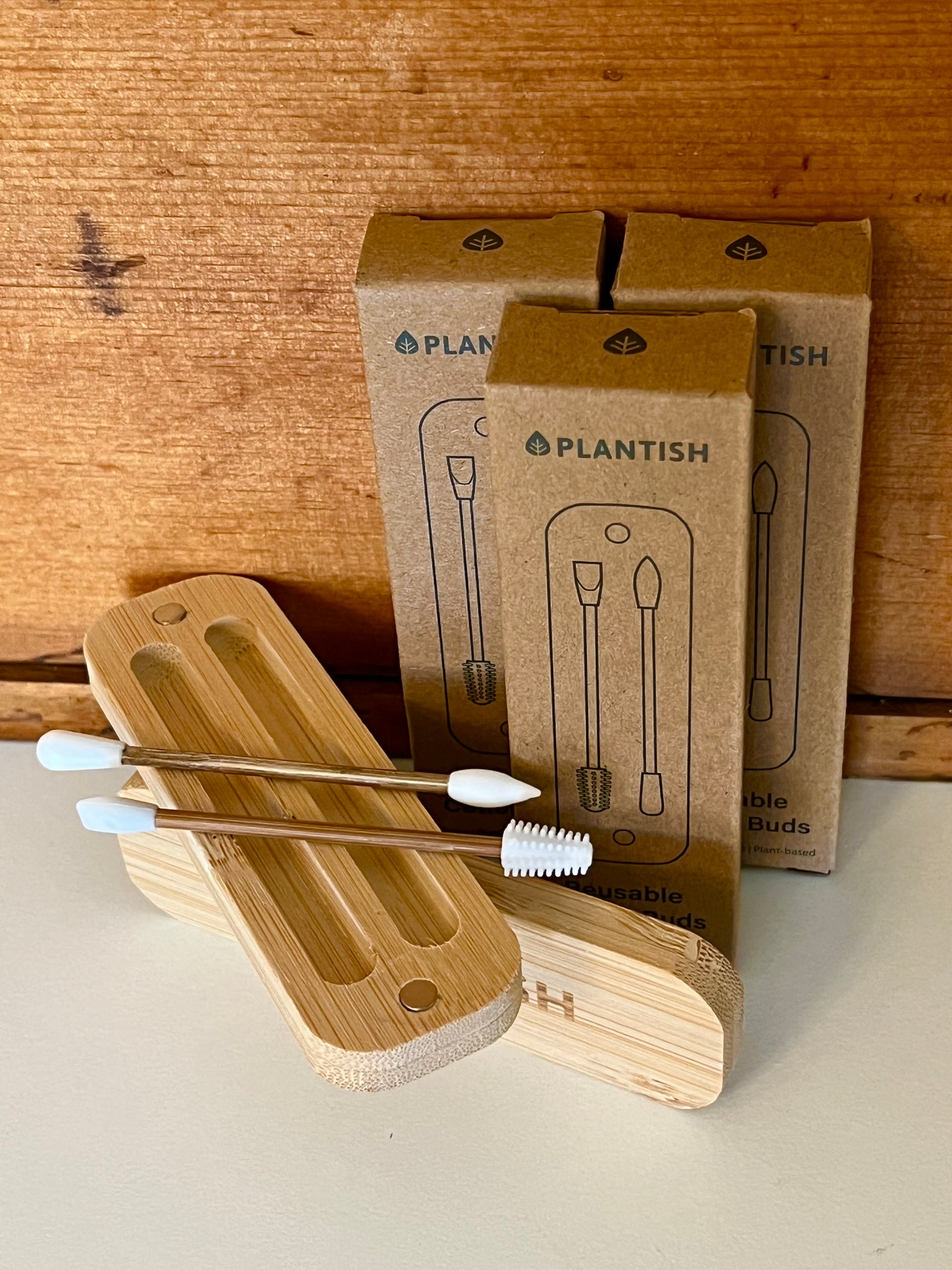Plantish's REUSABLE EAR BUDS with travel case are a great way to help combat waste without any inconvenience. Clean with warm soapy water after each use. They store easily in the beautiful magnetic wooden case.