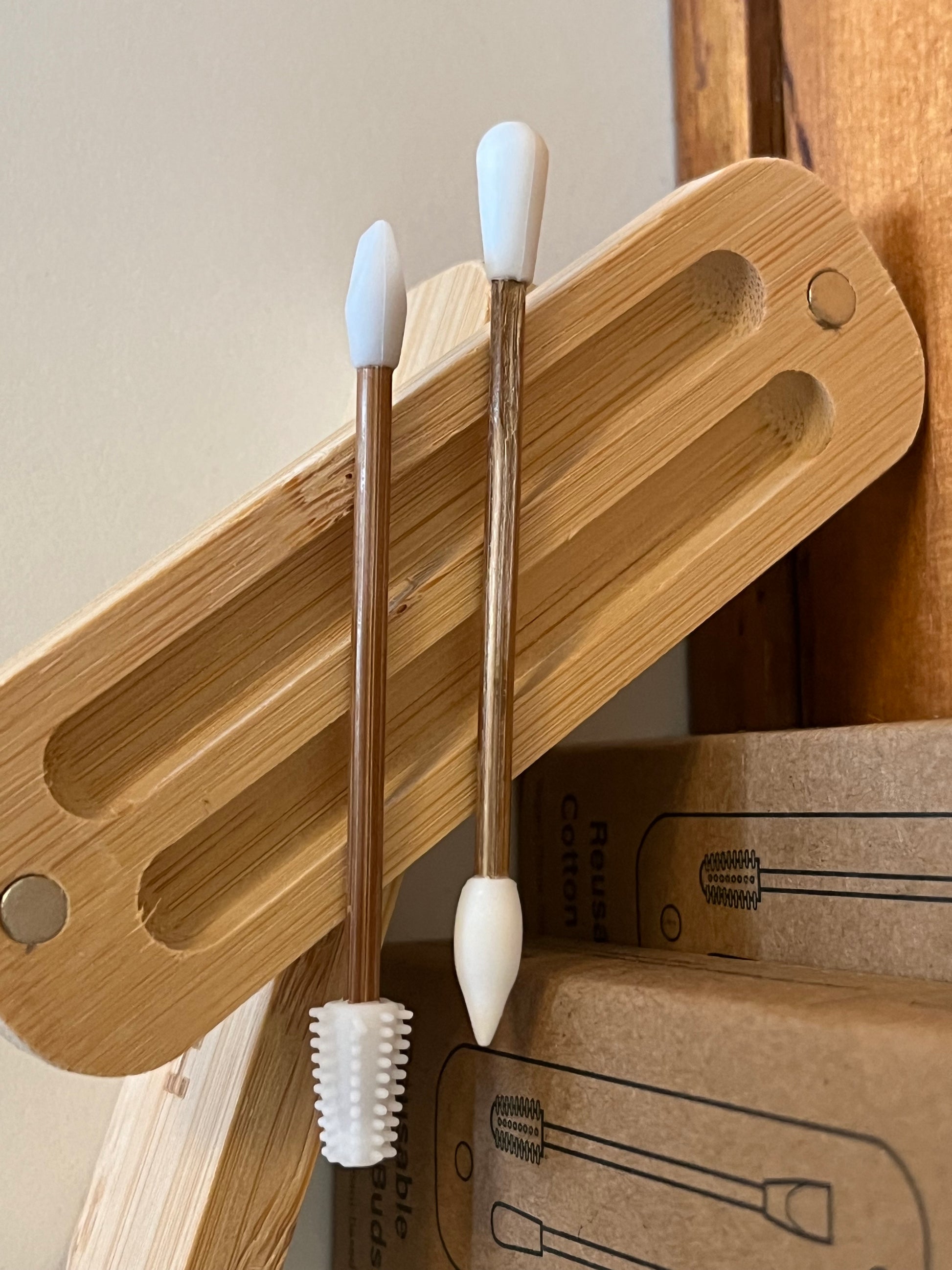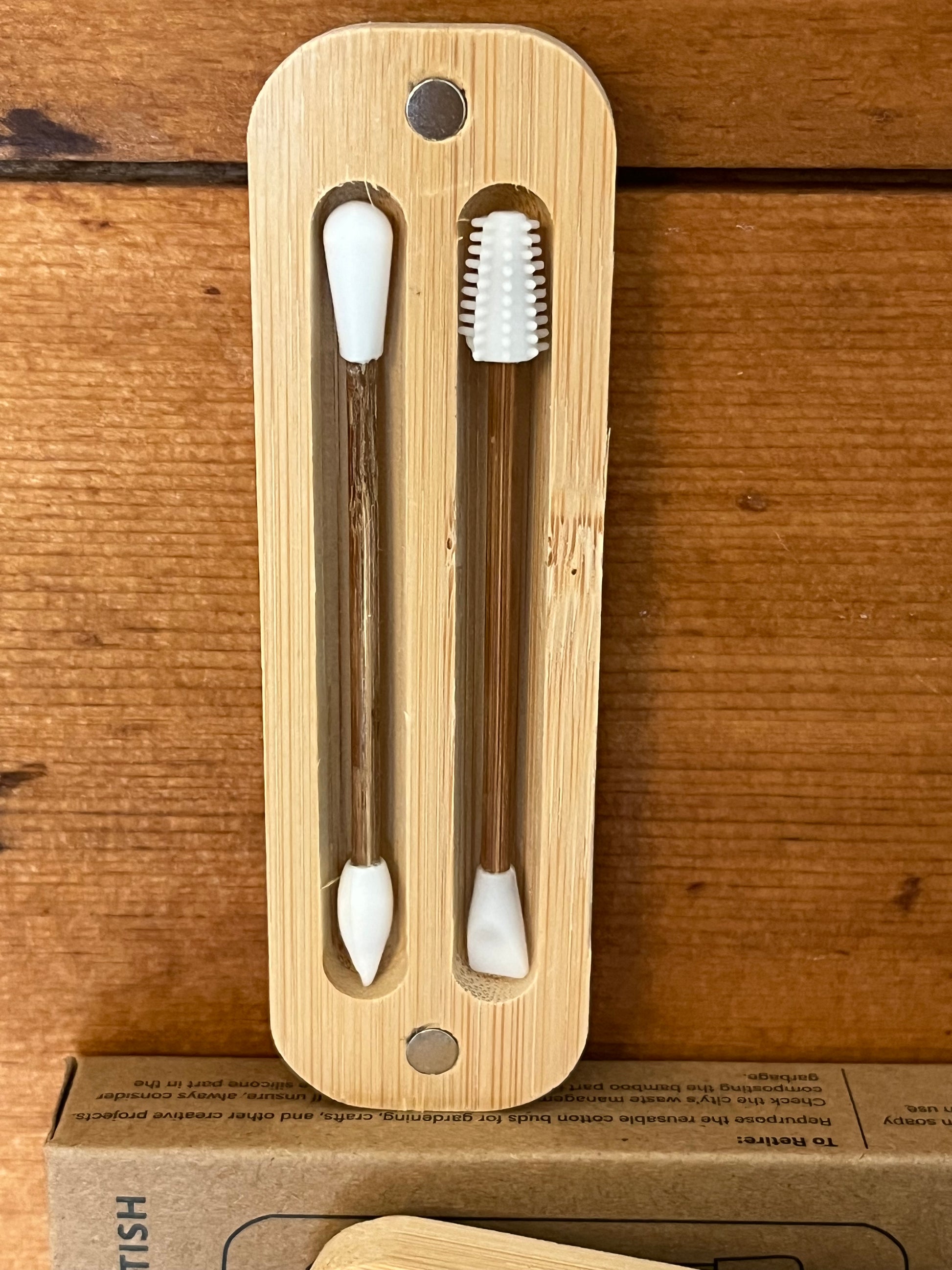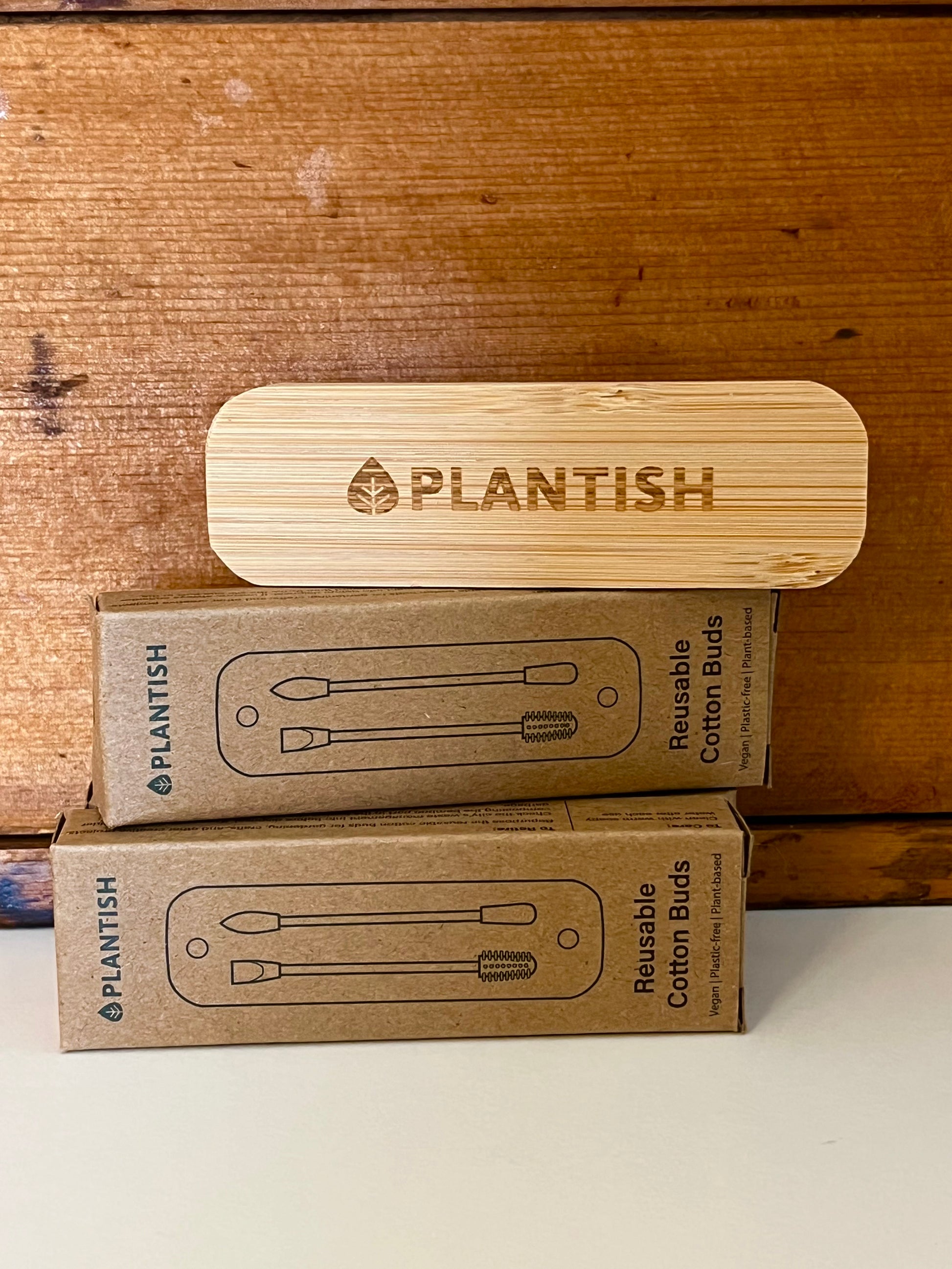Plantish's REUSABLE EAR BUDS with travel case are a great way to help combat waste without any inconvenience. Clean with warm soapy water after each use. They store easily in the beautiful magnetic wooden case.