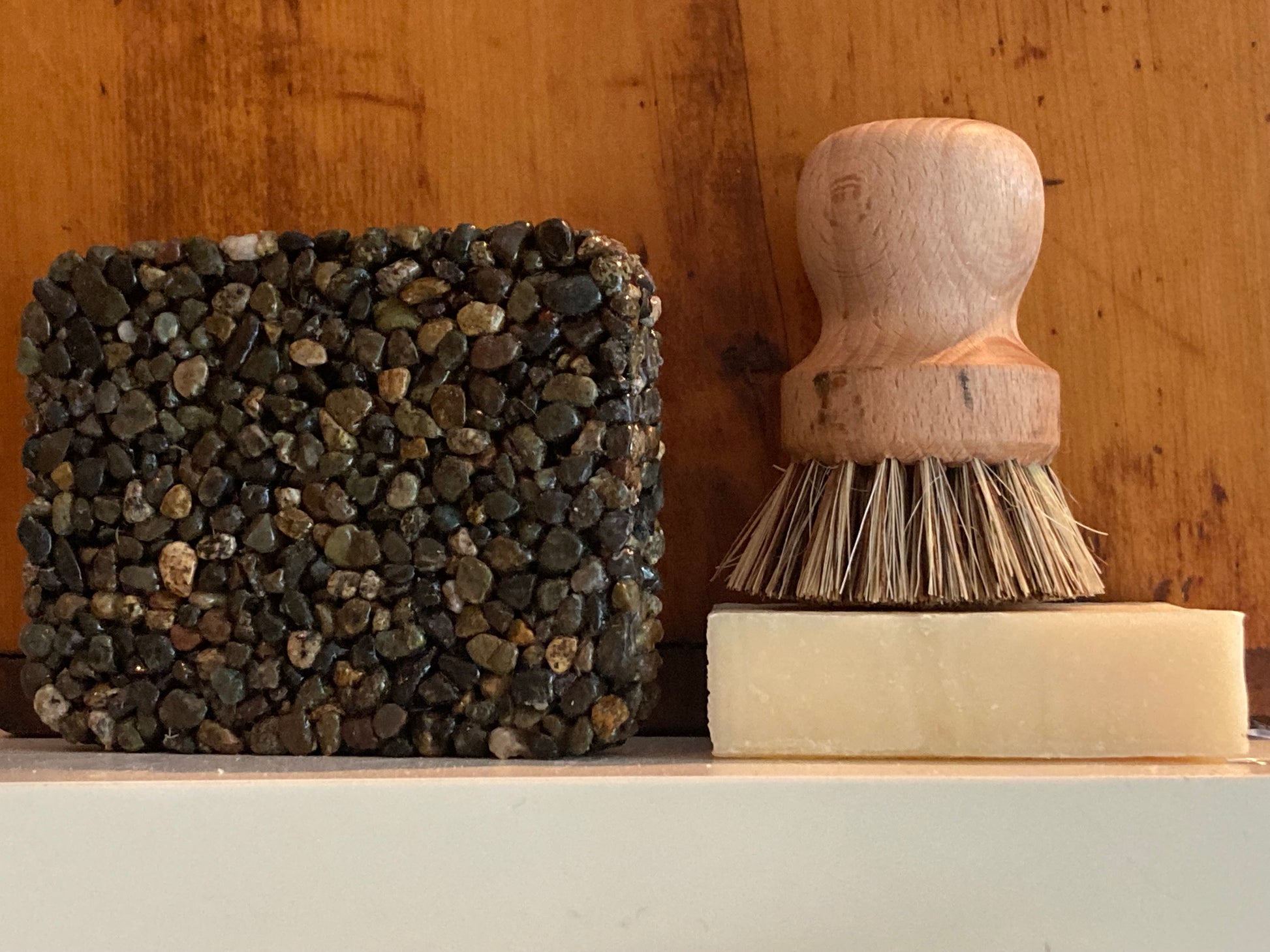 The Kitchen Dish Soap Bar is resting on our STONE SOAP DISH. Absolutely solid and beautiful and made from real, washed river stones. The stones are glued together to form a virtually, indestructible, functional...porous...counter-top soap dish.