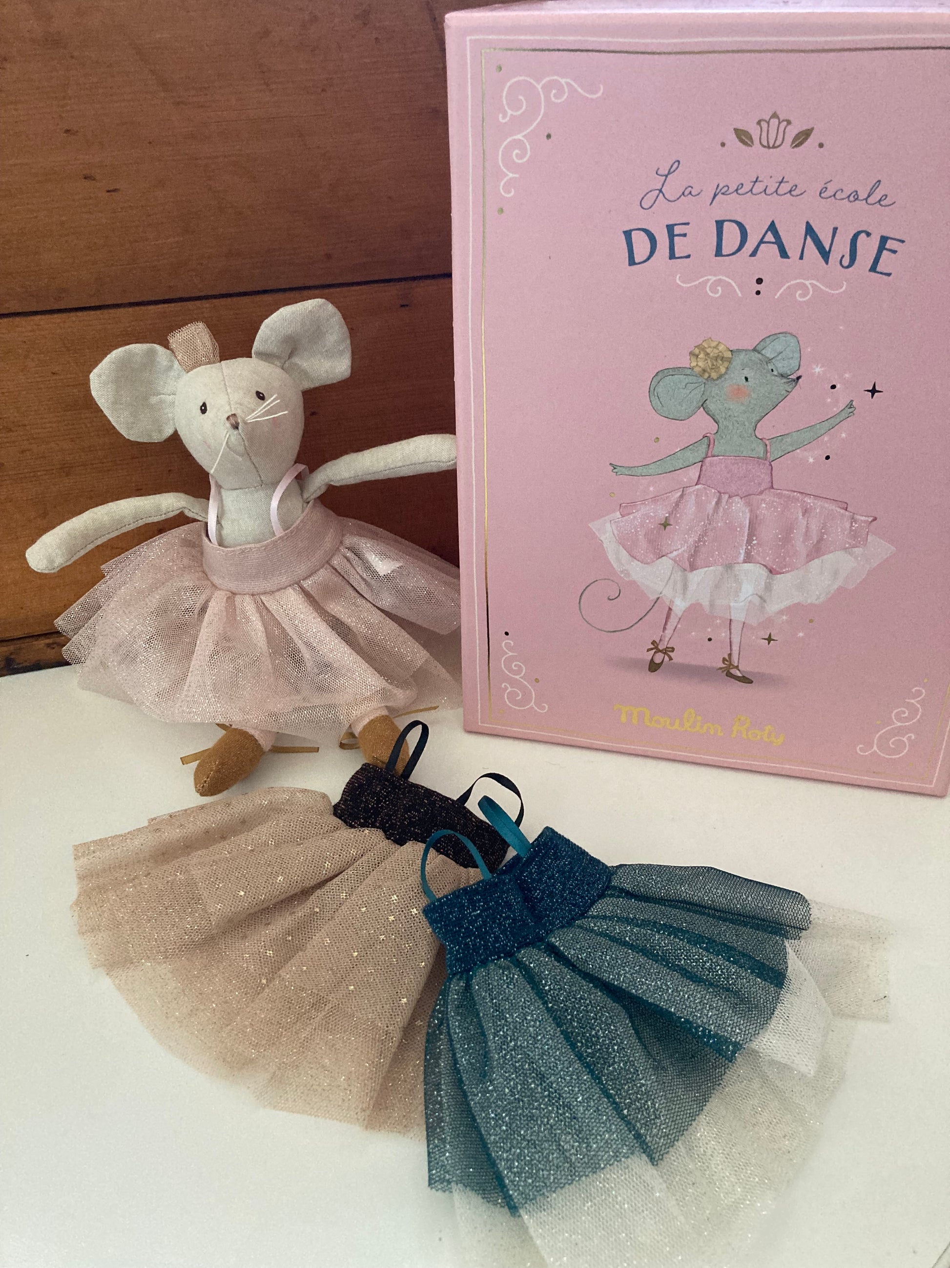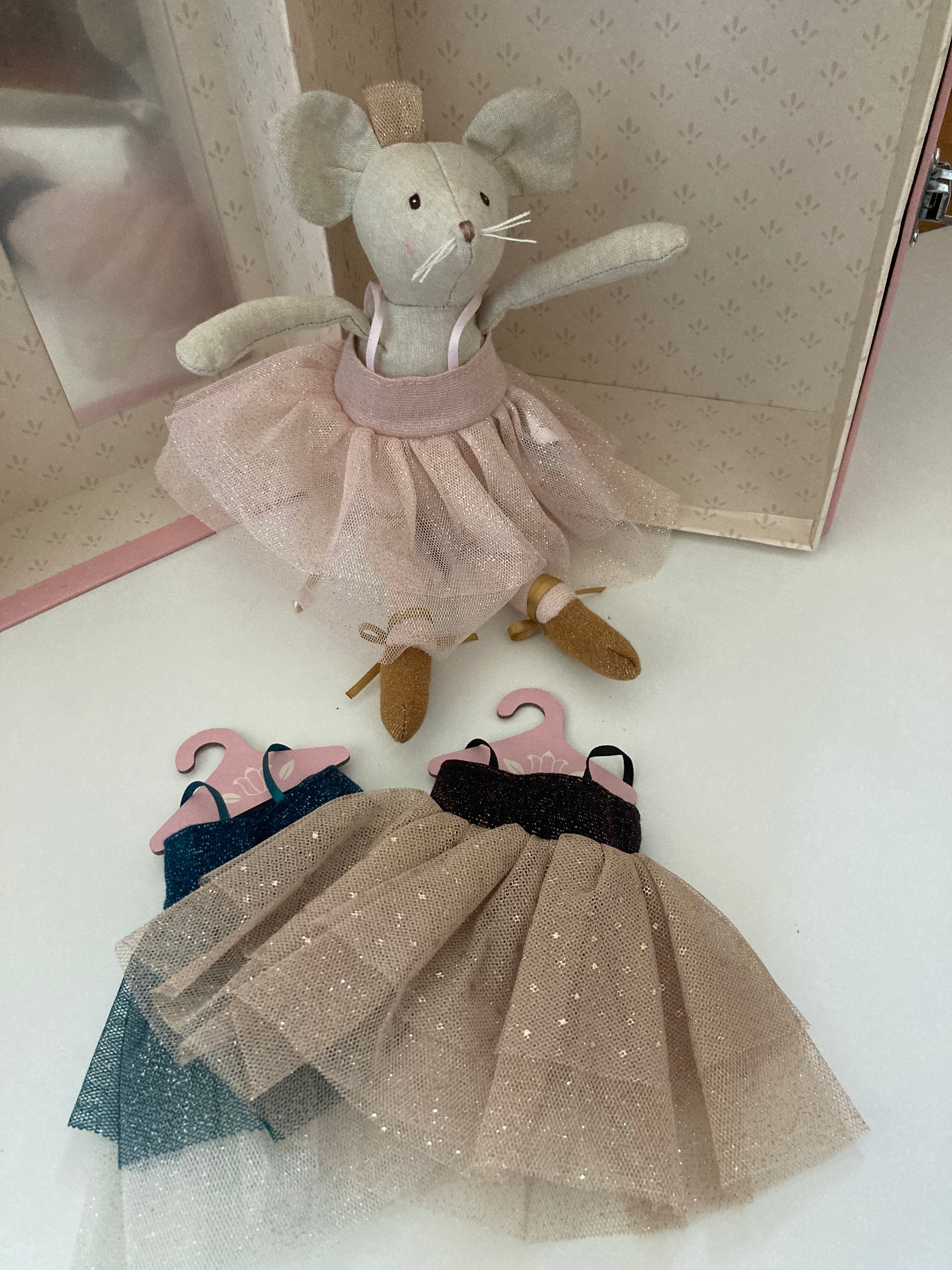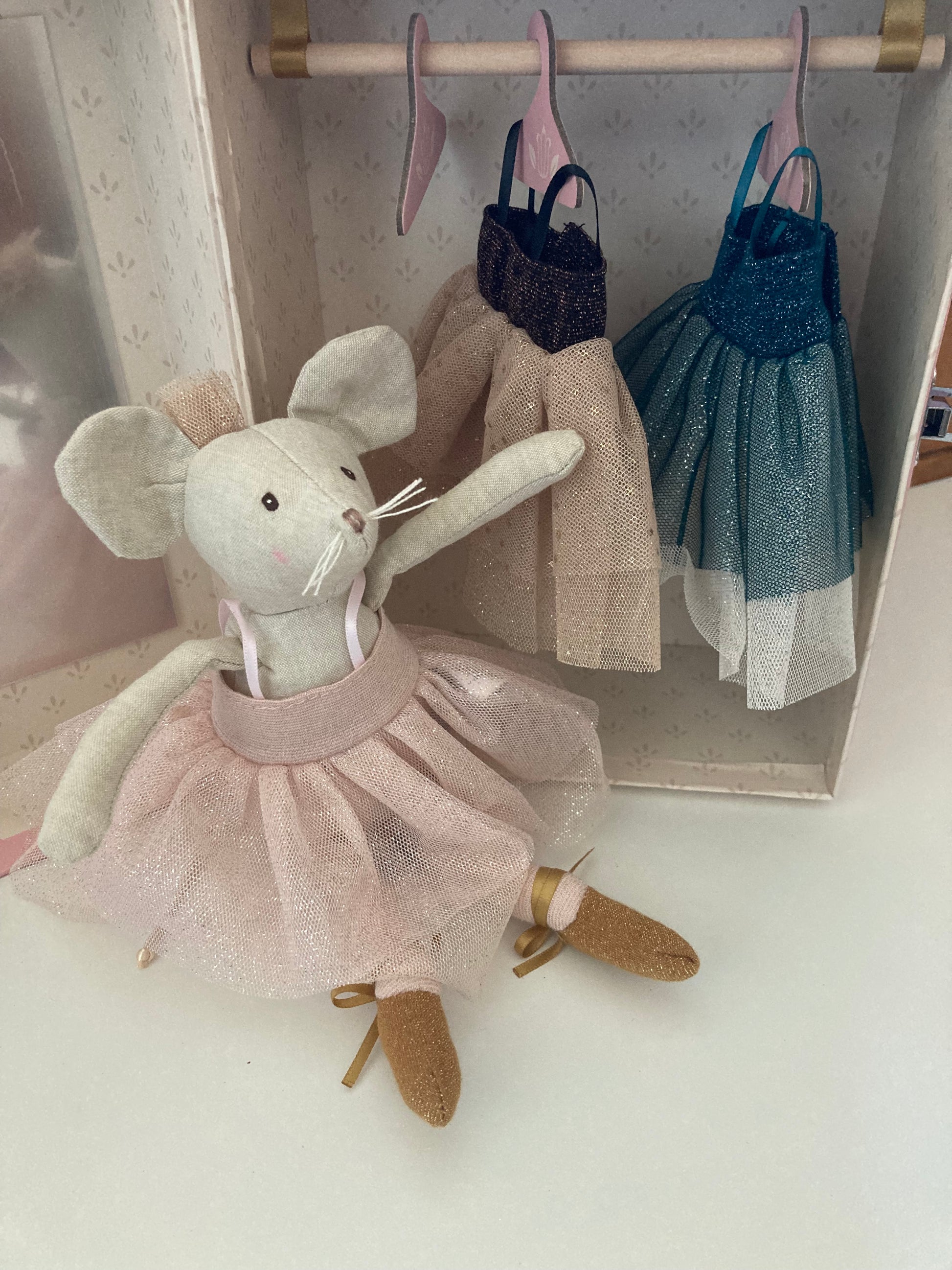 Little Angelina Mouse from the dance school beckons us for a peek inside the wardrobe. A small case complete with mirror, containing 3 tutu dresses.