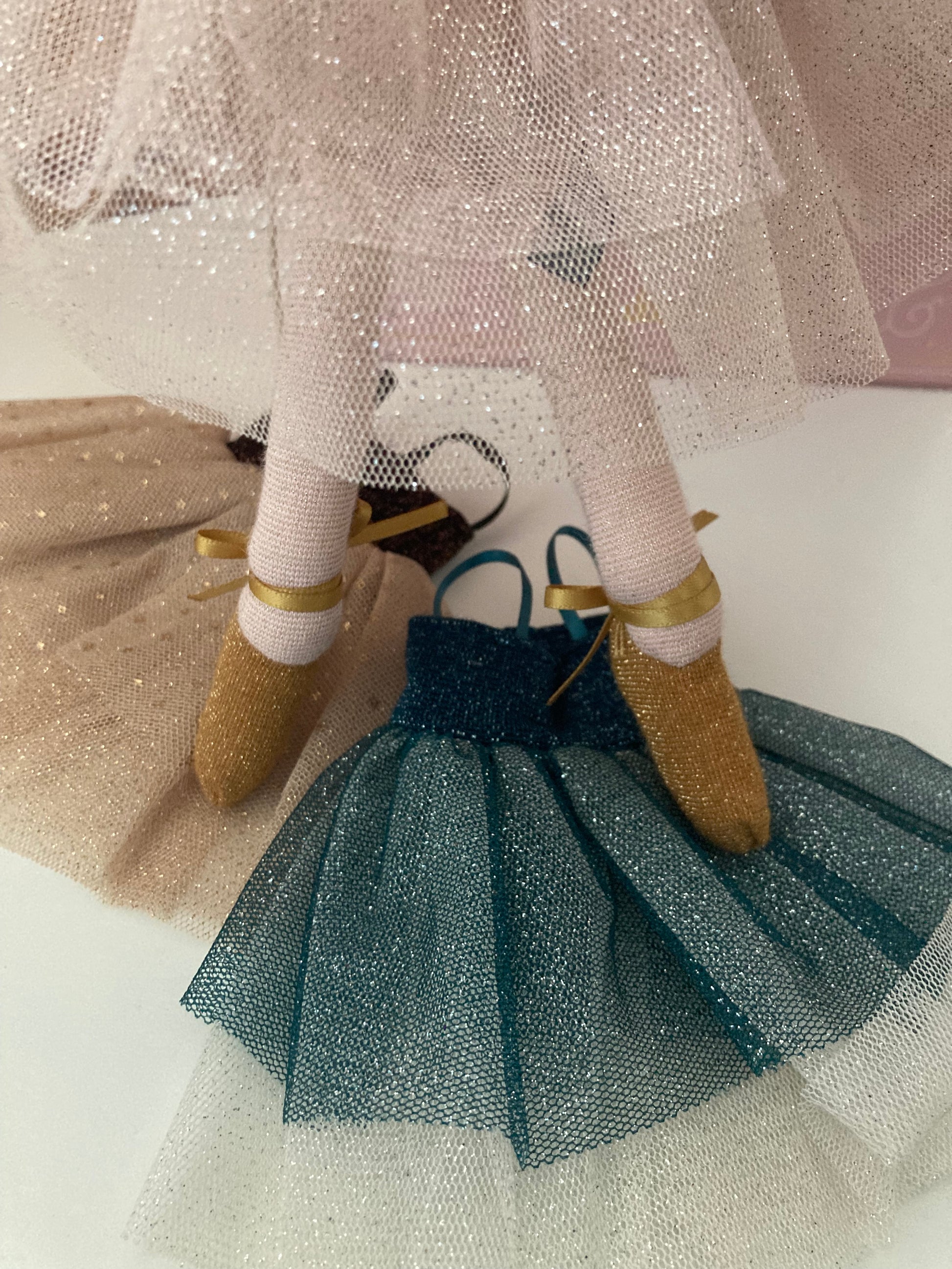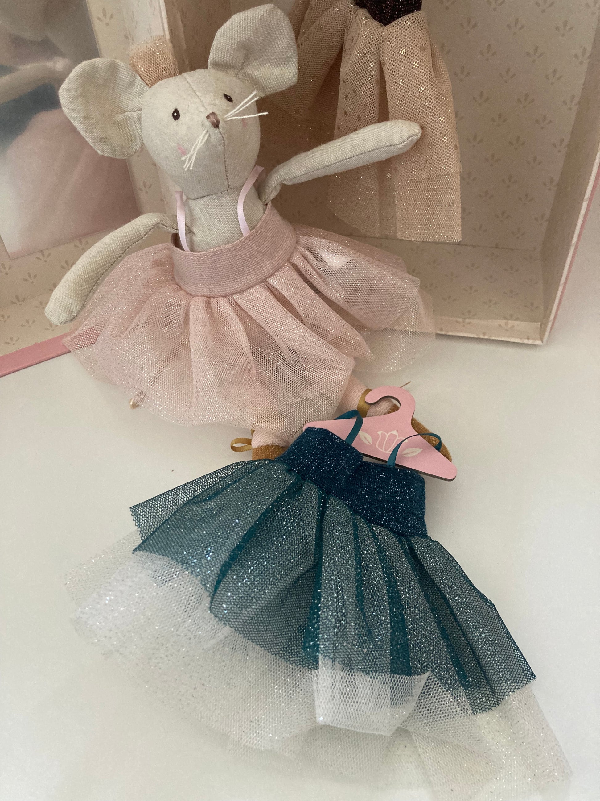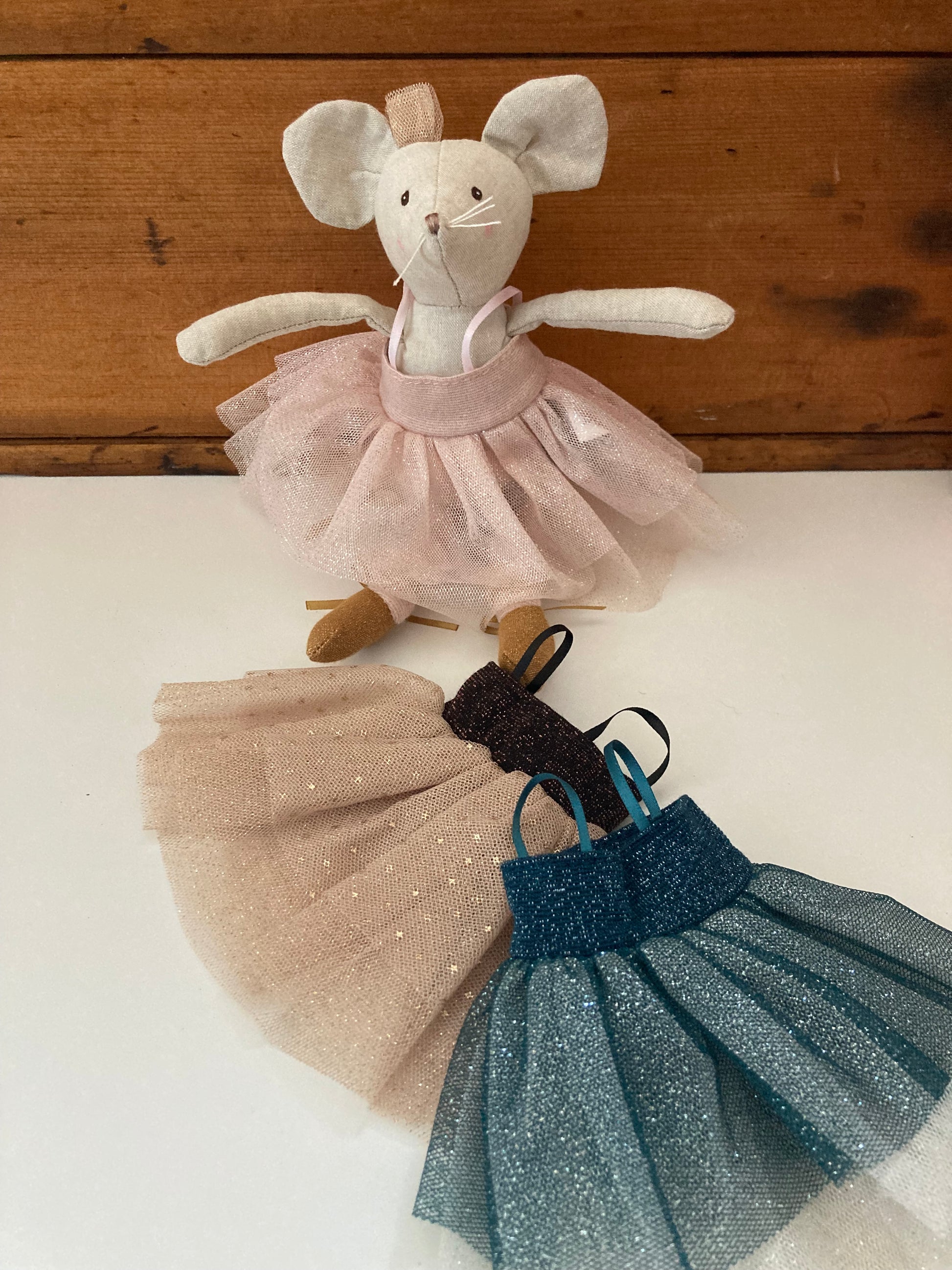 Little Angelina Mouse from the dance school beckons us for a peek inside the wardrobe. A small case complete with mirror, containing 3 tutu dresses.