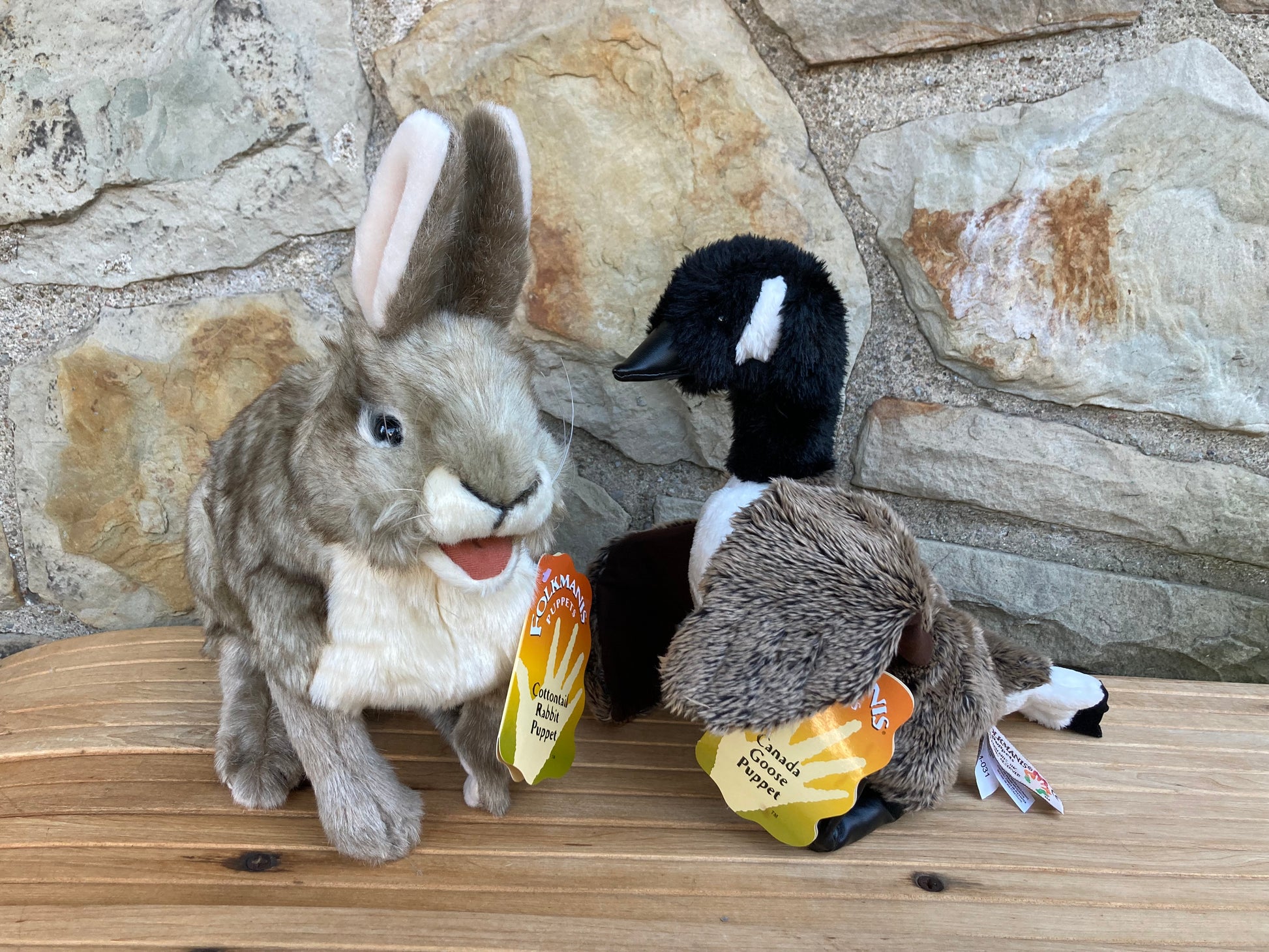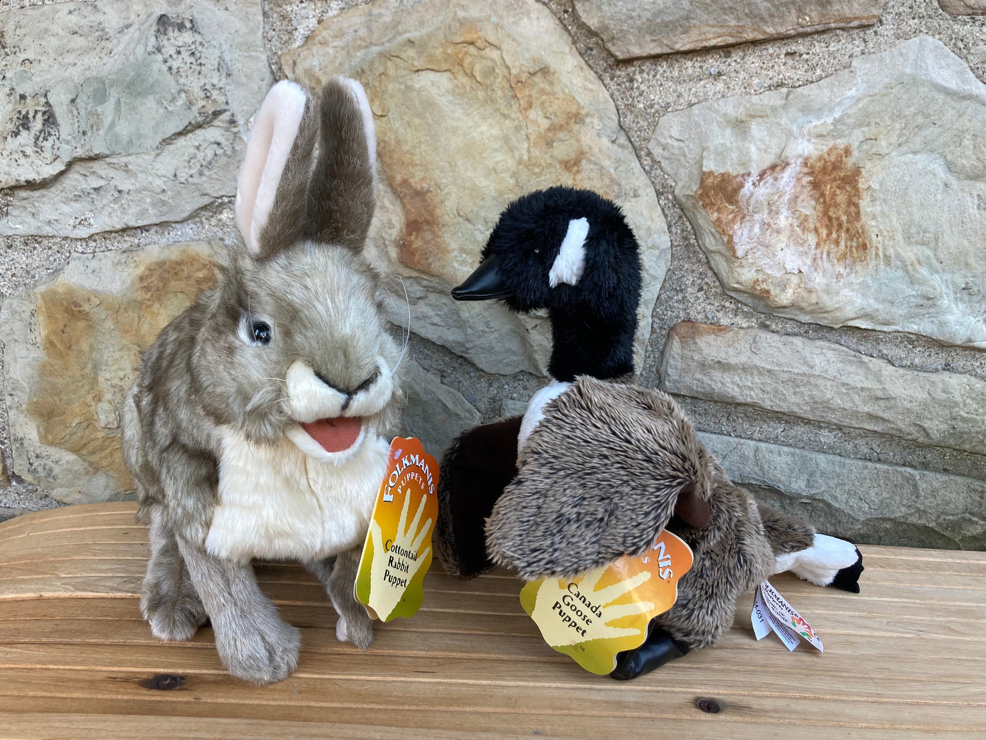 A hand placed in the under-side of the puppet can make the Canada Goose move it's wings, and bob it's long neck for true life-like movement. Pictured with the Folkmanis COTTONTAIL RABBIT PUPPET, our CANADA GOOSE PUPPET measures over 45cm (18inches) long from tip to tip of it's strong, powerful wings, and stands 30cm (12inches) tall.