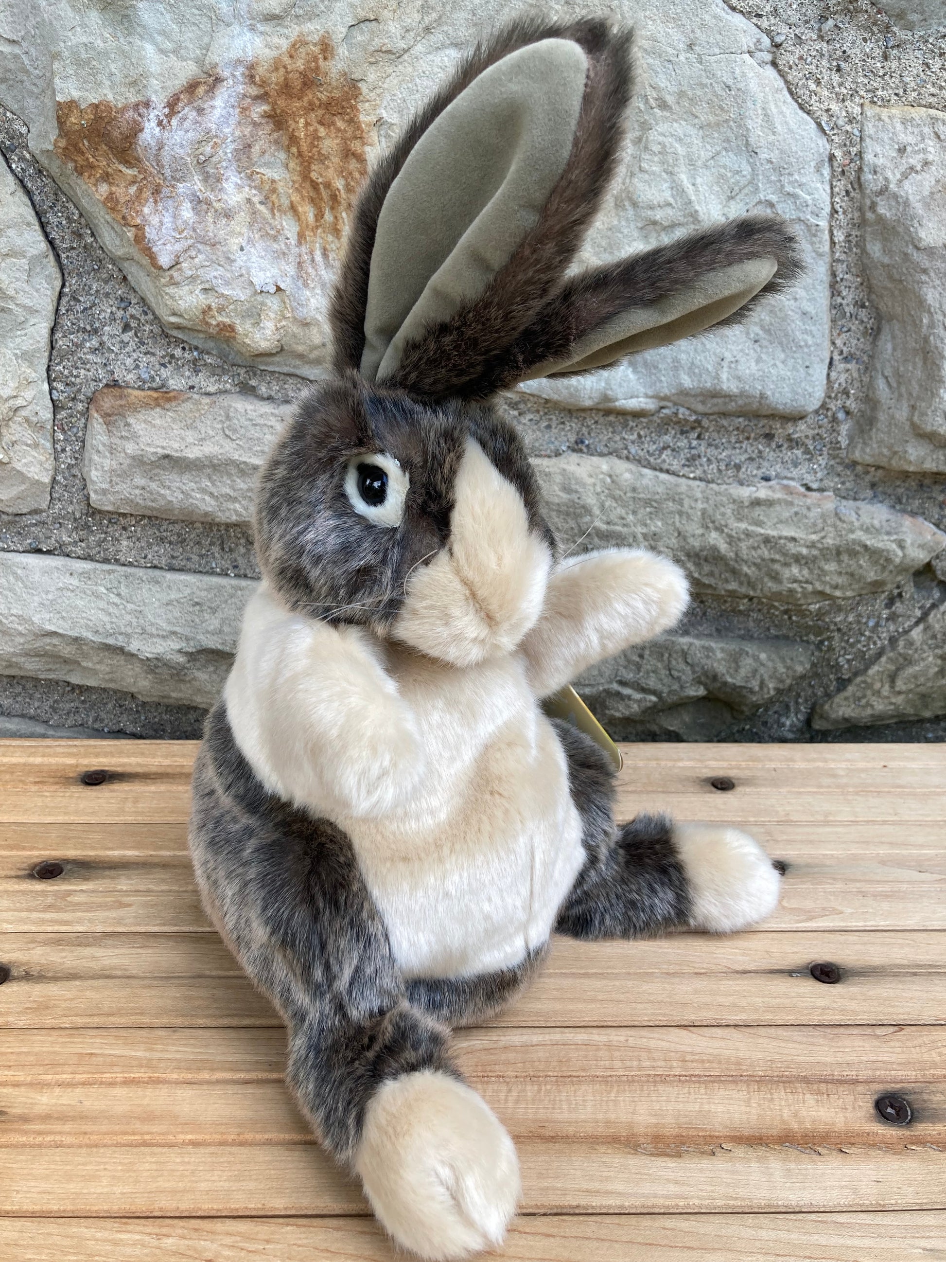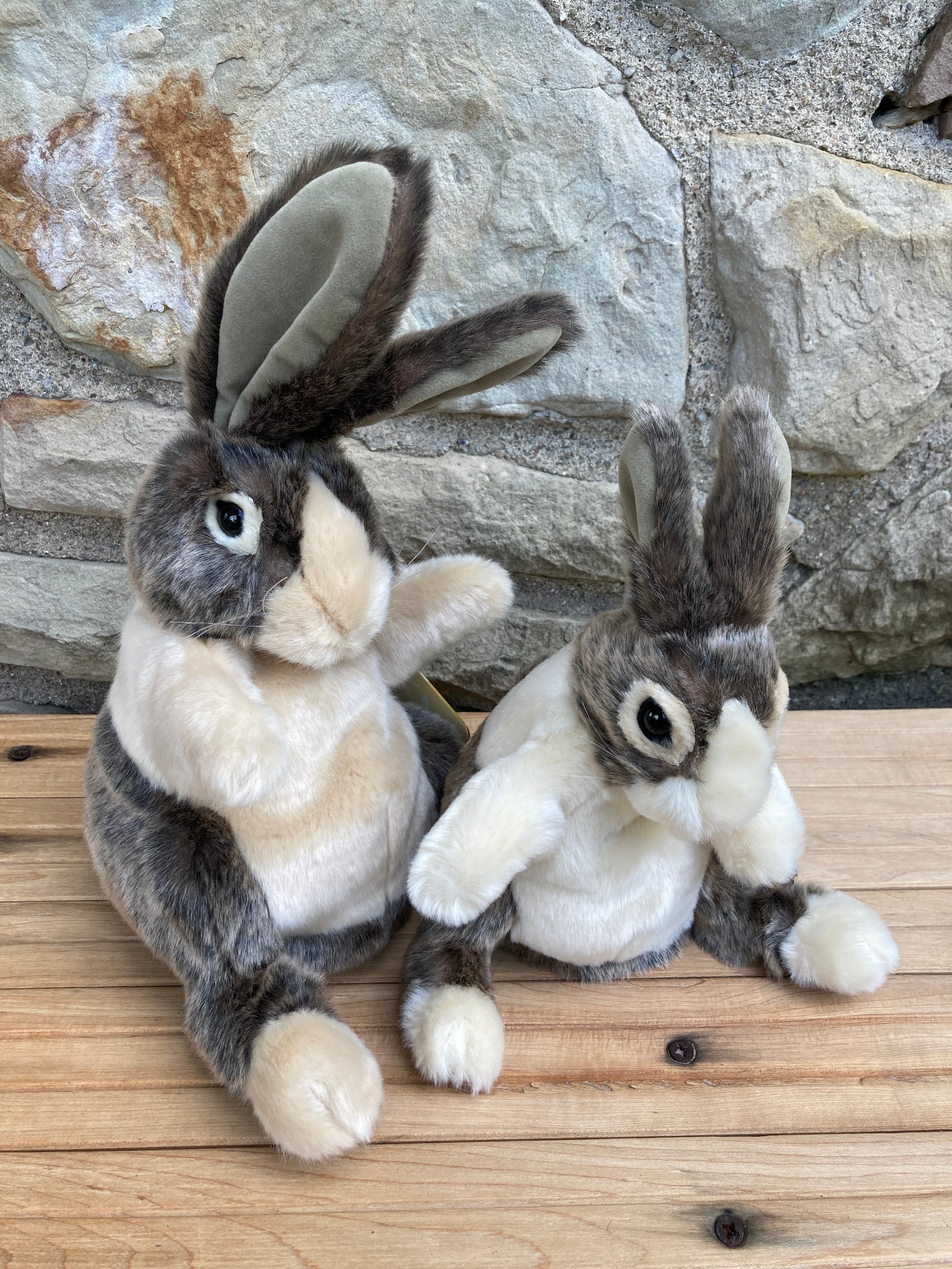 A hand placed in the under-side of the puppet can make the Dutch Rabbit's two front feet move for life-like movement. Pictured with the Folkmanis BABY DUTCH RABBIT PUPPET, our full-size DUTCH RABBIT PUPPET measures over 30cm (12inches) long to the tip of those long, silky ears. The Dutch Rabbit, and Baby Dutch Rabbit Puppets are in a natural sitting position.