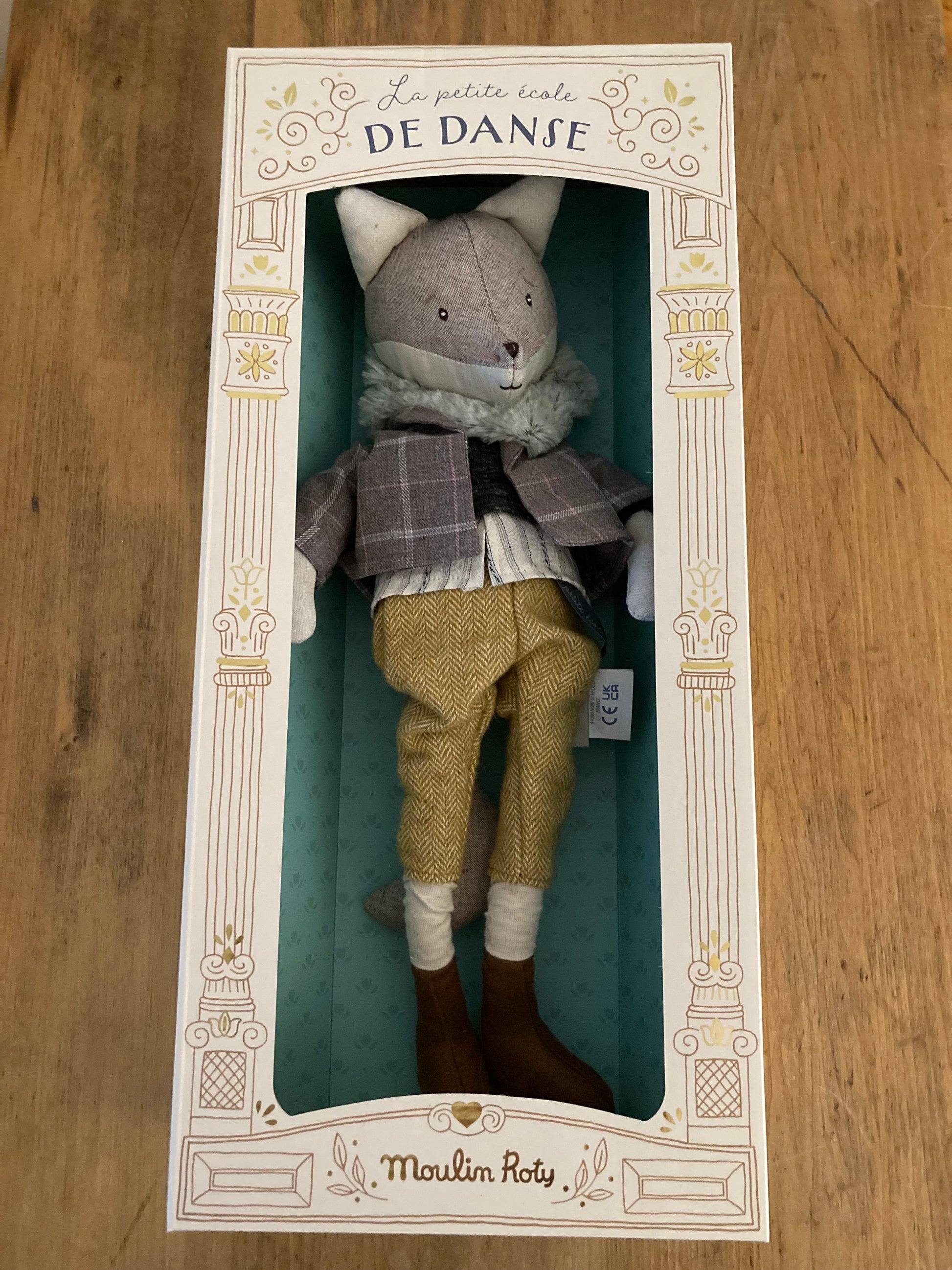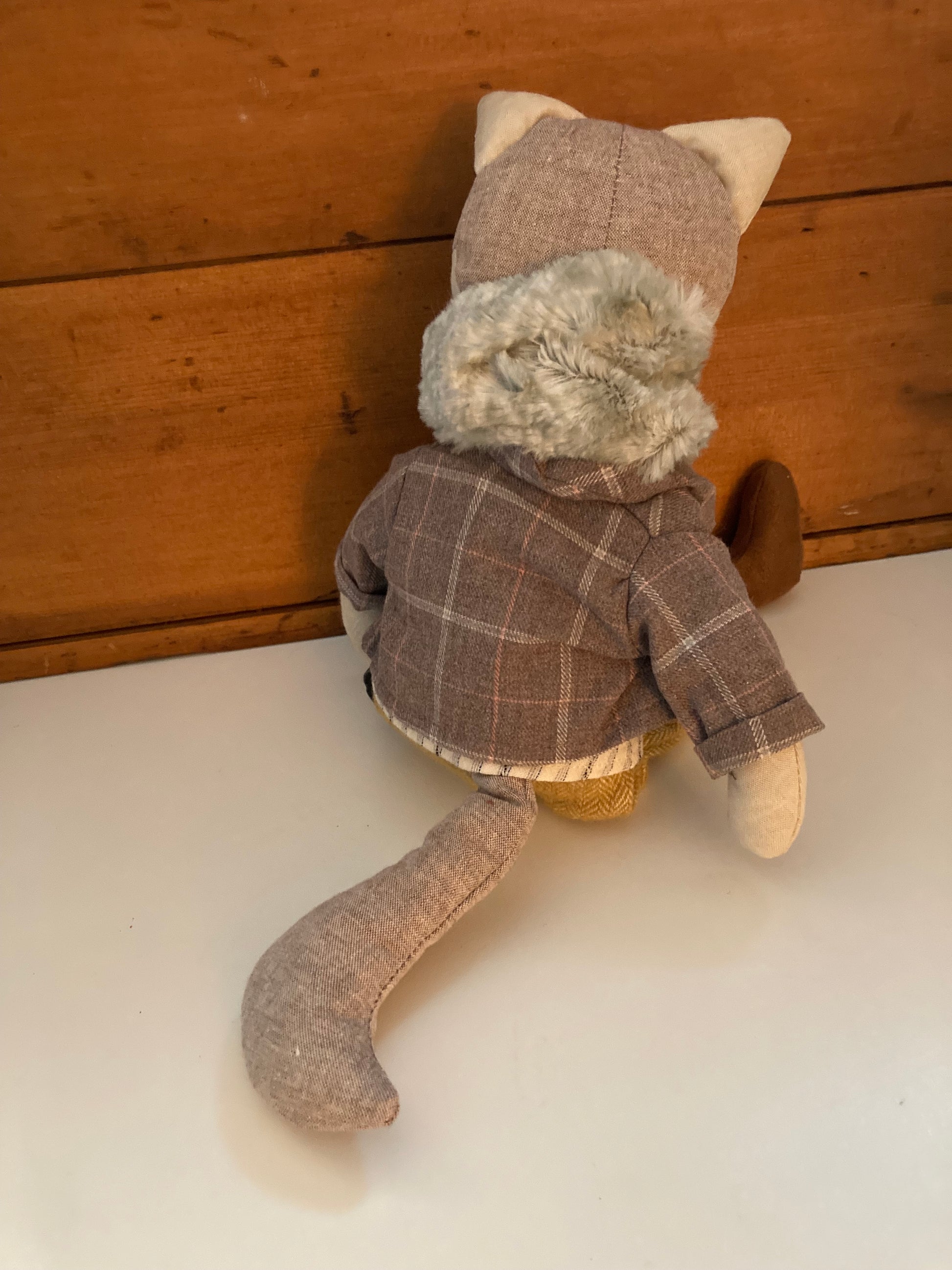 A lovely soft FOX RAG DOLL with a sweet, embroidered and printed face, a very chic velour scarf. Wearing soft brown slippers and nattily dressed in a very fashionable tweed wool blazer, and coordinating wool pants, vest and shirt. Ready to join the rest of the dance company.