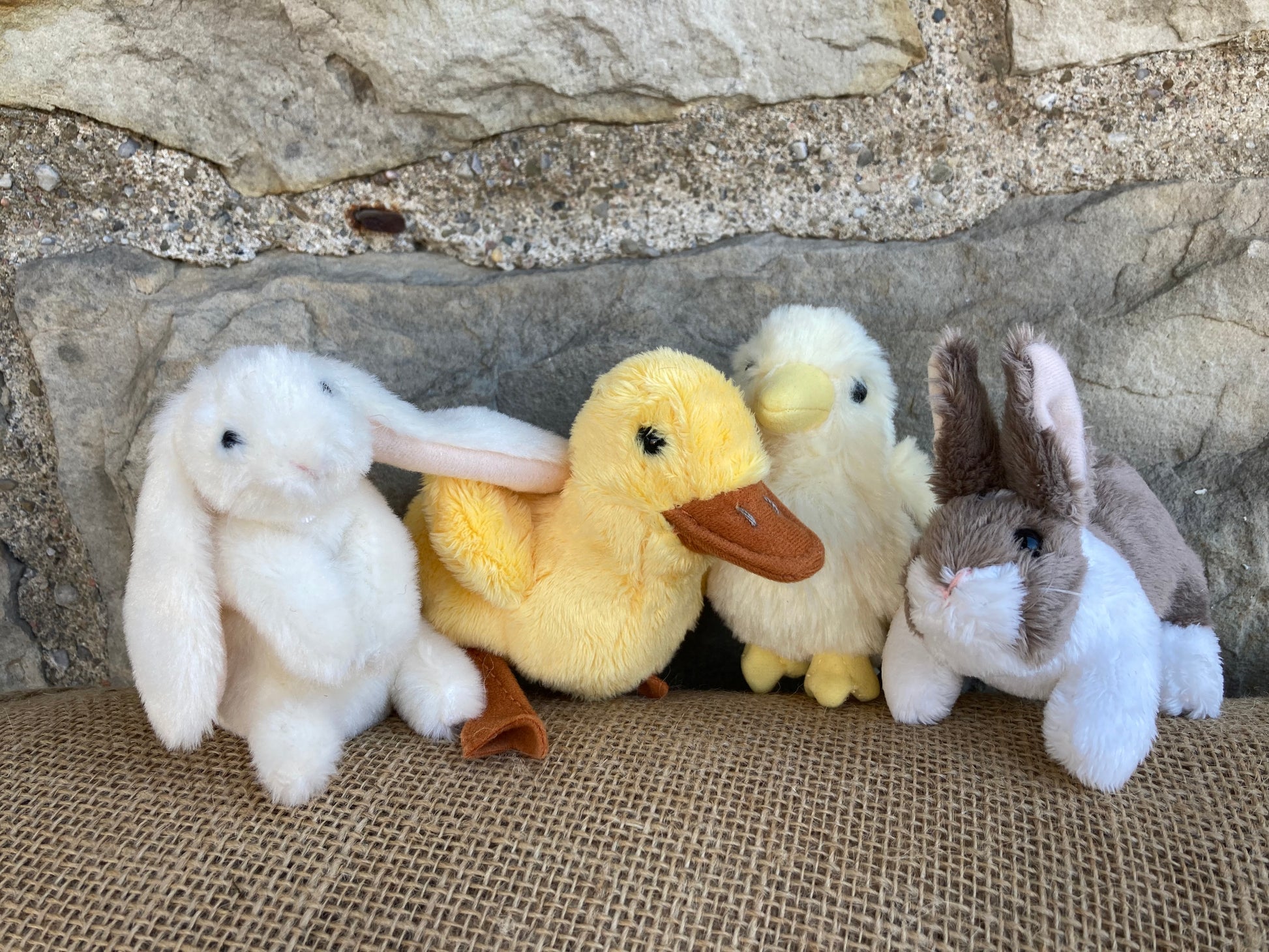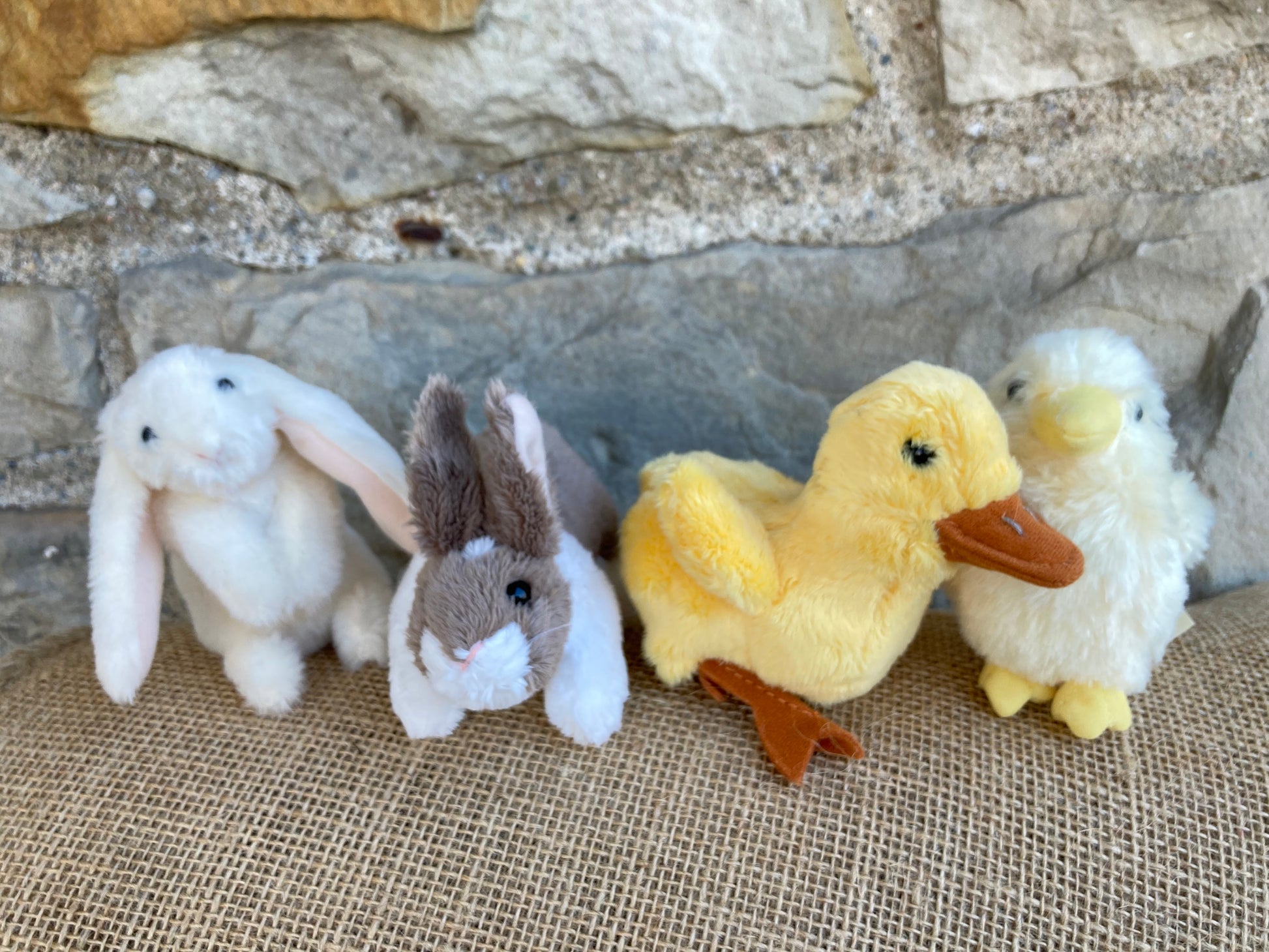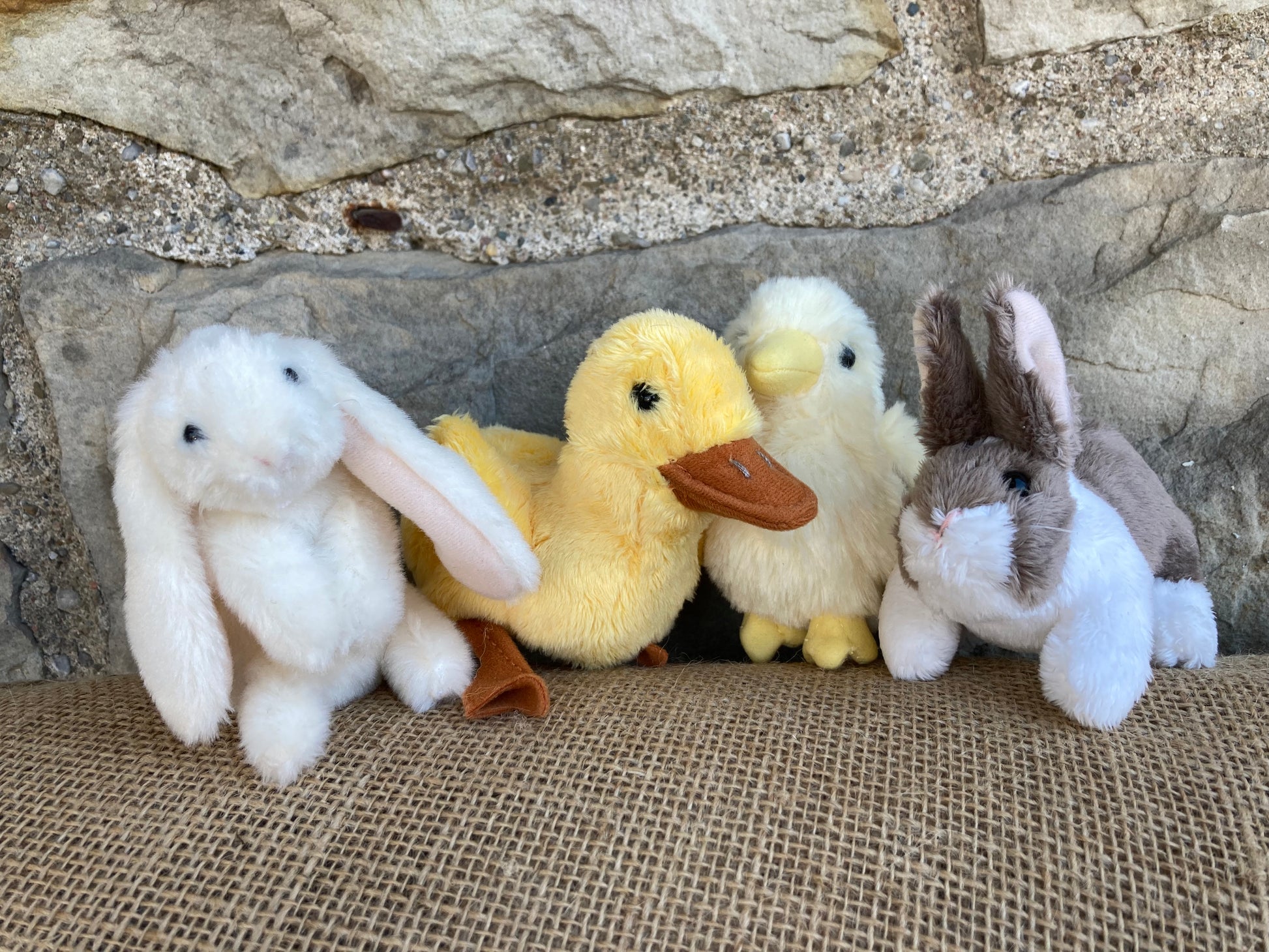 Your SPRING BABY ANIMALS: 4 Puppets. The mini DUCKLING. The mini BUNNY RABBIT. The mini CHICK. The mini LOP EAR RABBIT. This is a collection of sweet Baby Animals born in the Spring of the year. FUN FACT: Baby Chicks and Baby Ducklings, after hatching from their egg, think the first thing they see is their mother...even if it is a person! Mother Hens will quite happily raise a bunch of ducklings as their own!