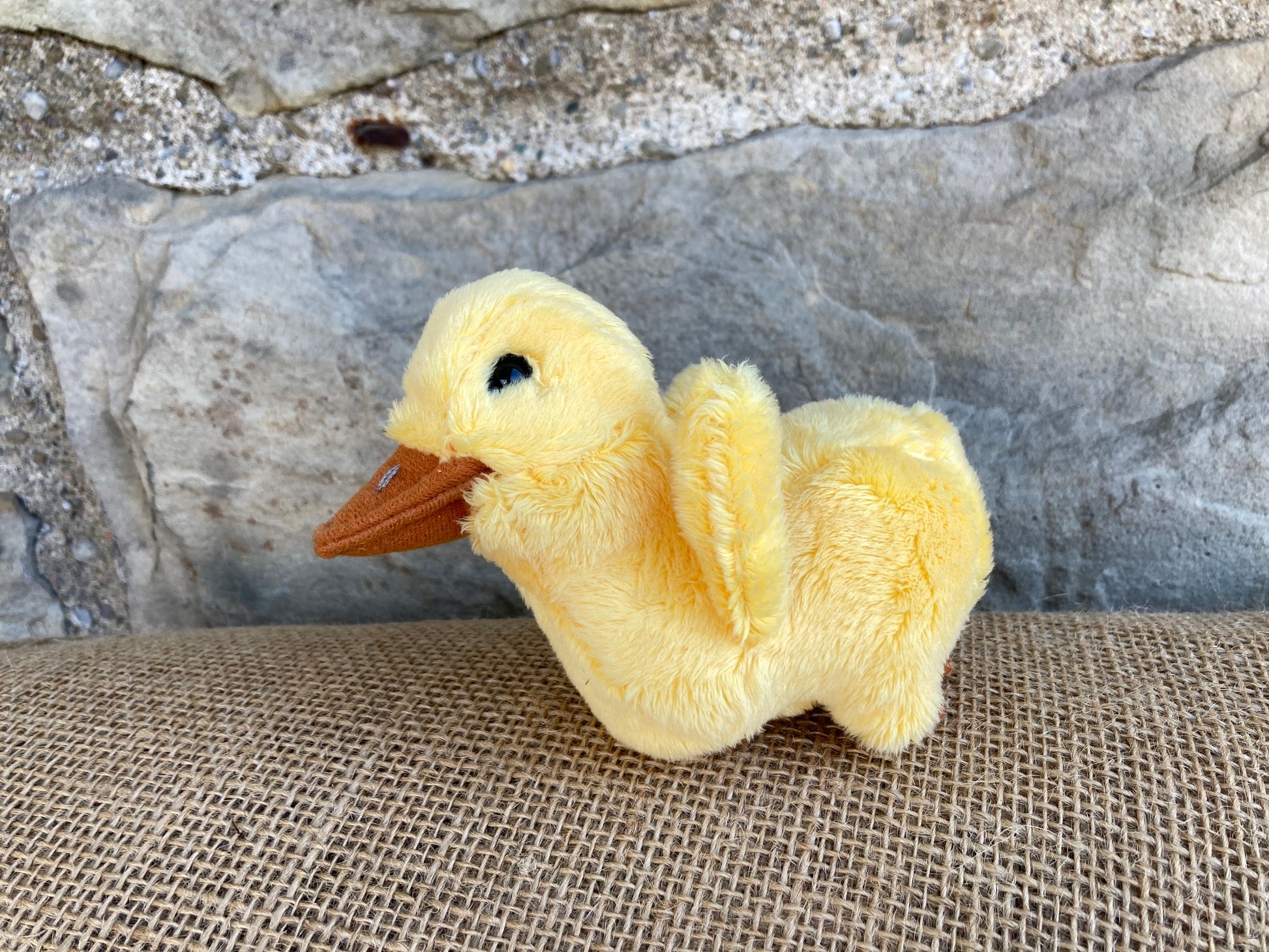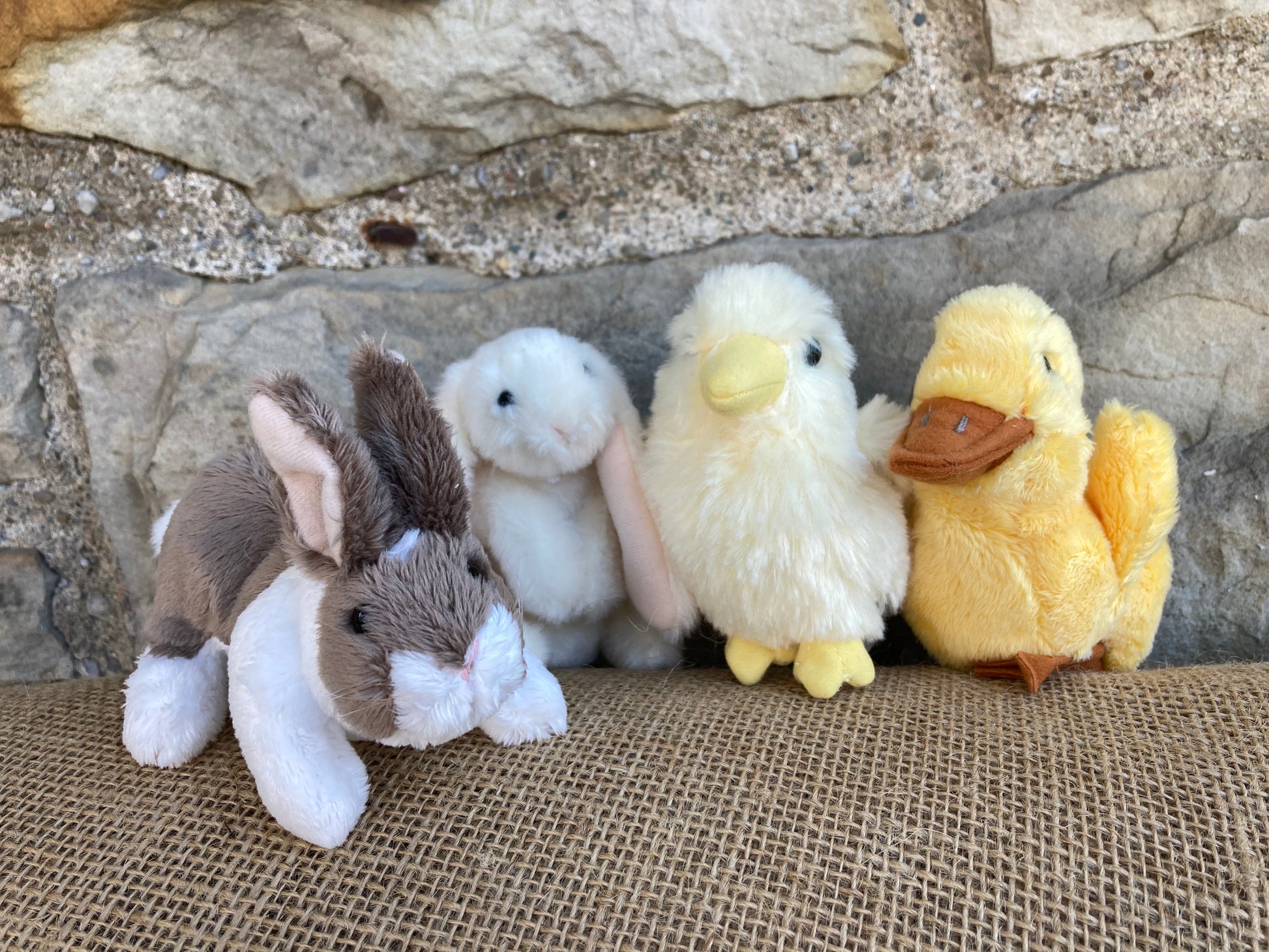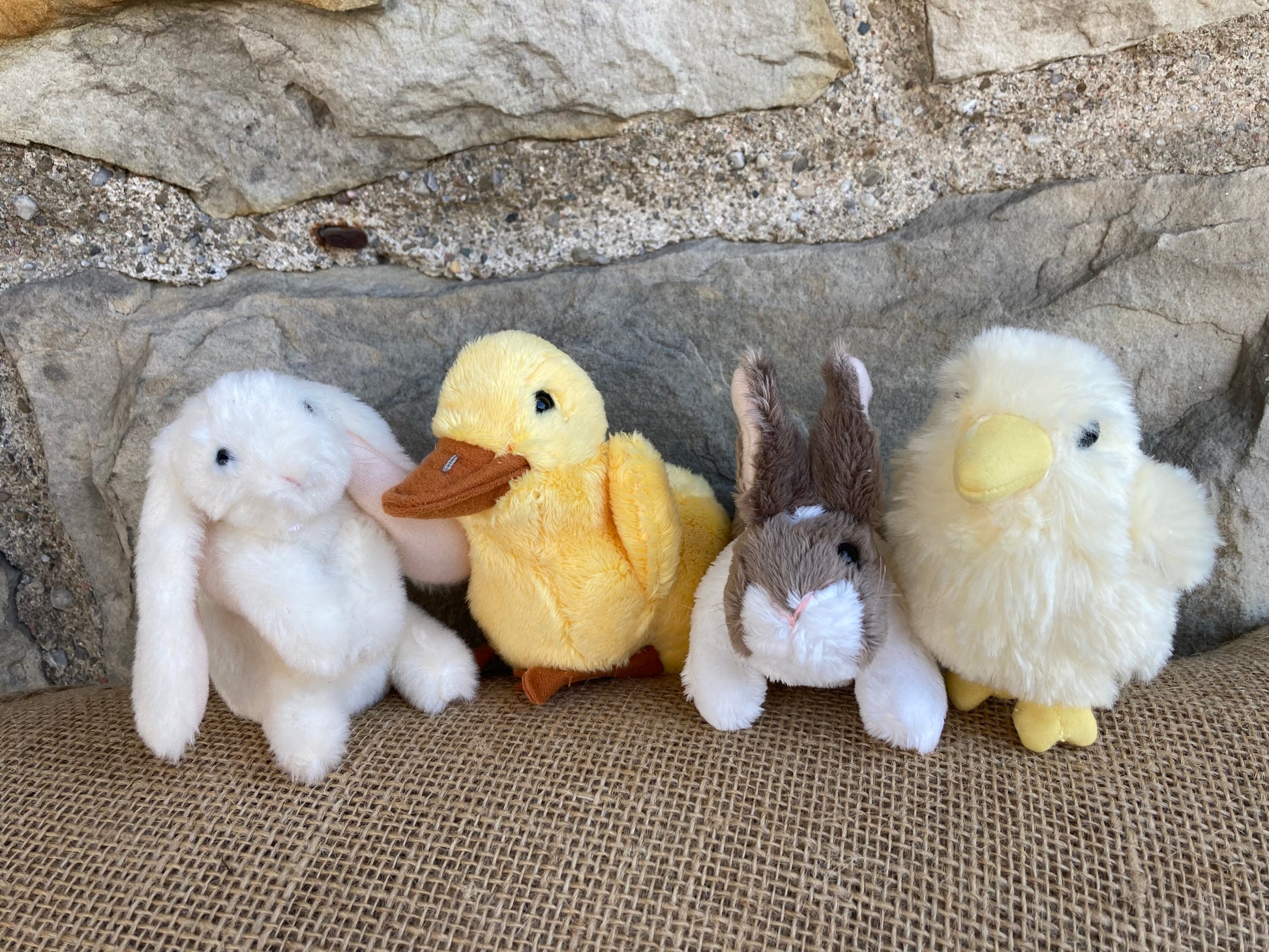 Your SPRING BABY ANIMALS: 4 Puppets. The mini DUCKLING. The mini BUNNY RABBIT. The mini CHICK. The mini LOP EAR RABBIT. This is a collection of sweet Baby Animals born in the Spring of the year. FUN FACT: Baby Chicks and Baby Ducklings, after hatching from their egg, think the first thing they see is their mother...even if it is a person! Mother Hens will quite happily raise a bunch of ducklings as their own!