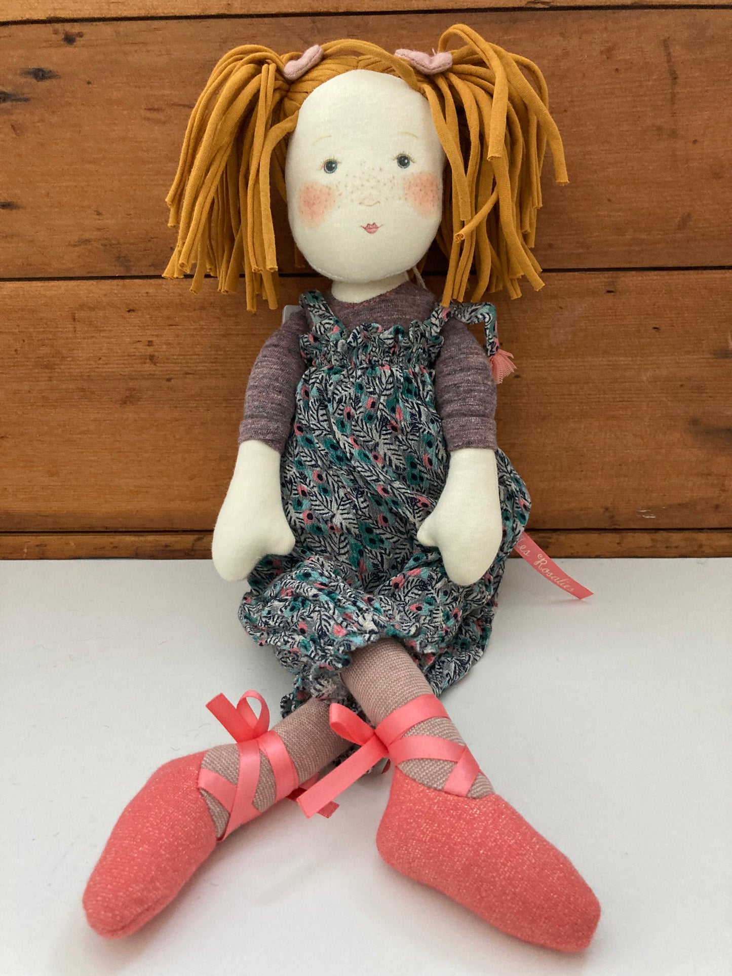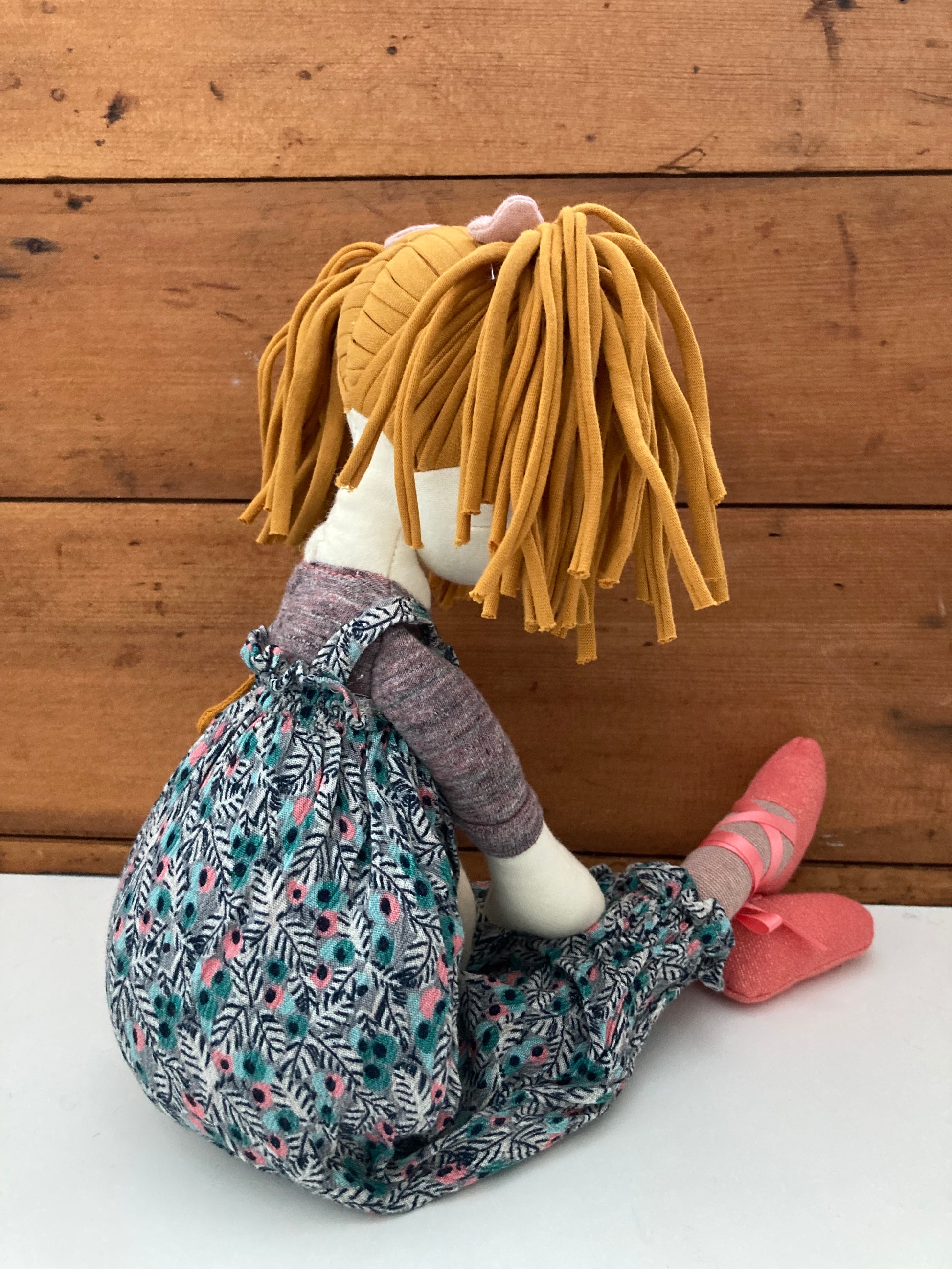 A lovely soft RAG DOLL with a sweet, illustrated and printed face, long blond hair in rolled jersey cord. Wearing satin ribboned ballet slippers and dressed in loose, light overalls in a gender neutral print, and a light purple turtleneck.