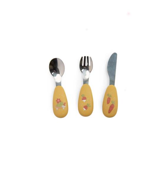 This sweet BABY CUTLERY SET Set of 3 stainless steel and silicone cutlery pieces offering the perfect grip for babies just learning to feed themselves, and toddlers wanting that independence at the table. They are beautifully illustrated in the colours of the Trois Petits Lapins collection.
