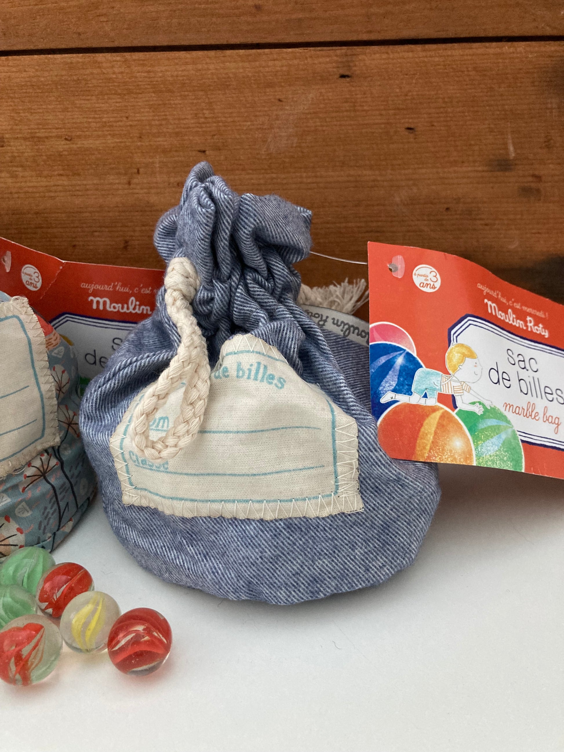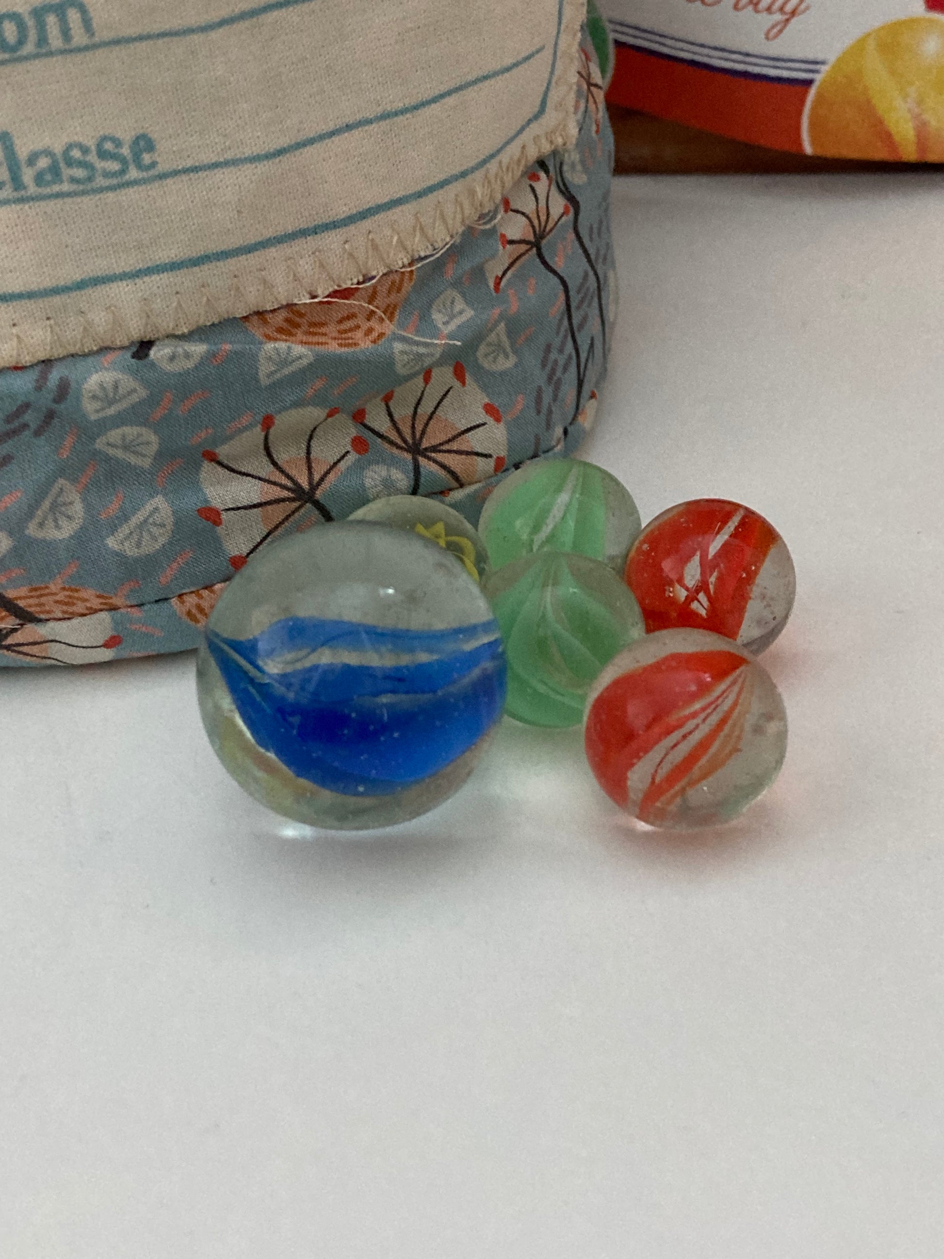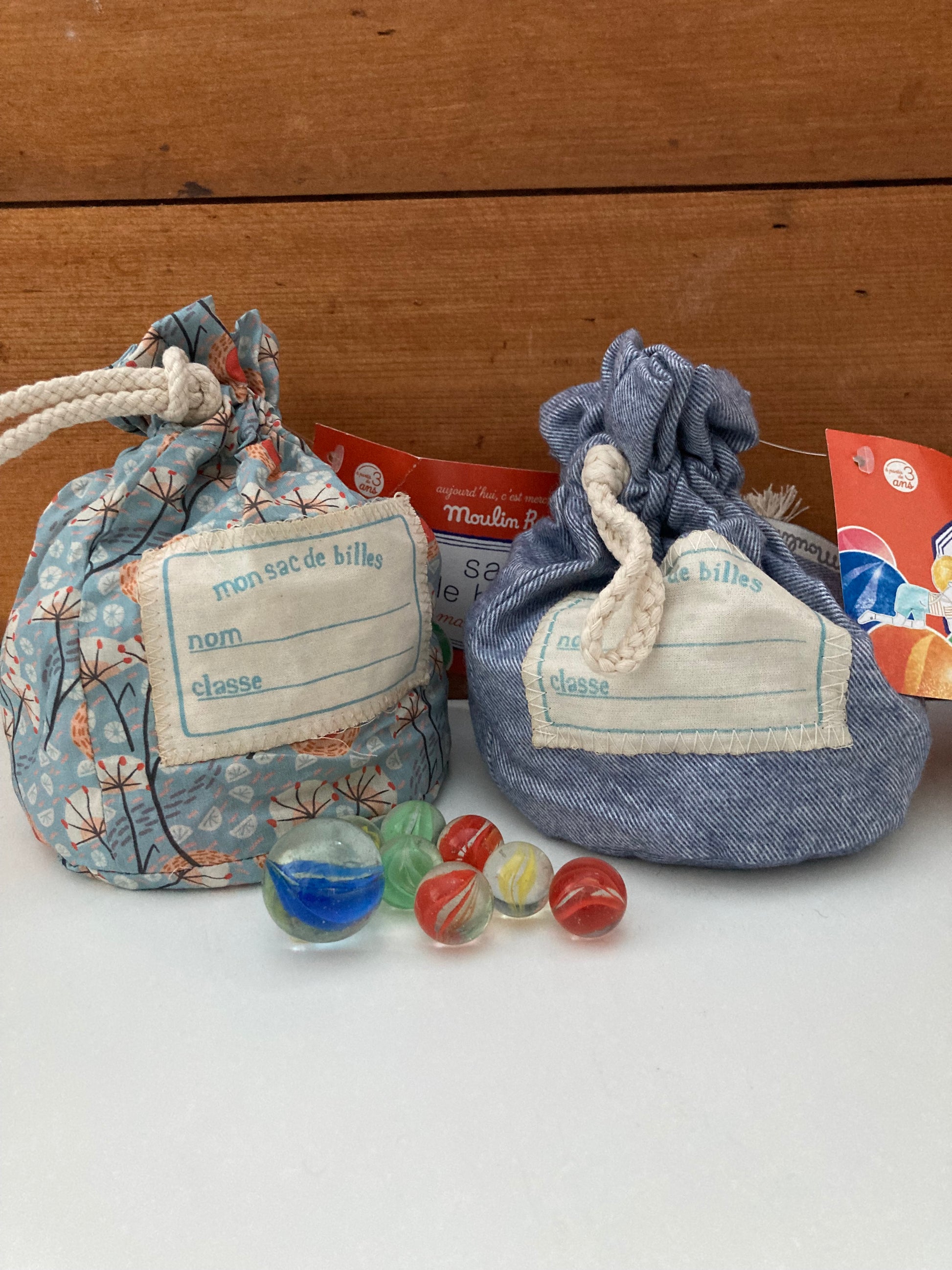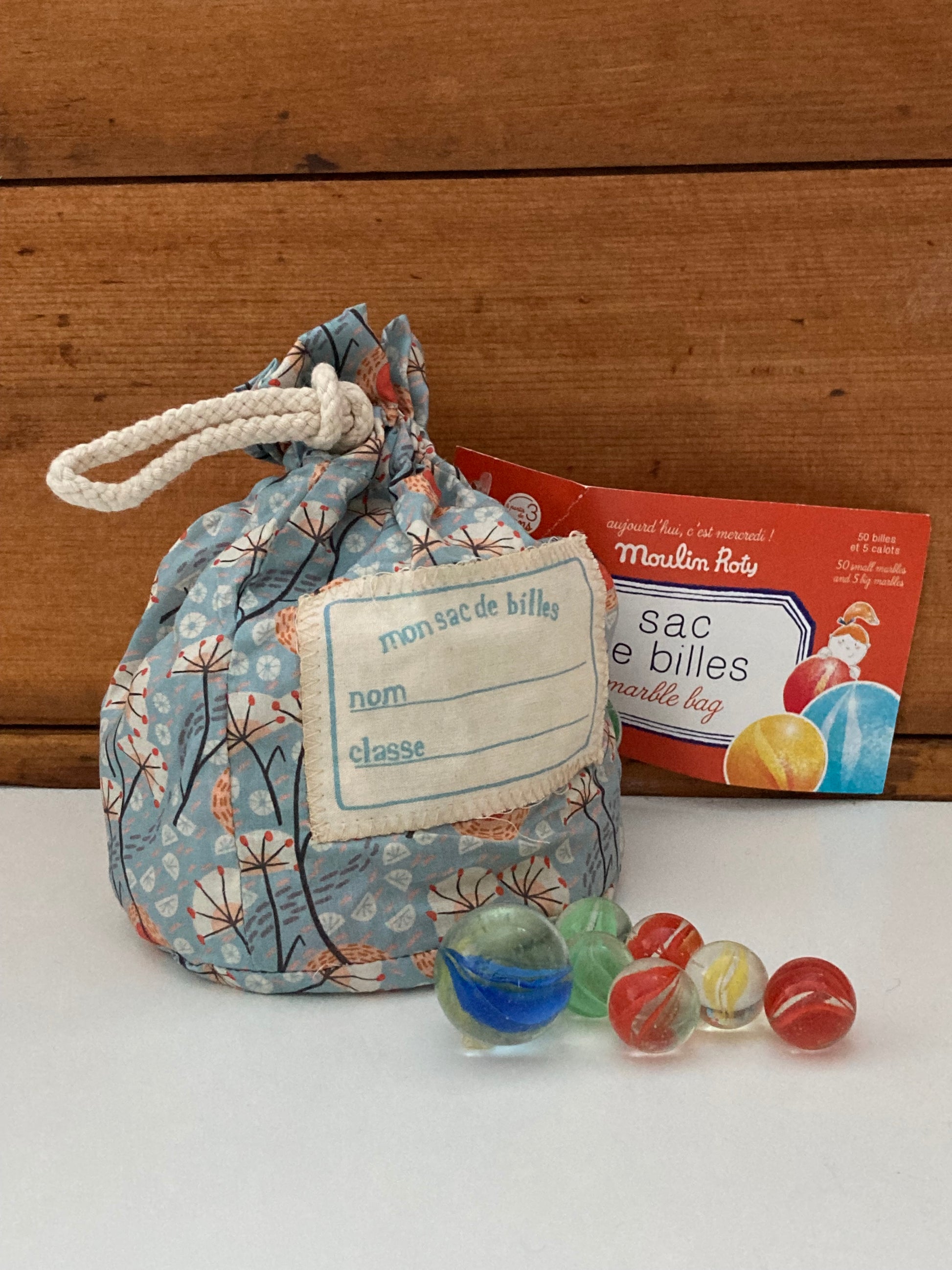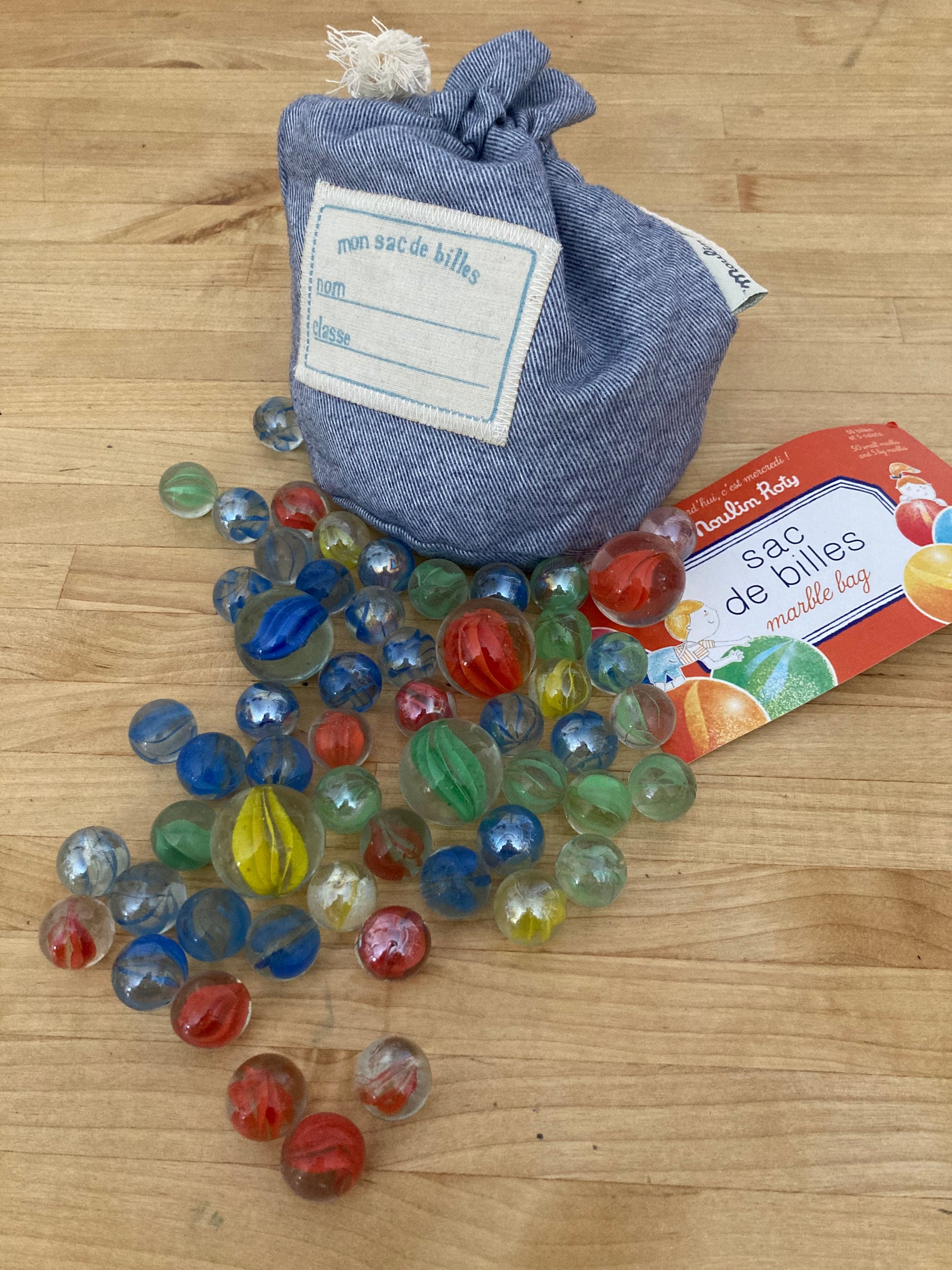 A bag of 50 SMALL GLASS MARBLES and 5 BIG GLASS MARBLES in a heavy cloth bag, with a drawstring, and handy name tag. NOTE: Colour of cotton bag will vary, as shown in photo.