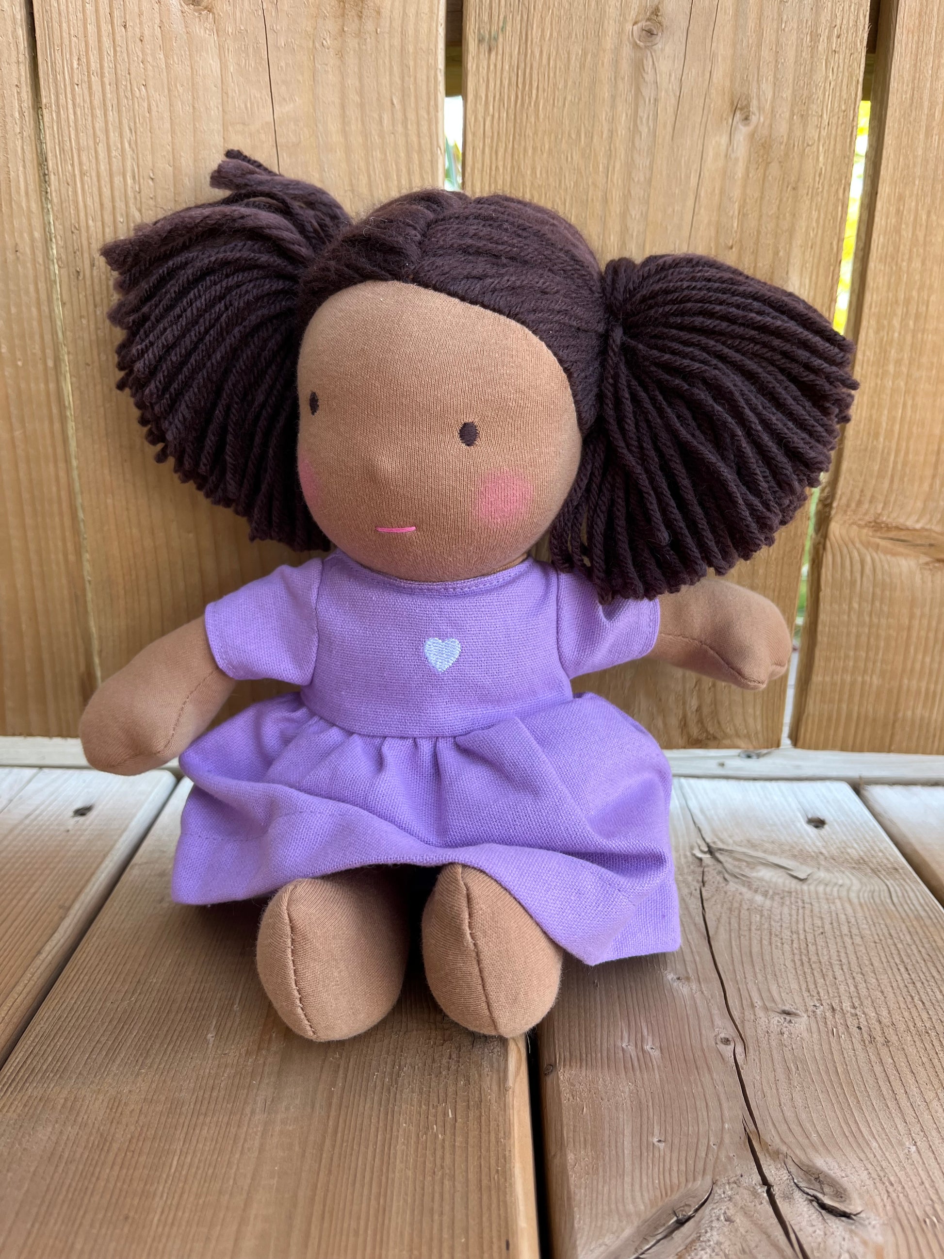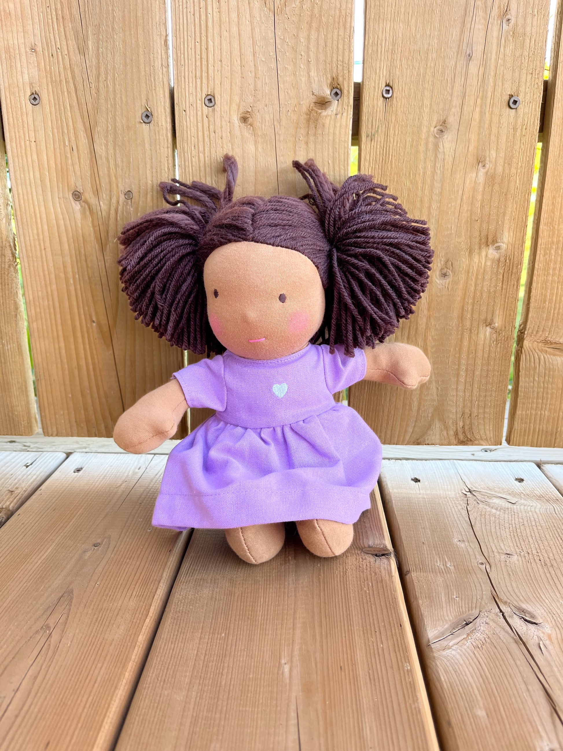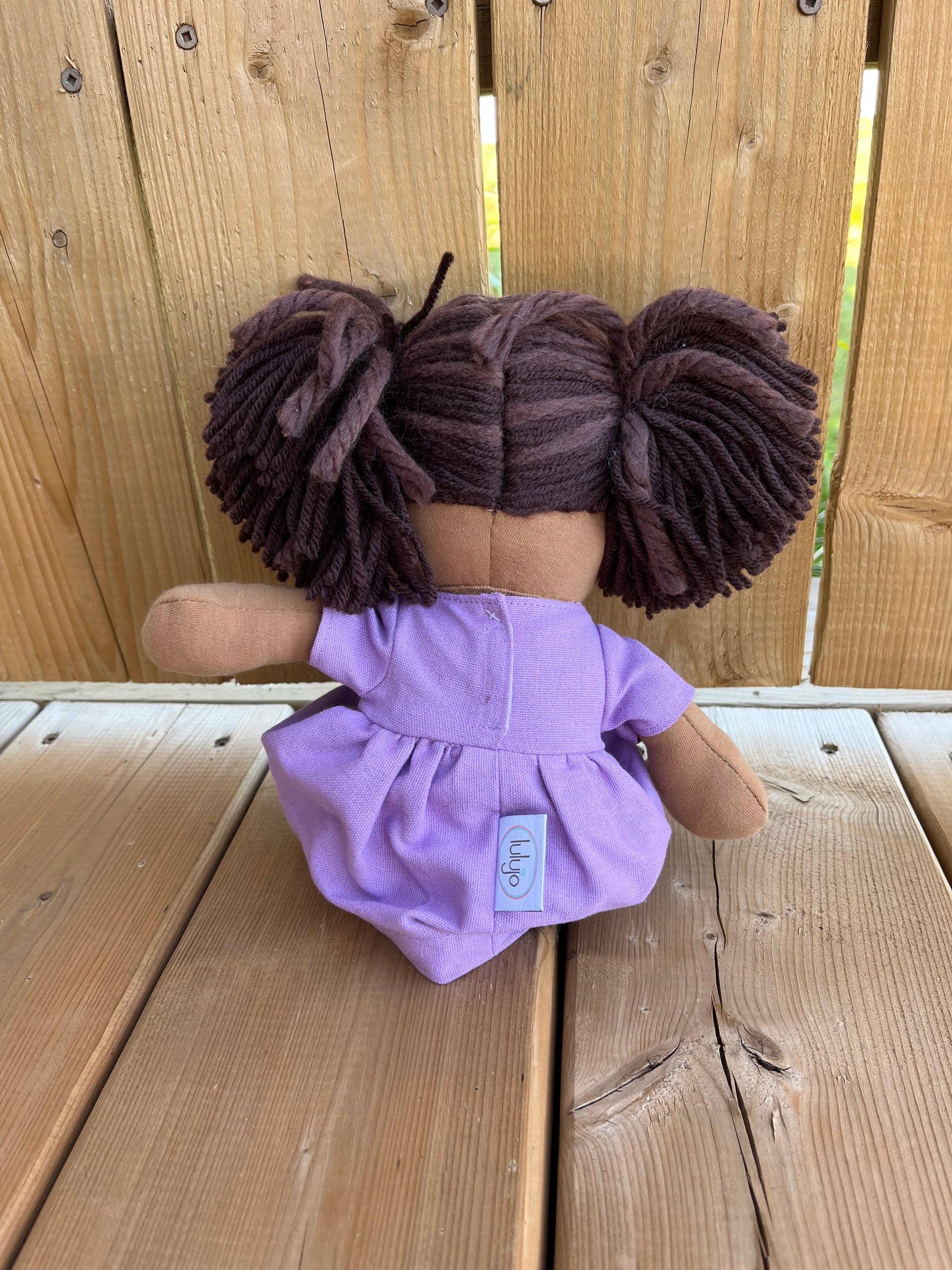 Lulujo Baby Waldorf Doll MIMI is wearing a light purple cotton dress.