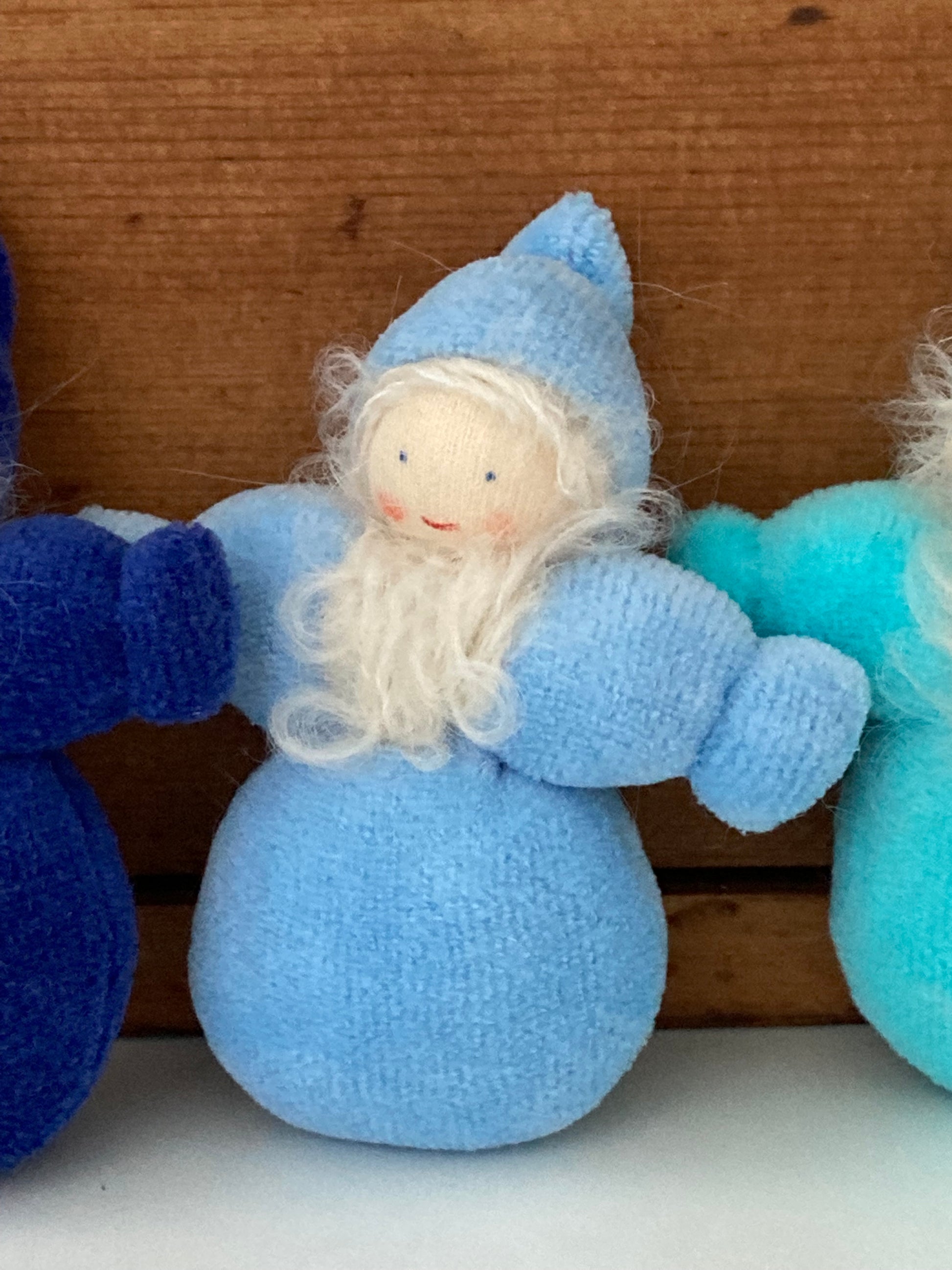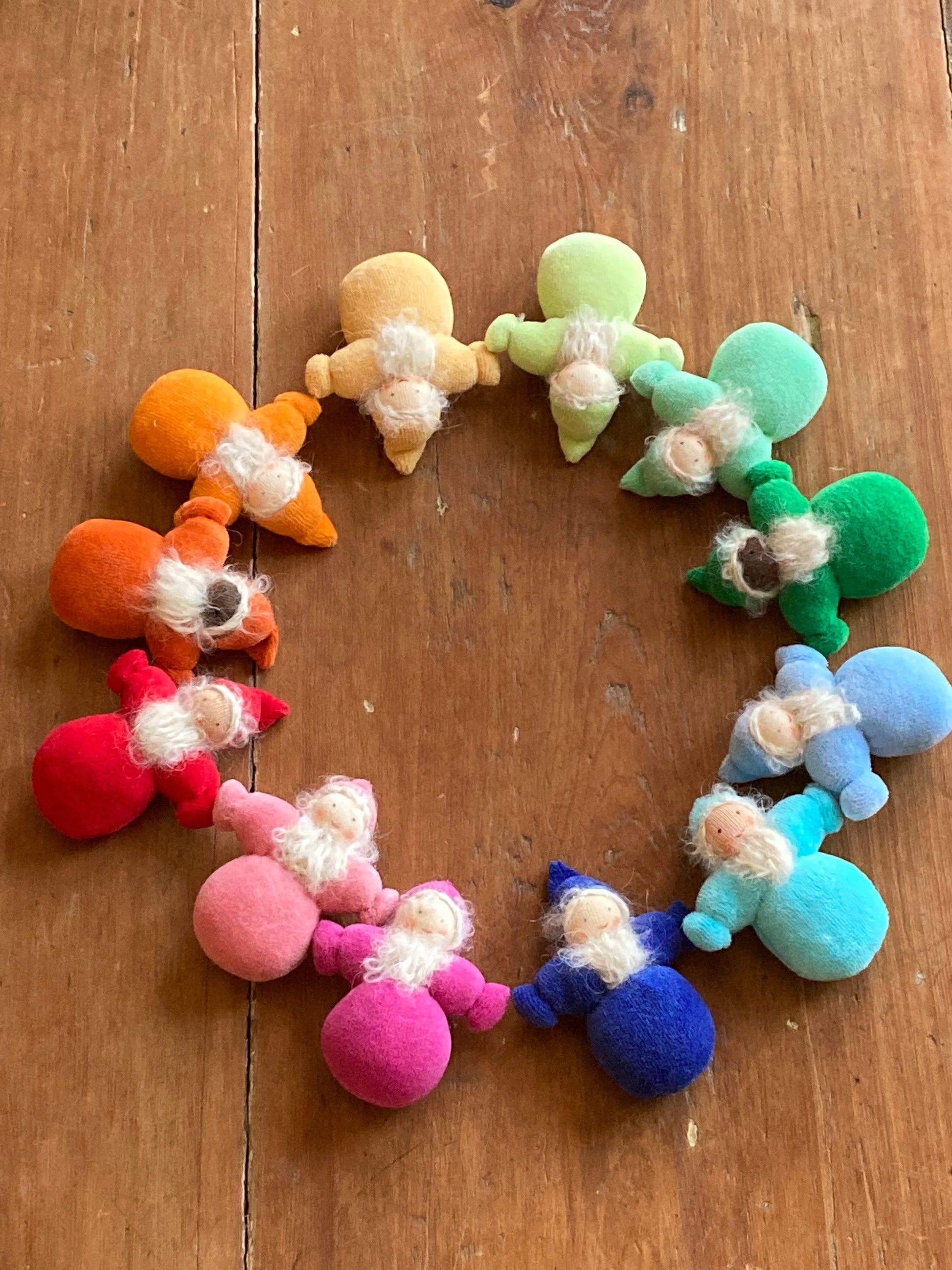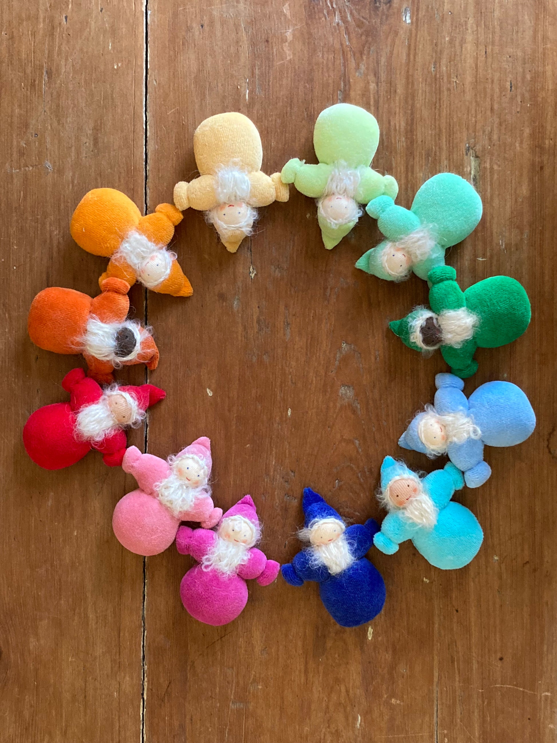 With their trademark, fuzzy beards, and soft velour bodies, in 12 lovely colour choices, all with pointed caps that are securely sewn in place. Safe for the littlest child to love. Stuffed with a natural clean wool fleece. Hair and Beards are also natural wool.