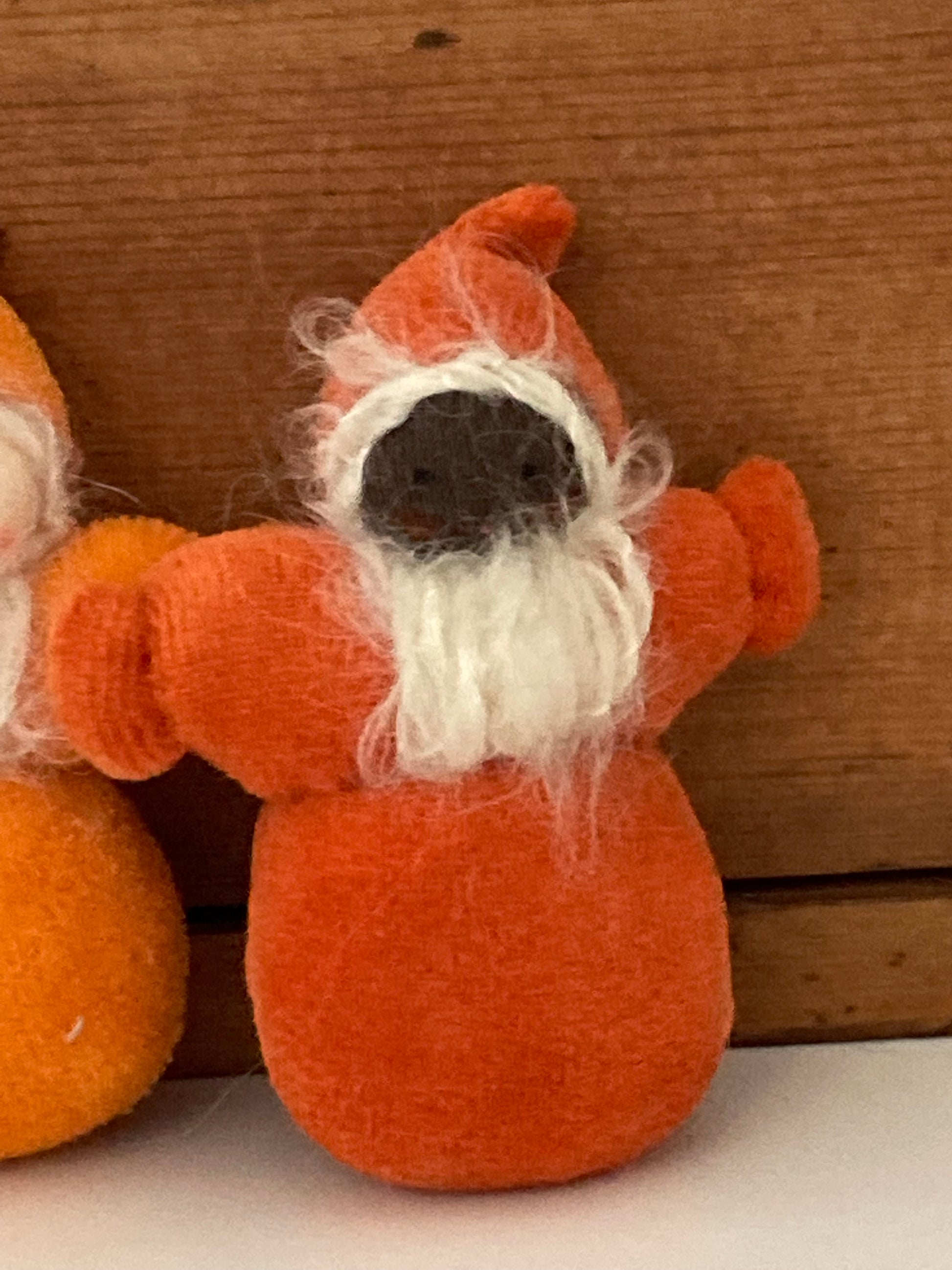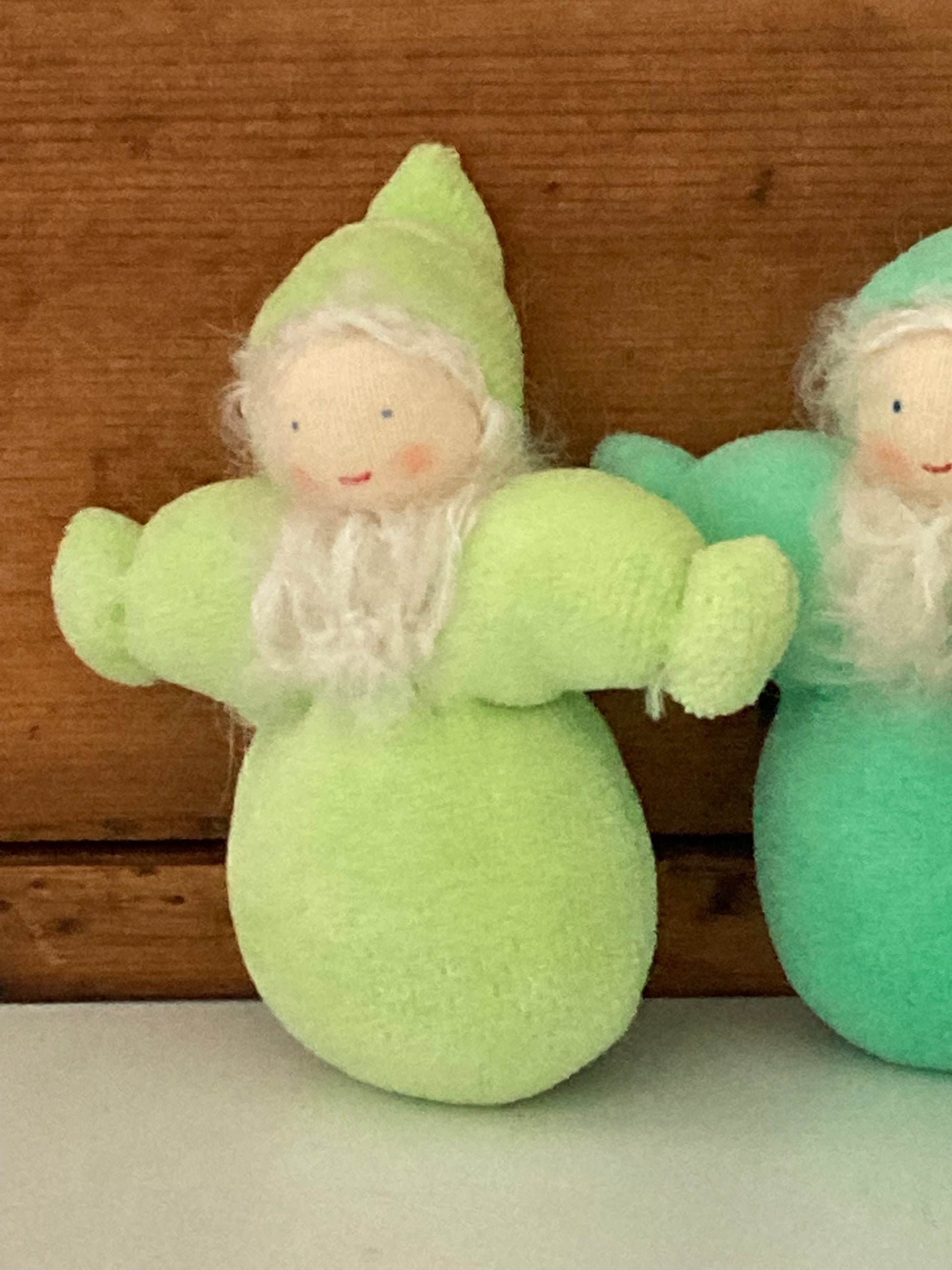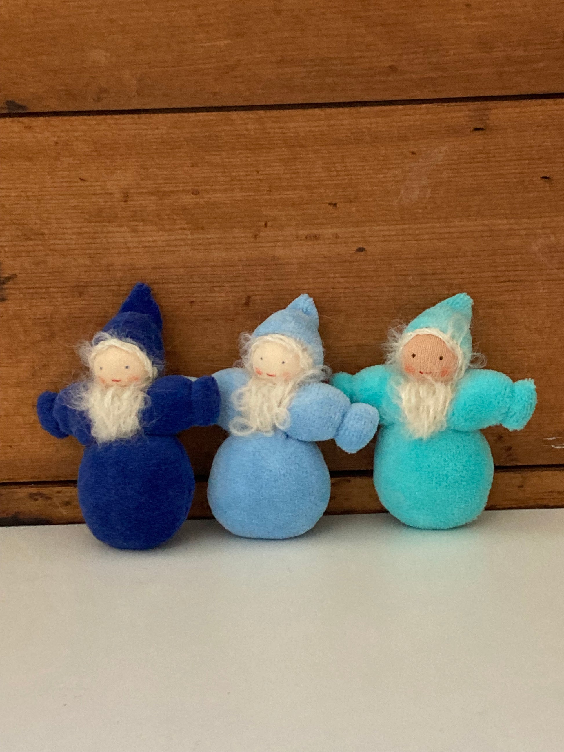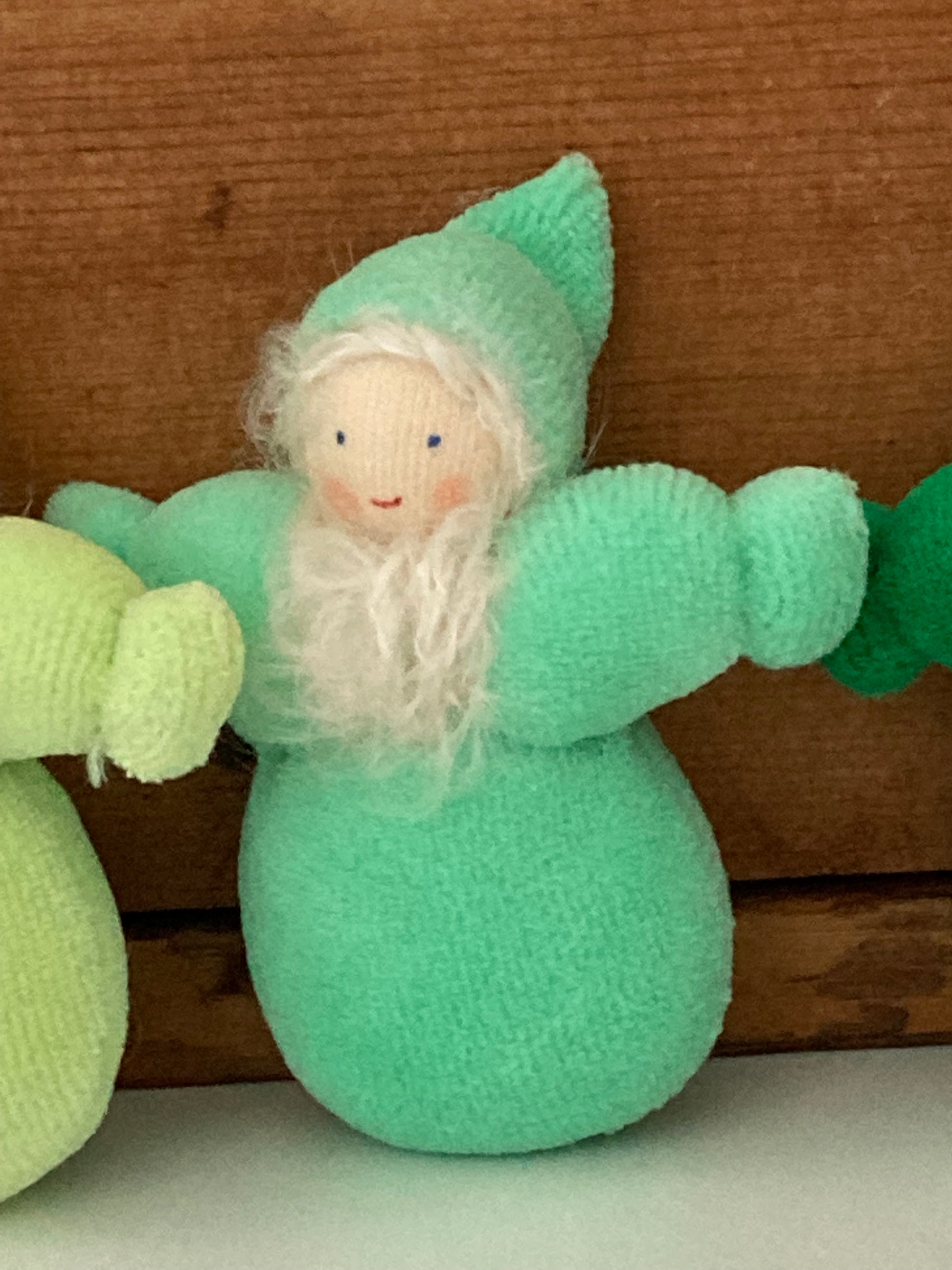 With their trademark, fuzzy beards, and soft velour bodies, in 12 lovely colour choices, all with pointed caps that are securely sewn in place. Safe for the littlest child to love. Stuffed with a natural clean wool fleece. Hair and Beards are also natural wool.