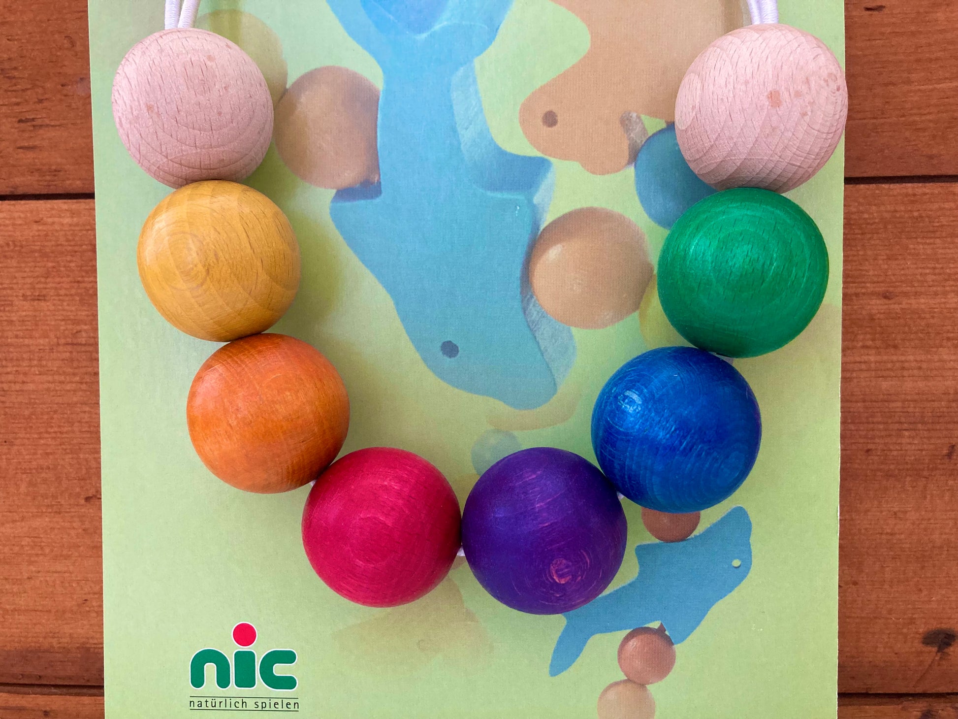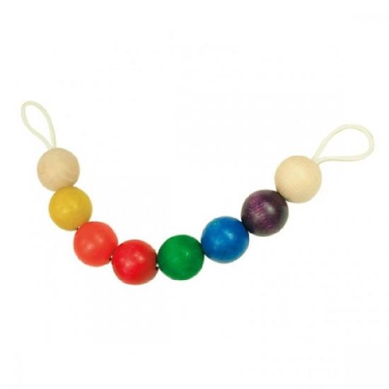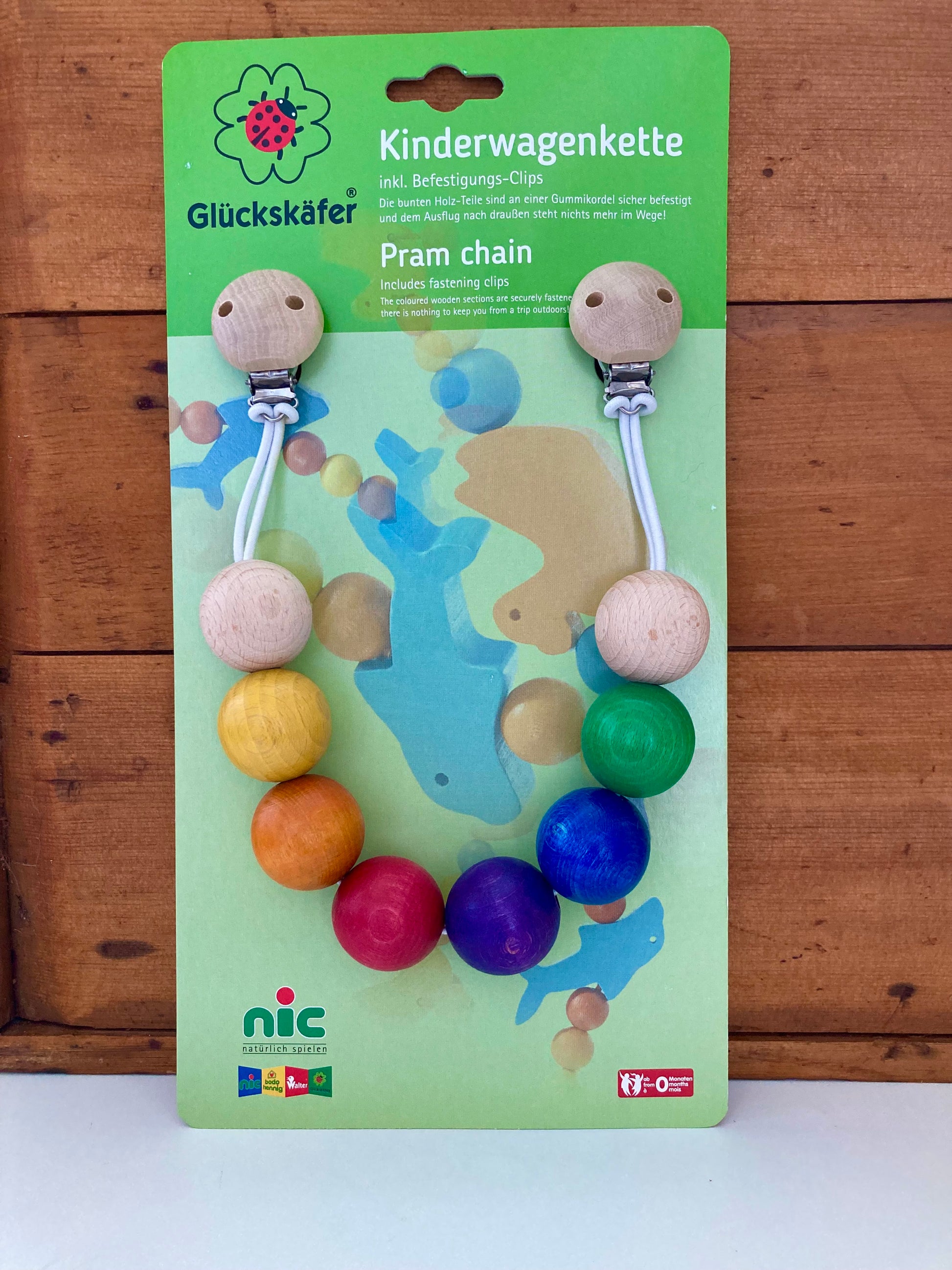 Lovely pram WOOD STROLLER CHAIN with Clips by Gluckskafer, has 8 big beautiful wooden balls in primary Rainbow colours. Measures approx 30cm long.