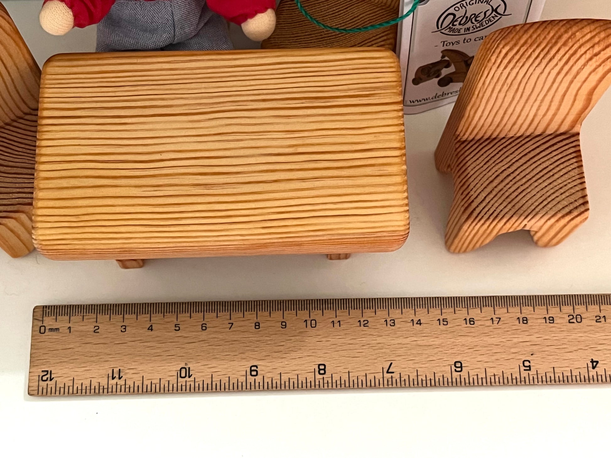 The wooden table measures 13x7x6cm (5x3x2,5 inches).