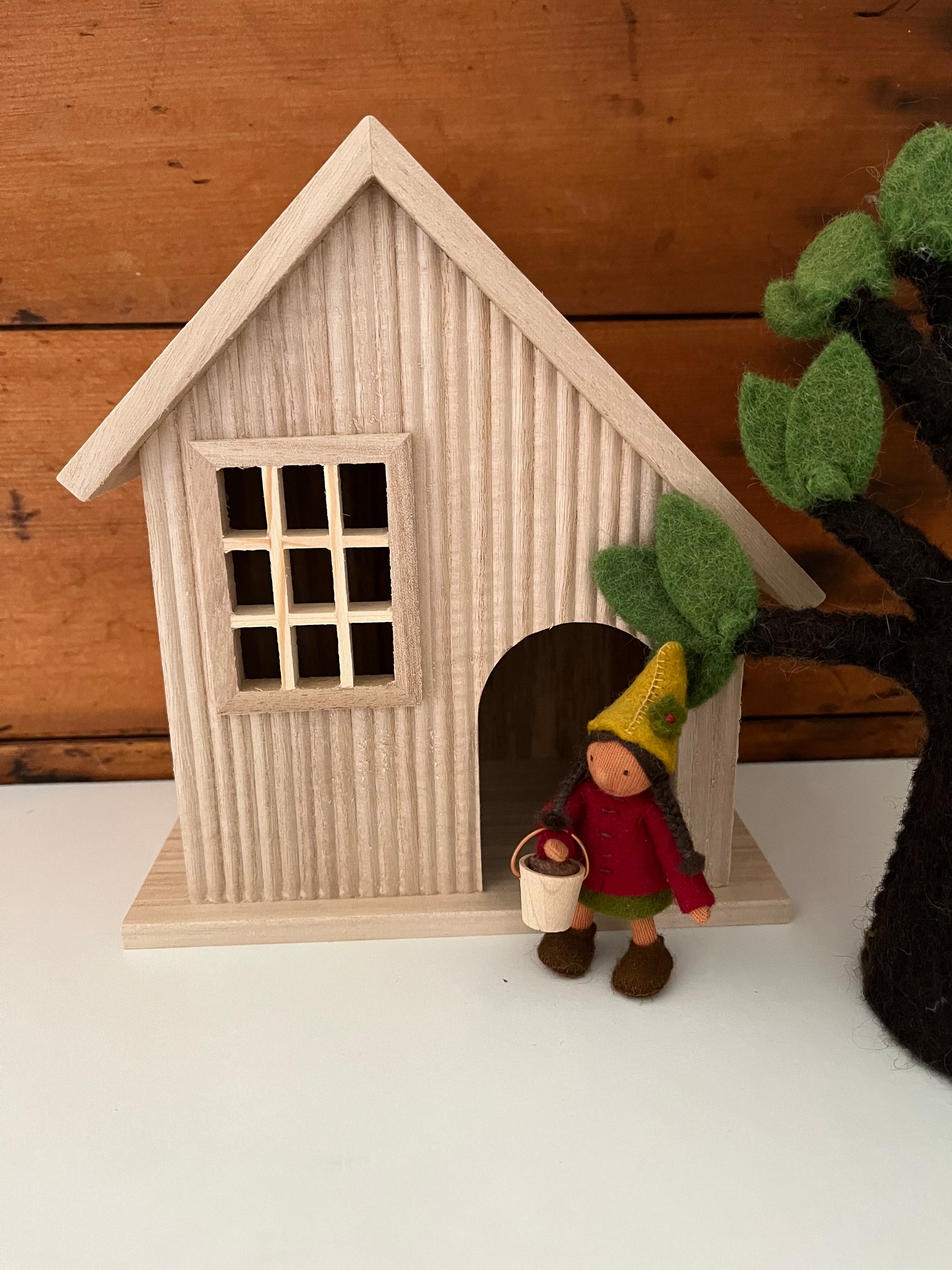 This magical little gnome house is made from Pauwlonia, a light weight wood. Ideal for older children, as it will not withstand the rougher play of unsupervised toddlers!