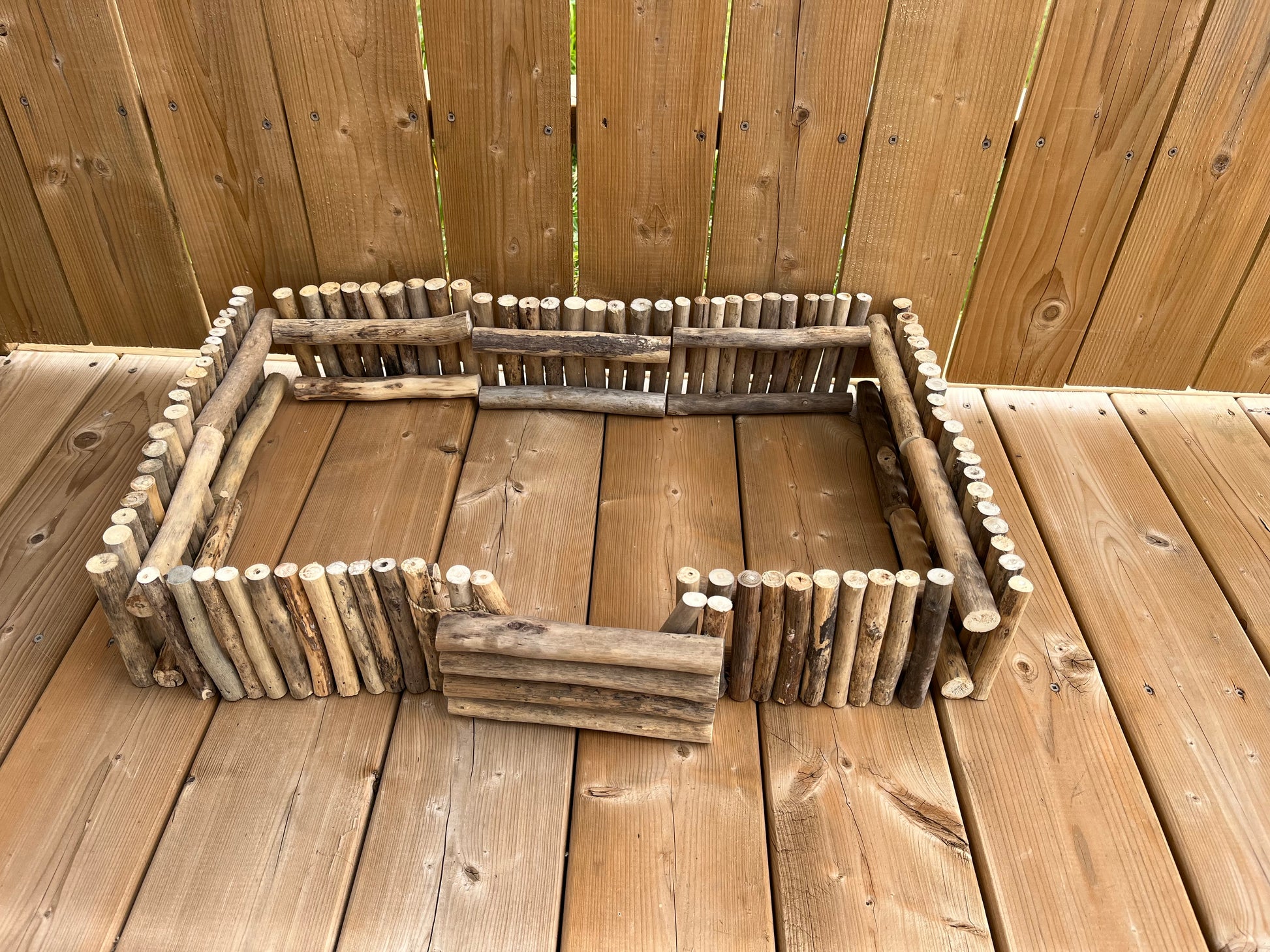 Natural wood variations in each set. Wood branches used for each fence section are different too! Attached string can be used to secure the gate section closed, if you wish.