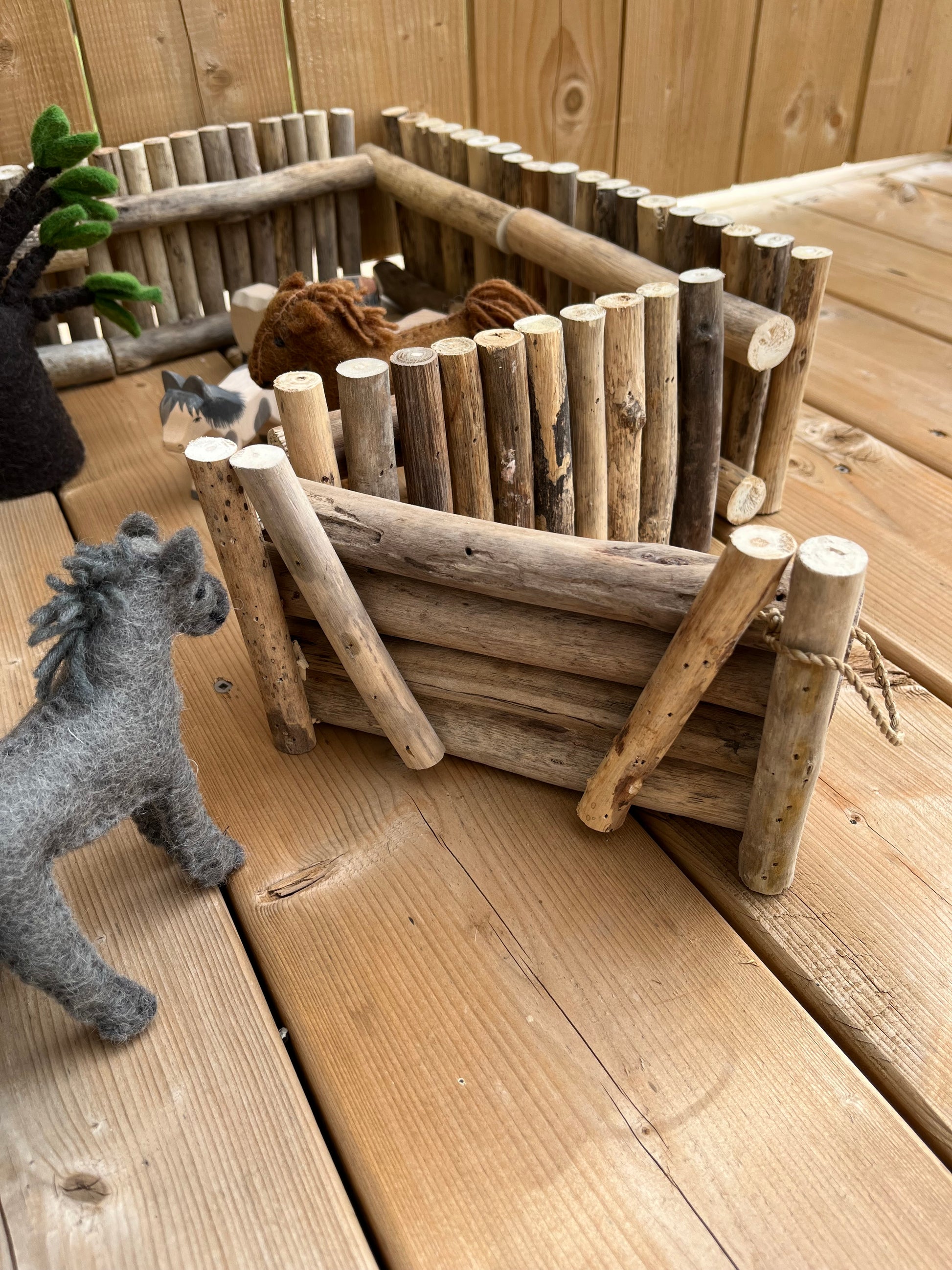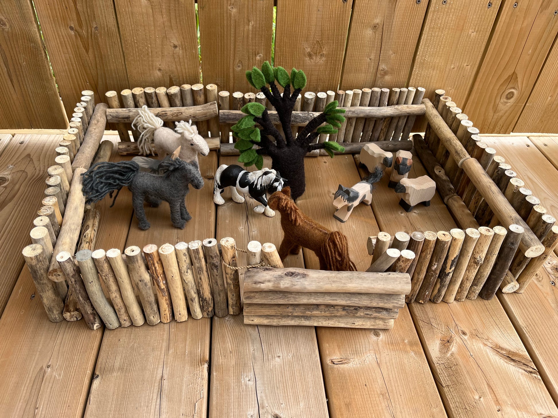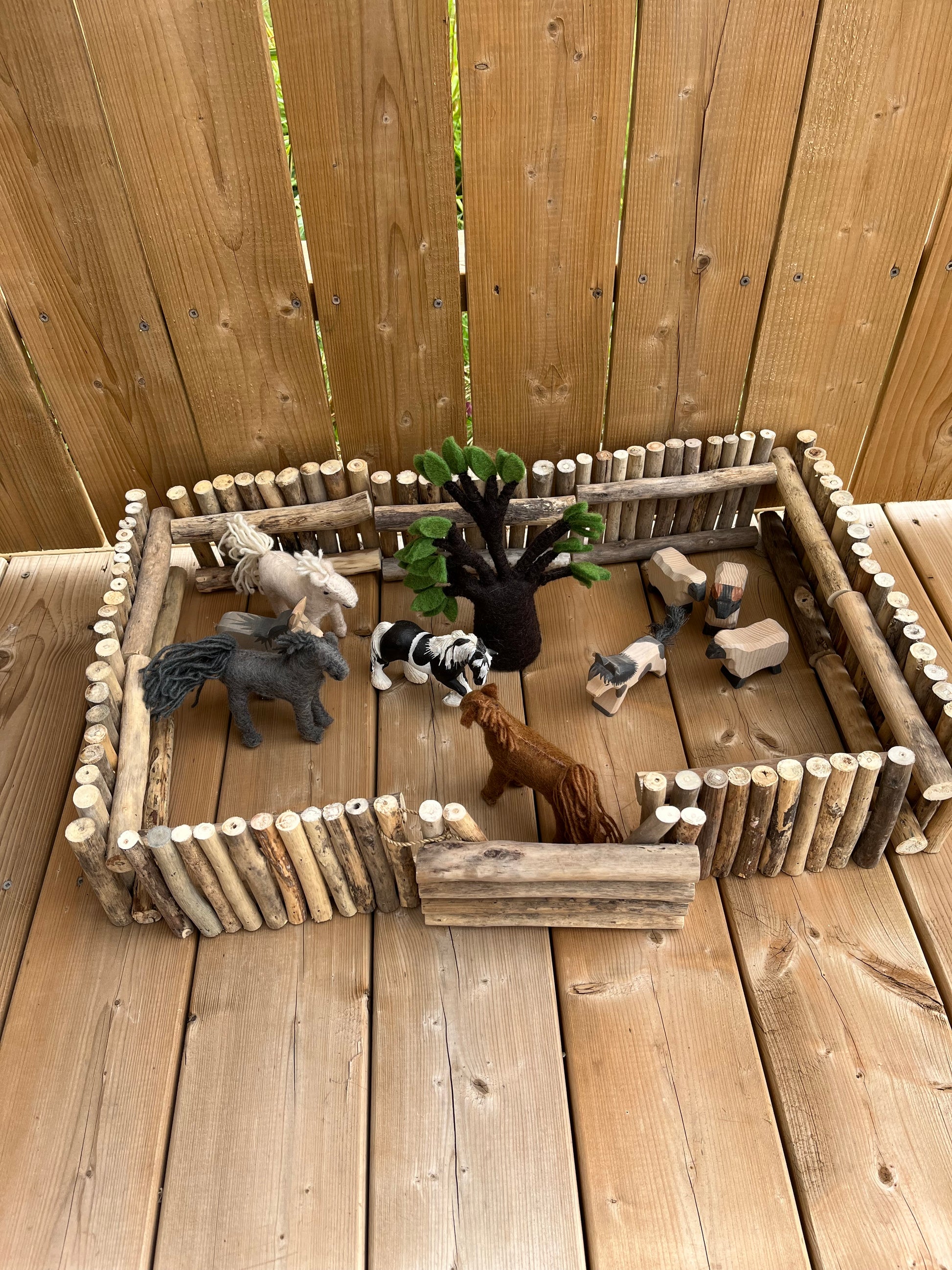 Each FENCE SECTION is made up of real wood, lightweight small branches, securely glued together, with two horizontal supports, that make each section free-standing... and movable. Enough fence sections to make smaller paddocks... Limitless free play awaits!