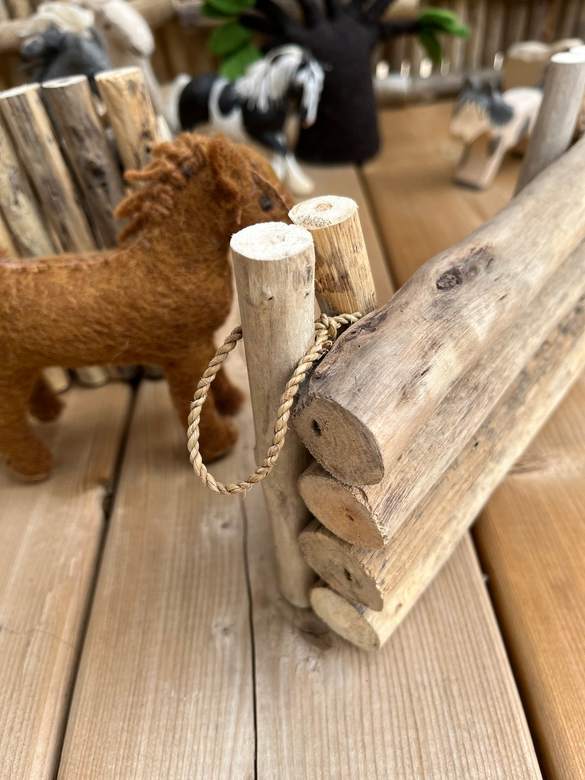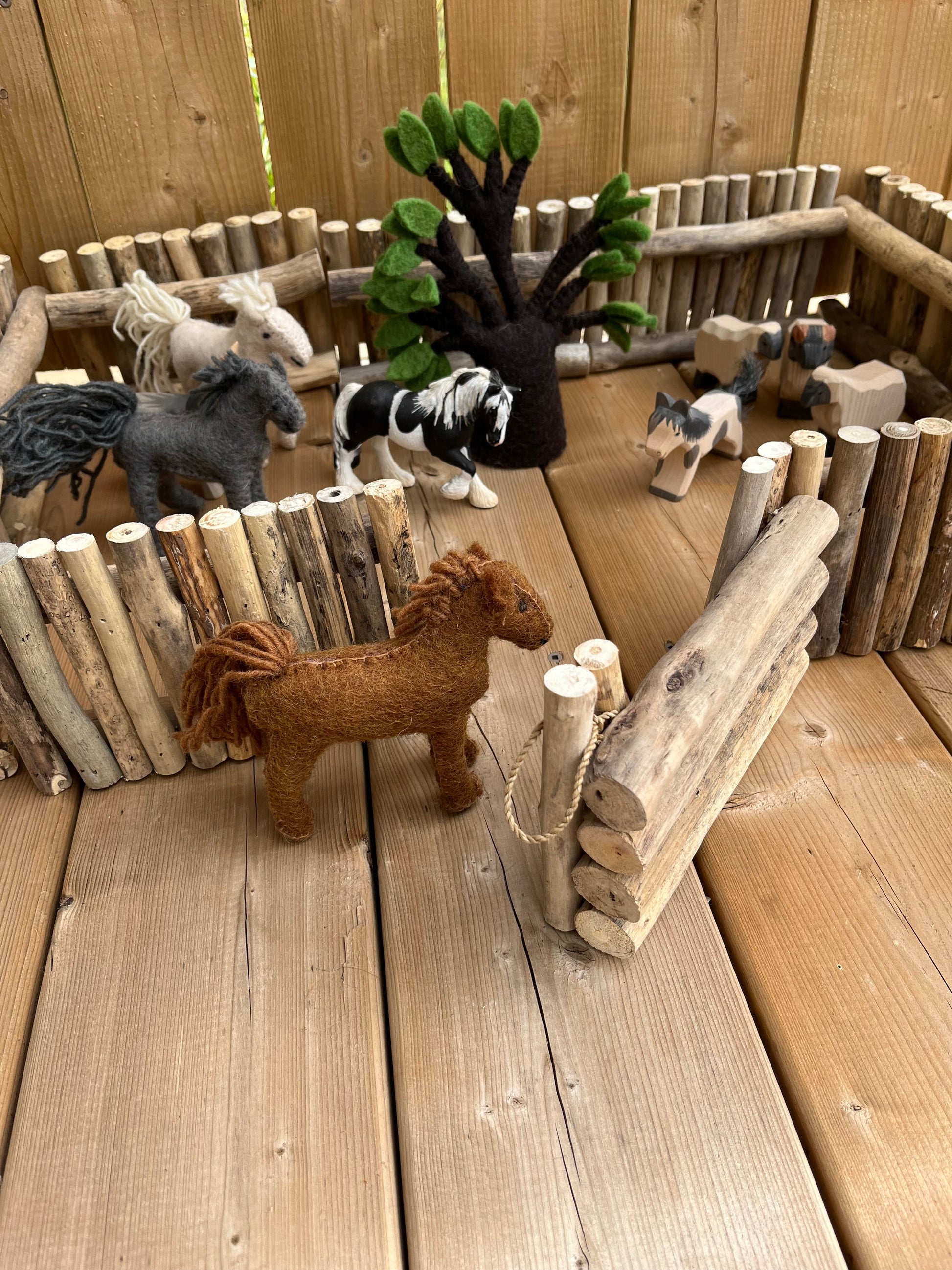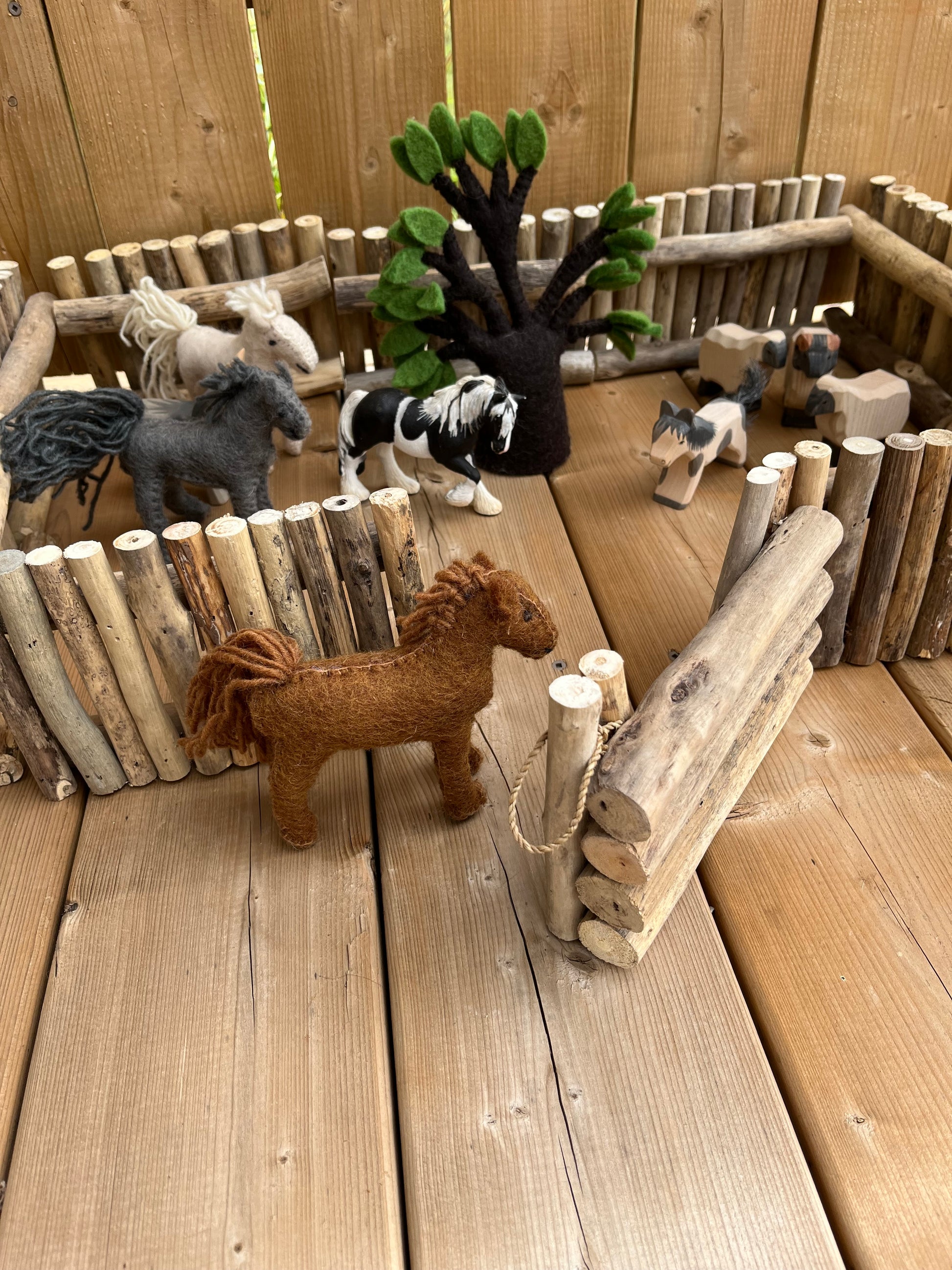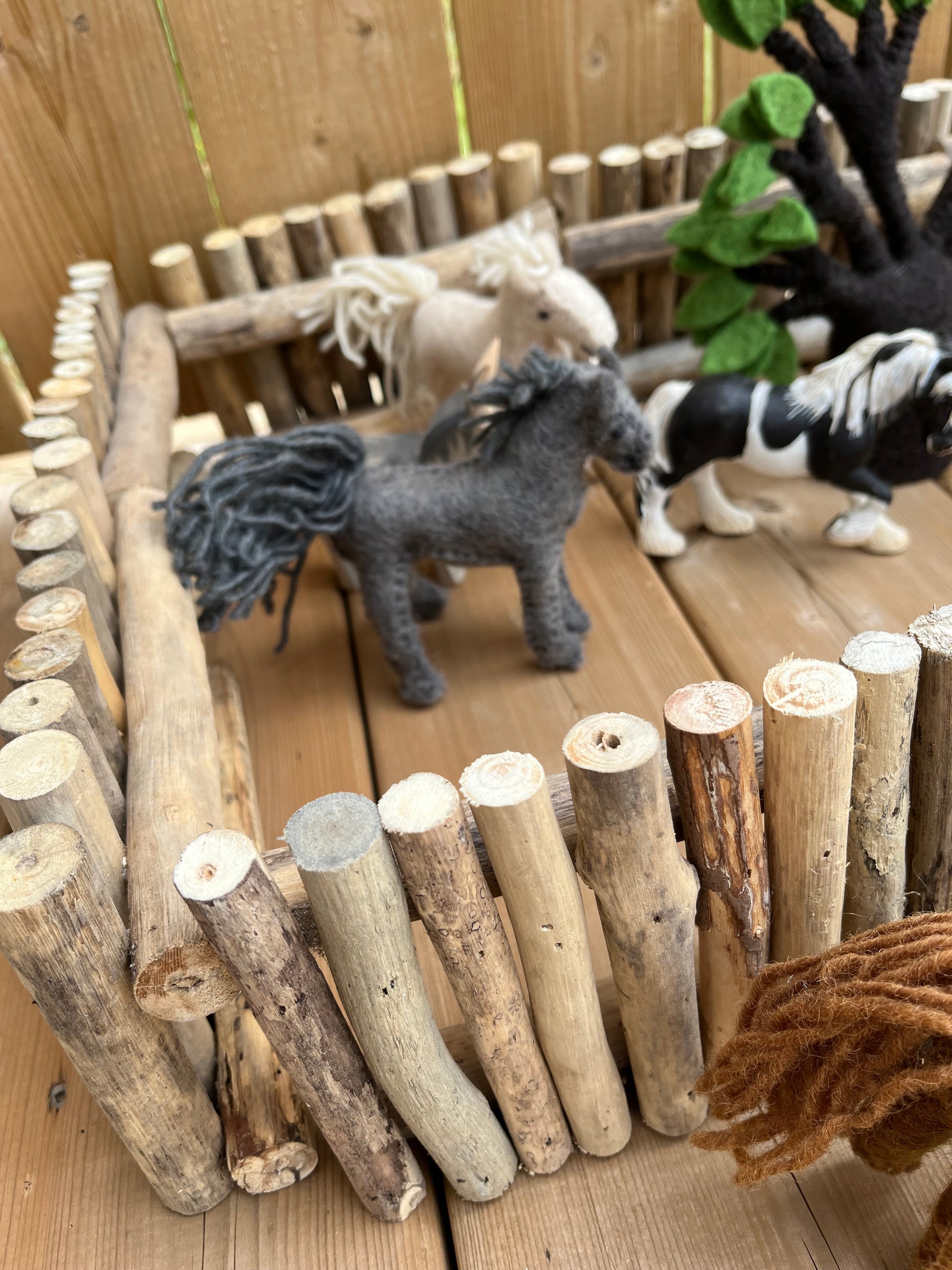 Each FENCE SECTION is made up of real wood, lightweight small branches, securely glued together, with two horizontal supports, that make each section free-standing... and movable. Enough fence sections to make smaller paddocks... Limitless free play awaits!