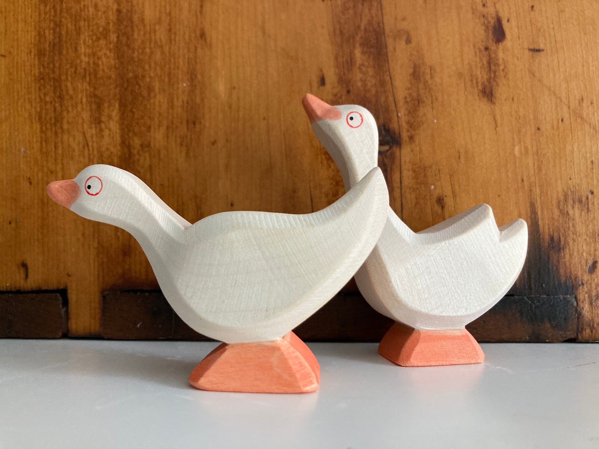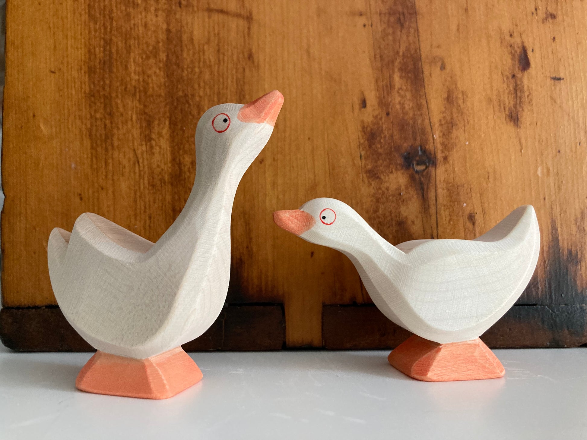 These are their farmyard figures, GOOSE HEAD HIGH and GOOSE STANDING. Each is 8x5cm (3x2inches) long. Like all Ostheimer collectable figures, they are hand-carved from a solid piece of wood, and then hand painted. To last a Childhood of play.