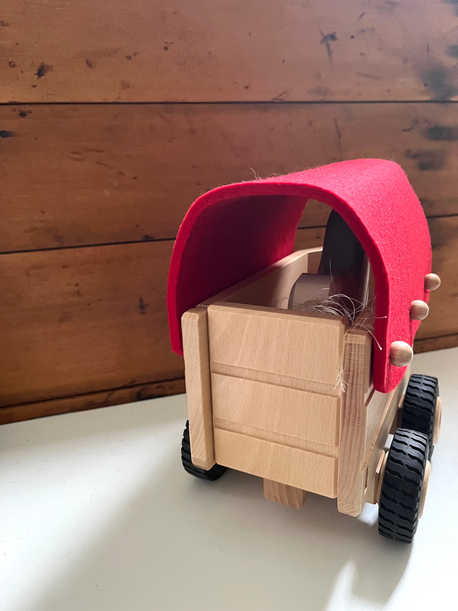 Measures 31 x 22 x 13cm (12,5 x 9 x 5 inches), long, high and wide. The roof is a gorgeous solid, heavy piece of red felt, with holes to easily remove and re-attach to the wooden knobs on the trailer. The ramp comes down easily so the horses can go in!
