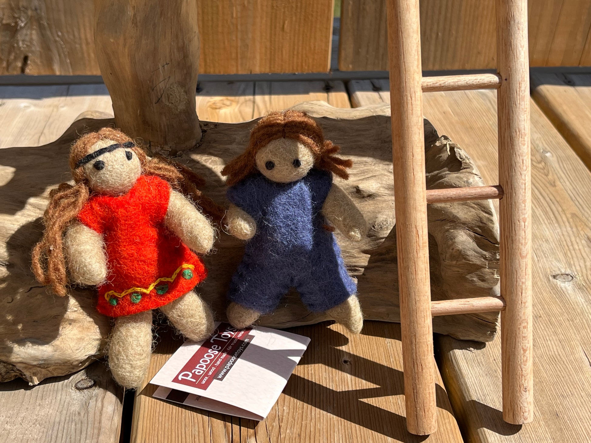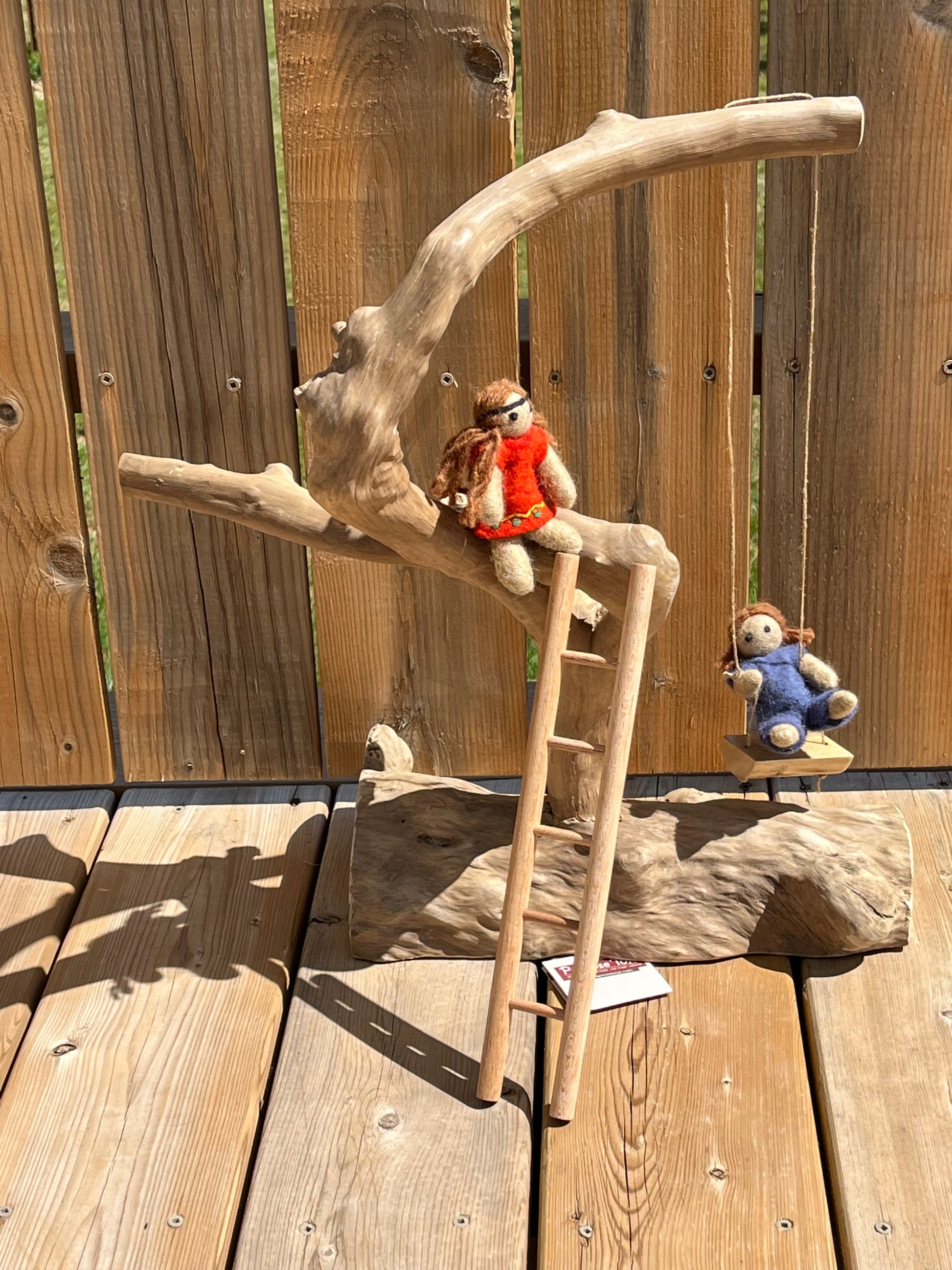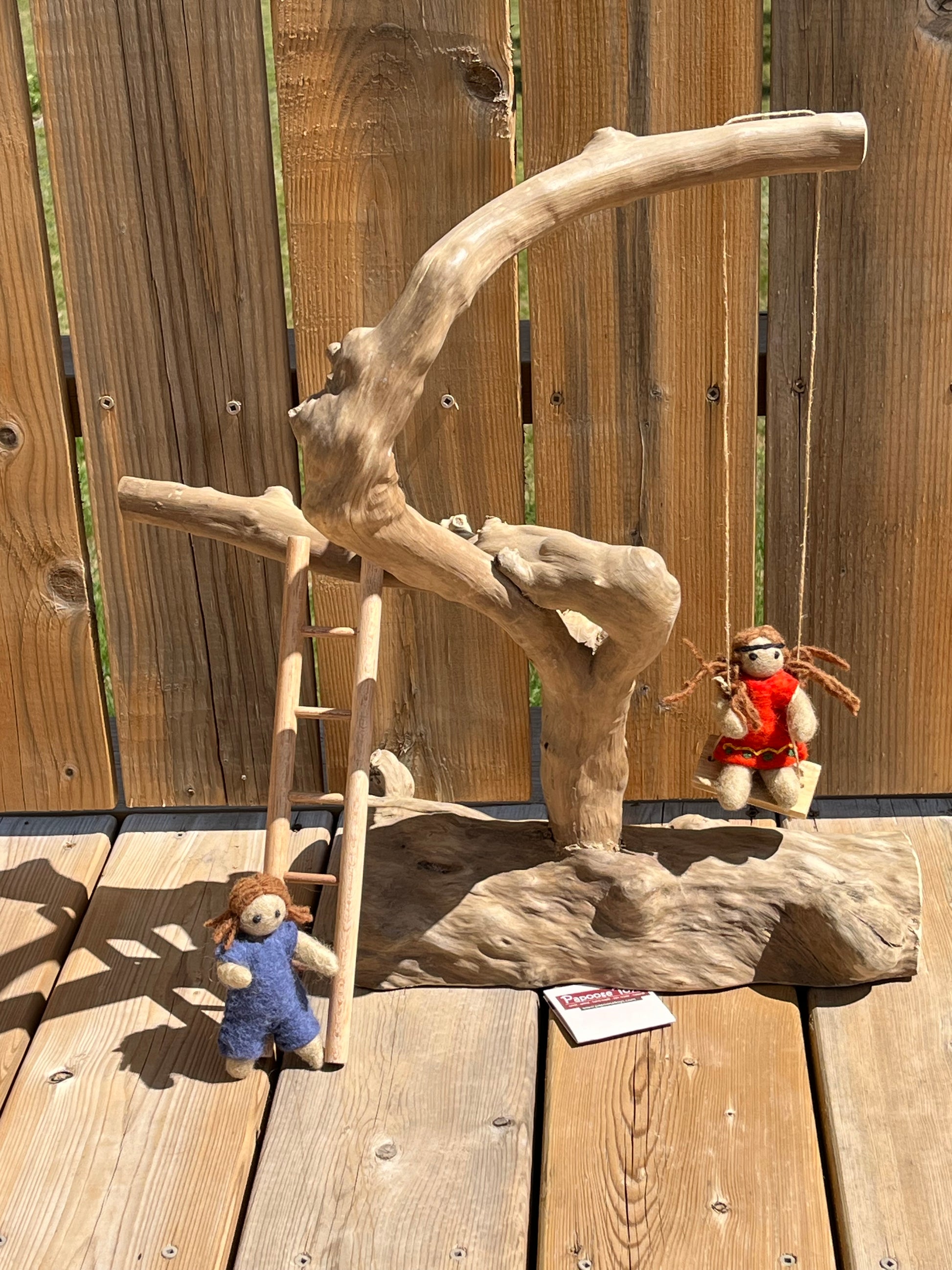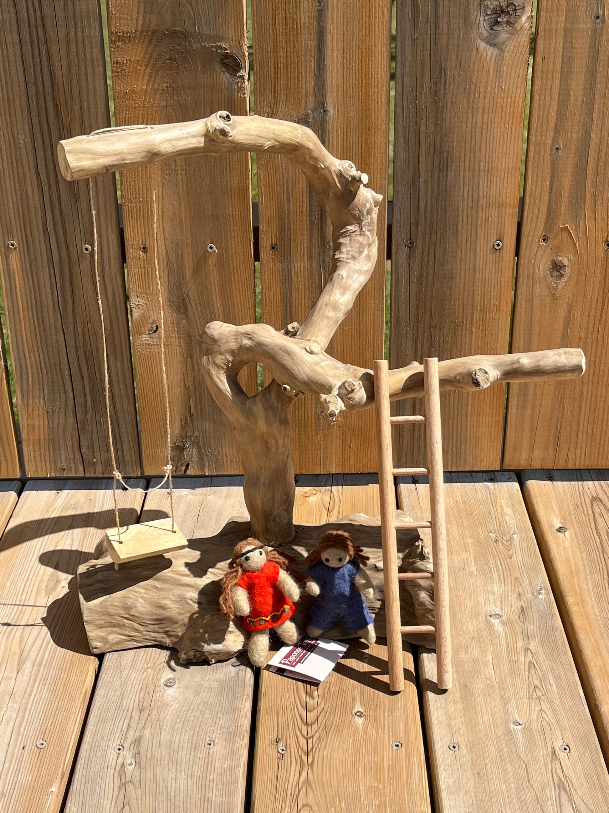 From Papoose Toys. Made in Australia from a real Coffe Wood Tree, this is a unique DOLLHOUSE CLIMBING TREE, with TWO FELT DOLLS and a SWING and CLIMBING LADDER SET! Variations in the natural wood and wool colour of the doll clothes in each unique climbing tree set!