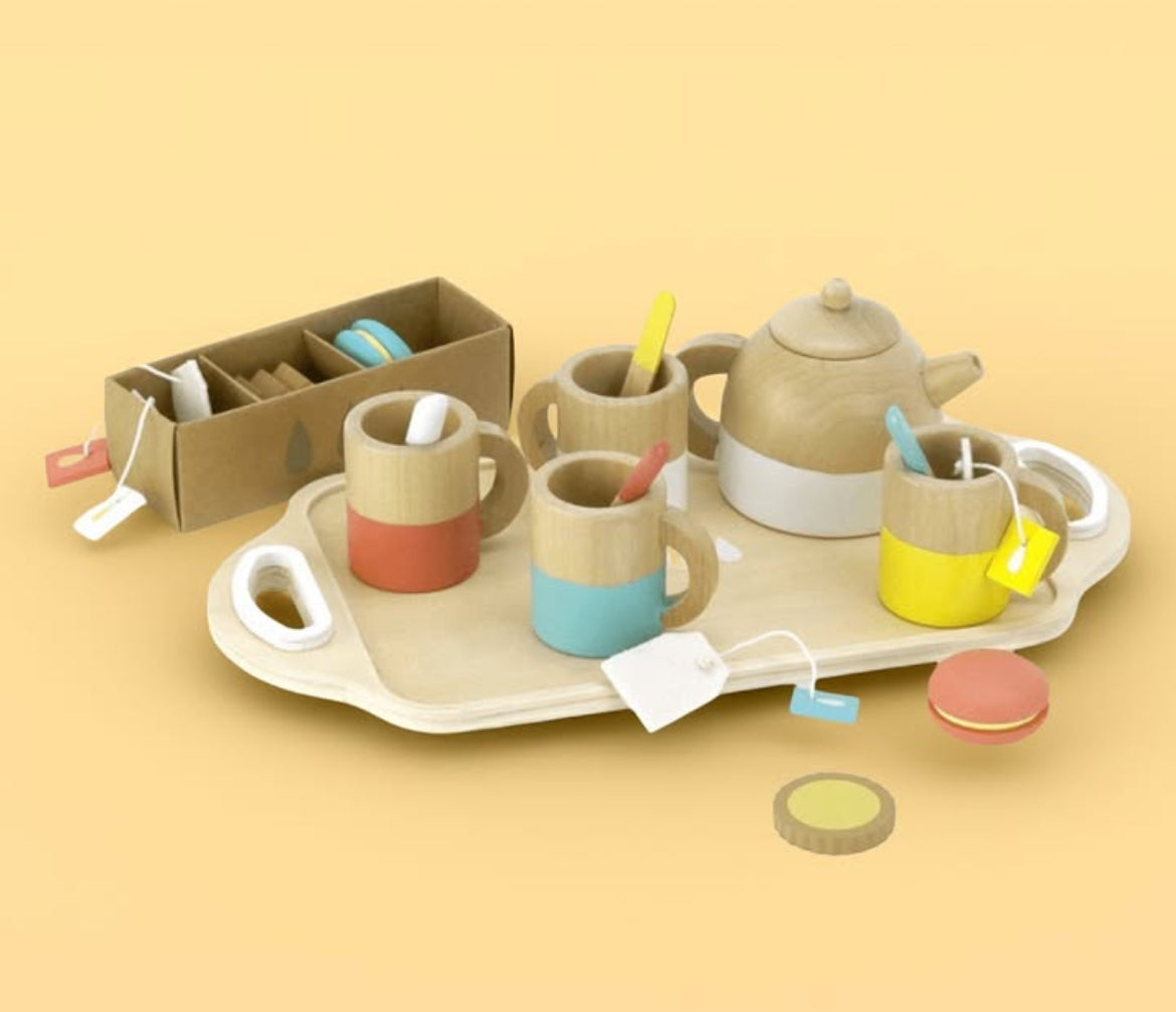 Twenty wooden pieces include: 1 WOODEN TEA TRAY. 1 WOODEN TEA POT (with removable lid). 4 WOODEN TEA CUPS, each with a band of colour (Red, Blue, White and Yellow), with 4 matching WOODEN SPOONS. 4 TEA BAGS. And, do not forget our sweet treats: 4 WOODEN SHORTBREAD COOKIES and 2 WOODEN FRENCH MACARONS! Please do not dunk your cookie directly into your hot tea!