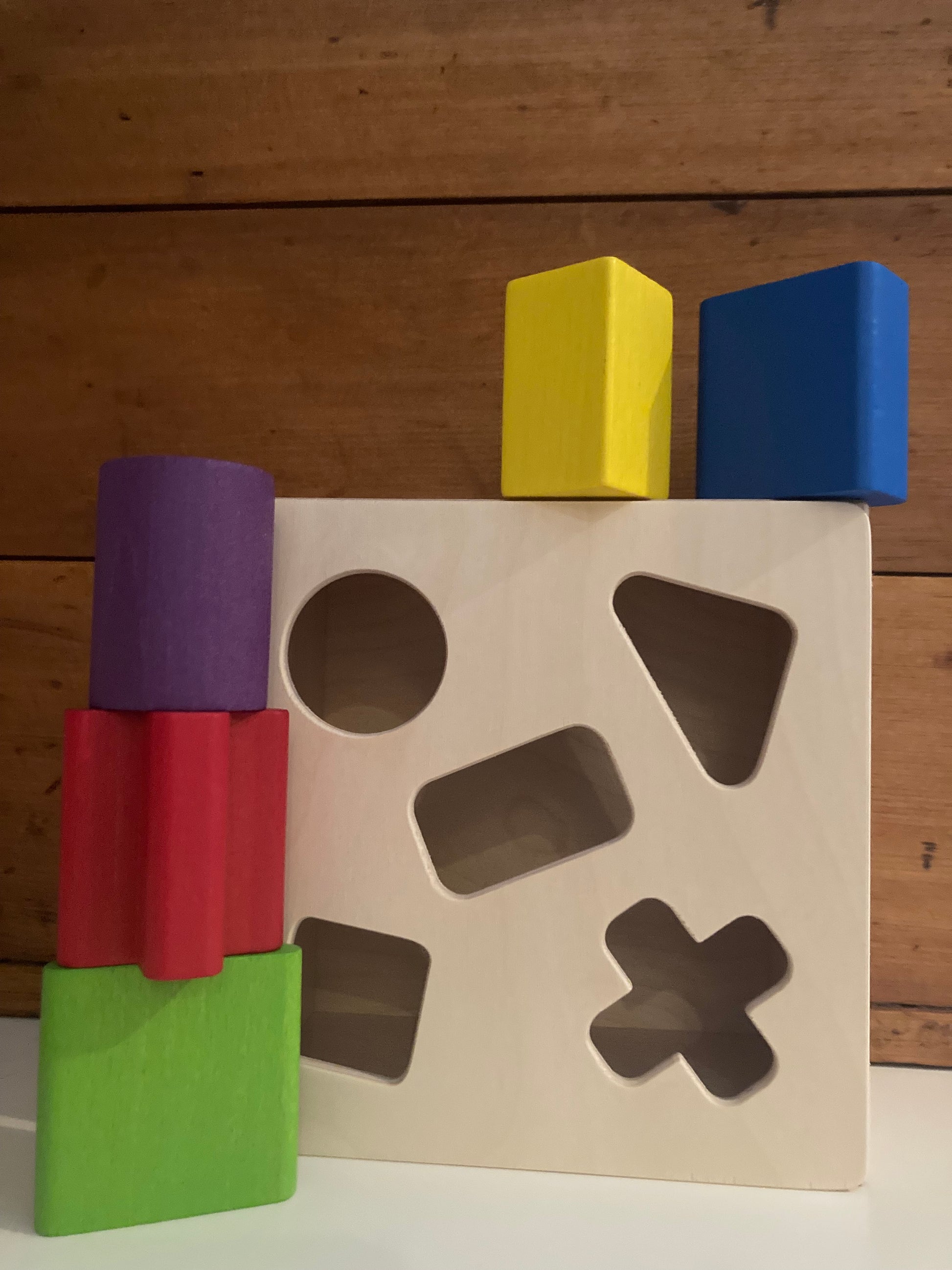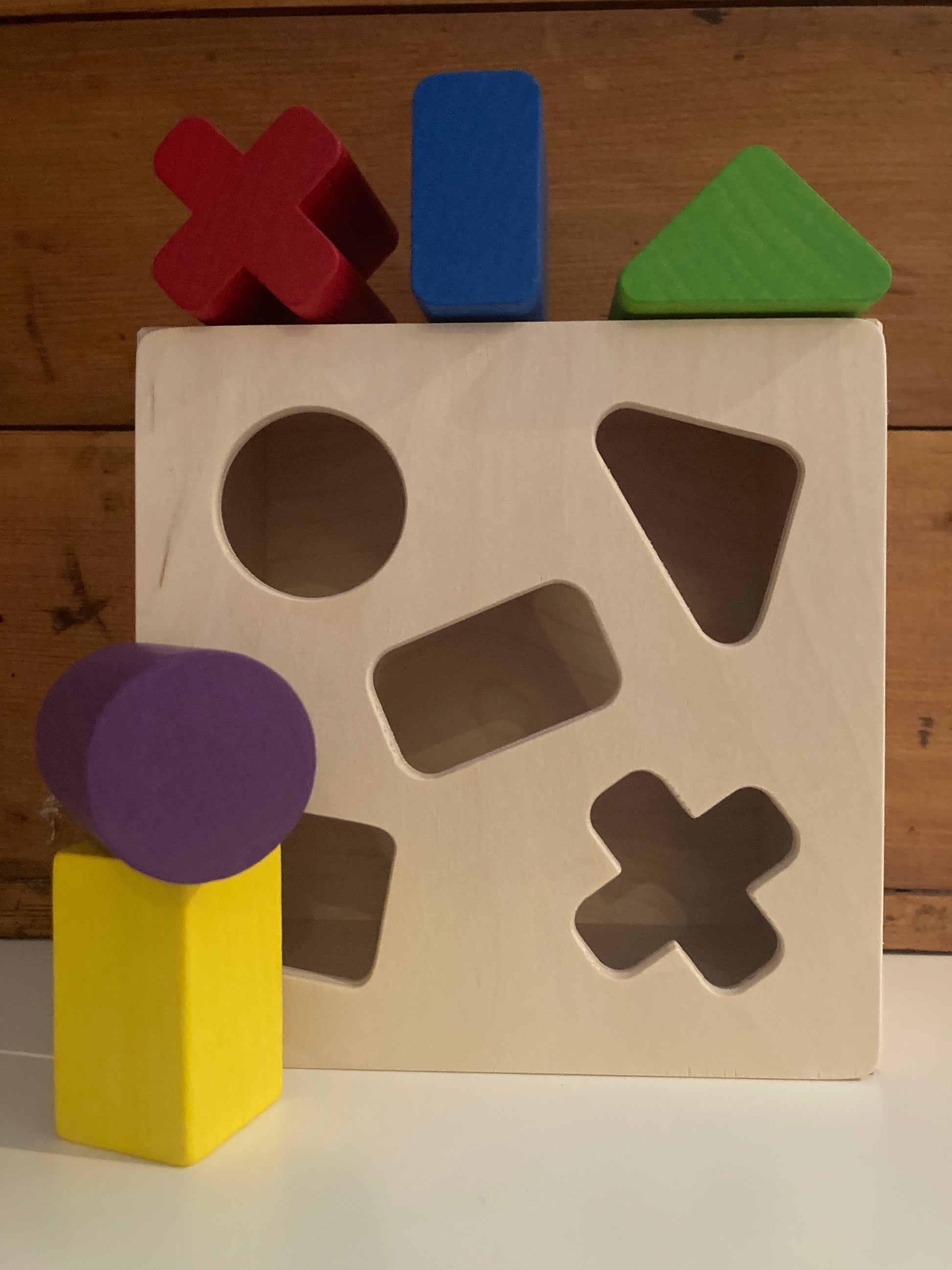 Discovering and understanding shapes and colours are a basic element in child development. This all wood SHAPE SORTING BOX has large geometric shapes that are easy to understand and sort into the corresponding opening in the lid of the box. They are designed so that each shape can be inserted only through its own opening. After playing, everything is placed in the box for easy storage.