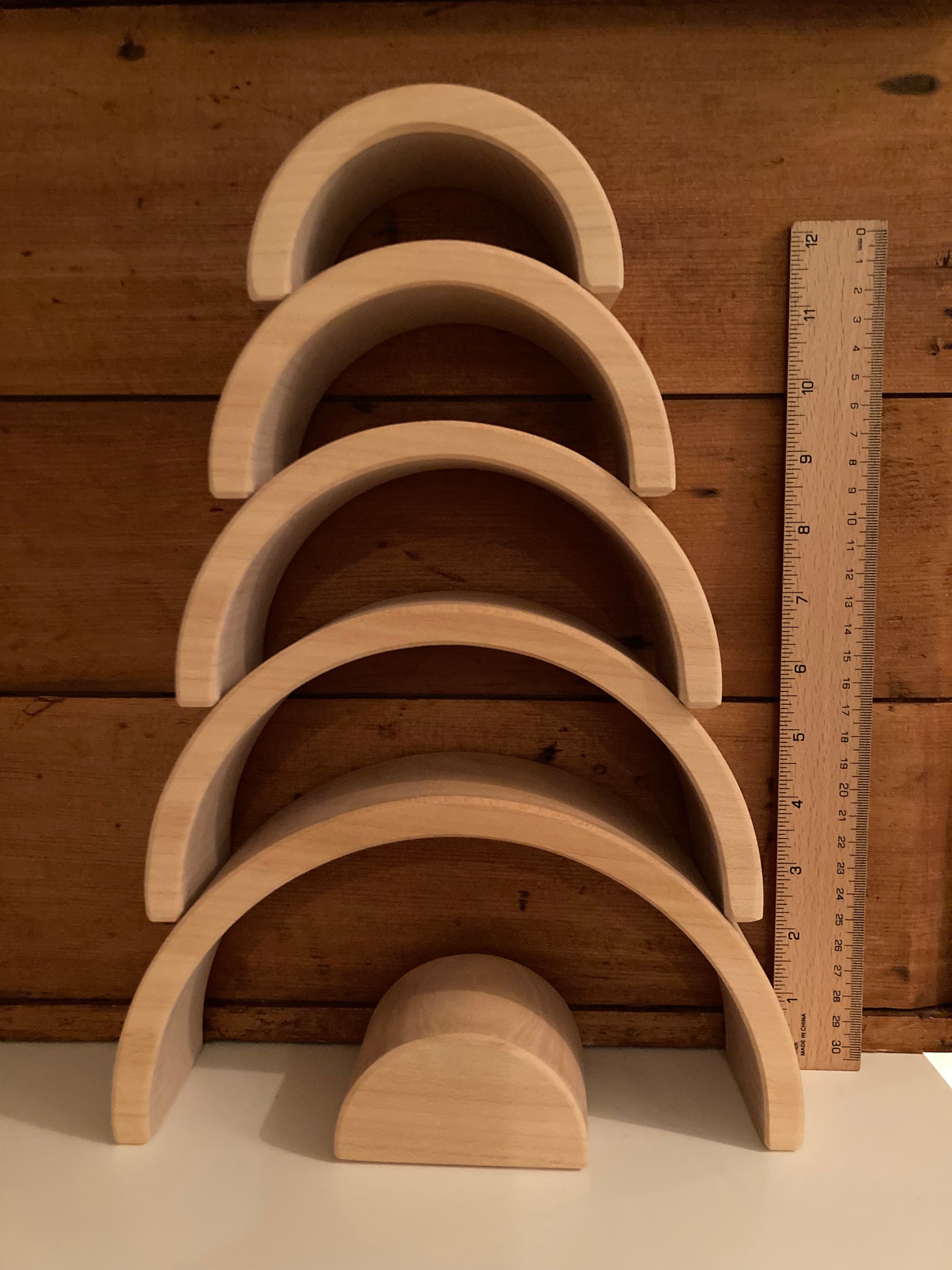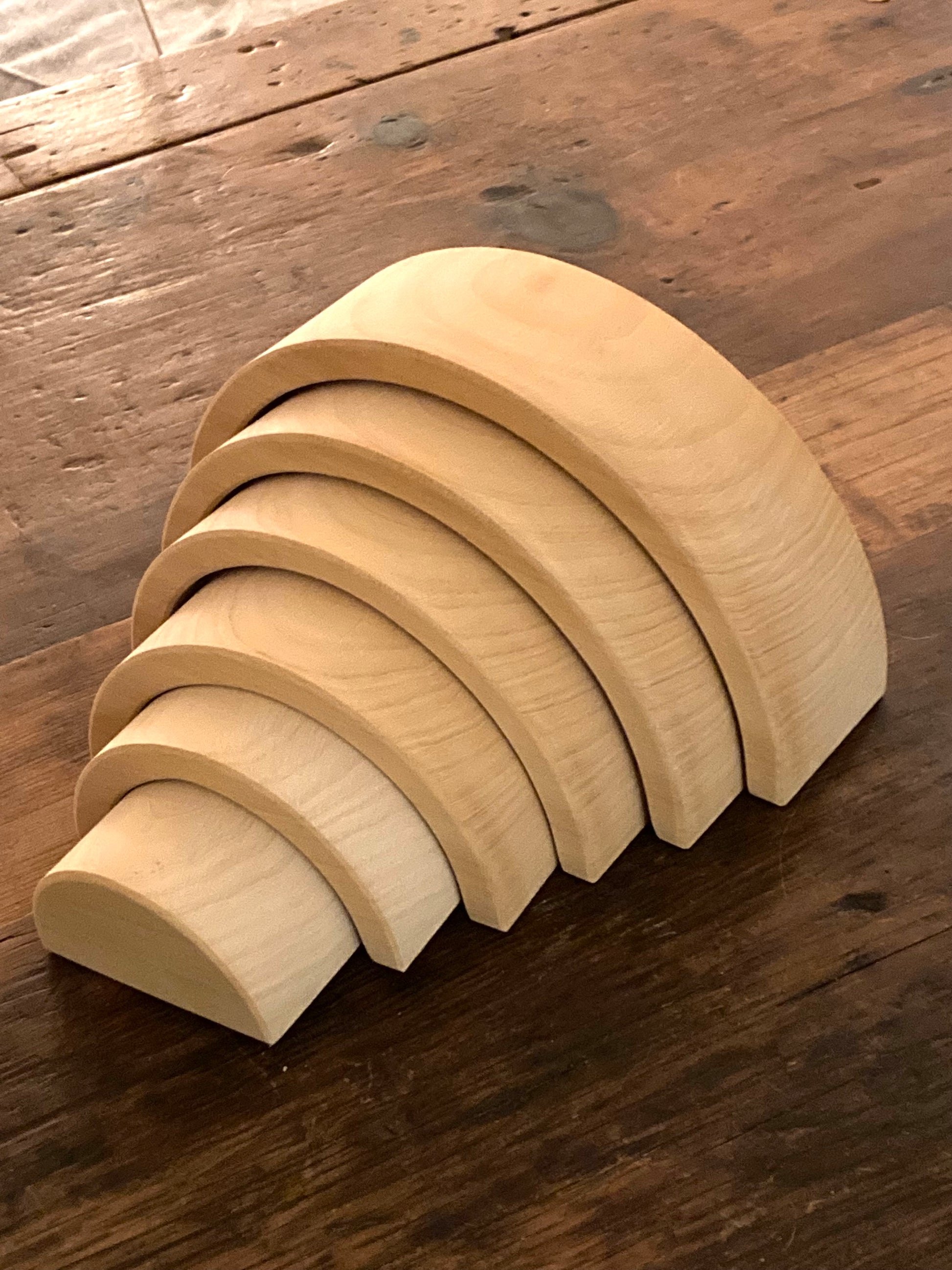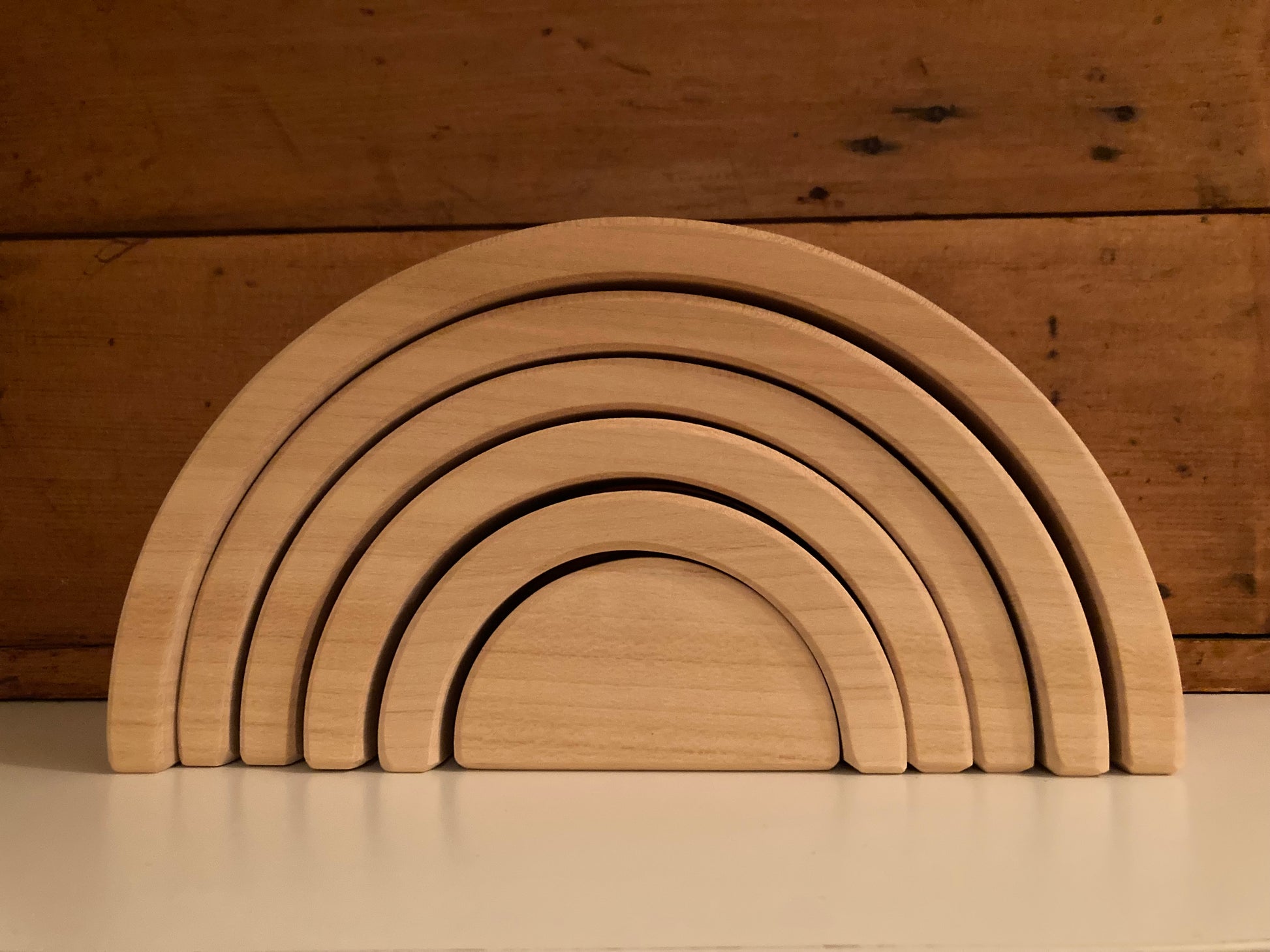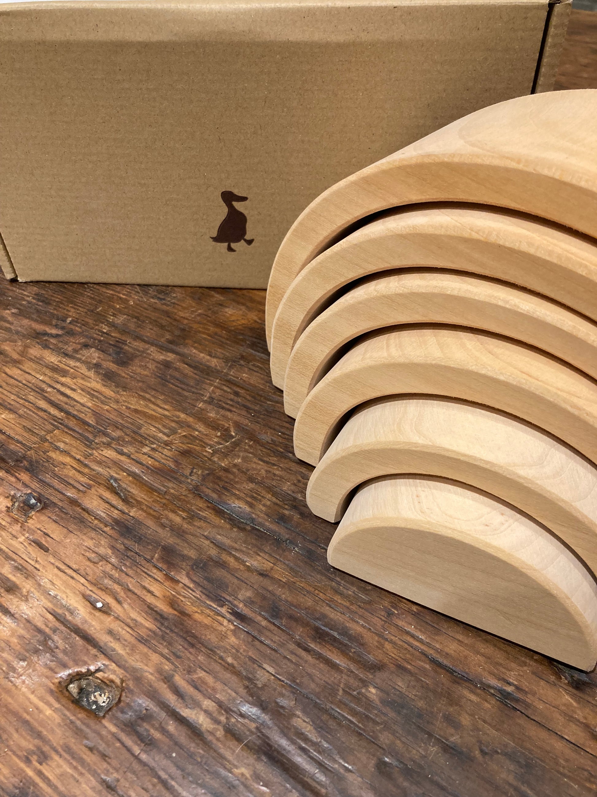 Ocamora nesting arches are made in Spain with linden wood harvested from Spain and France. The wood is labeled with FSC certificates and the arches are treated with ecological and environmentally friendly products. The oils that are used to finish the Ocamora toys are a mixture of flax oil, tung and some vegetable oils. The stains that are used to colour the wood are made from water dyes. Both the oils and beautifully coloured stains comply with the safety regulations for toys. Absolutely safe for Baby!