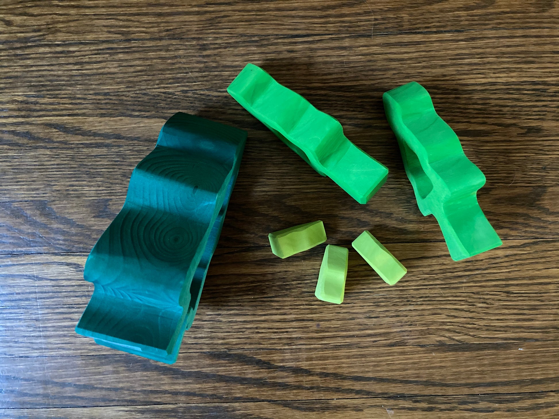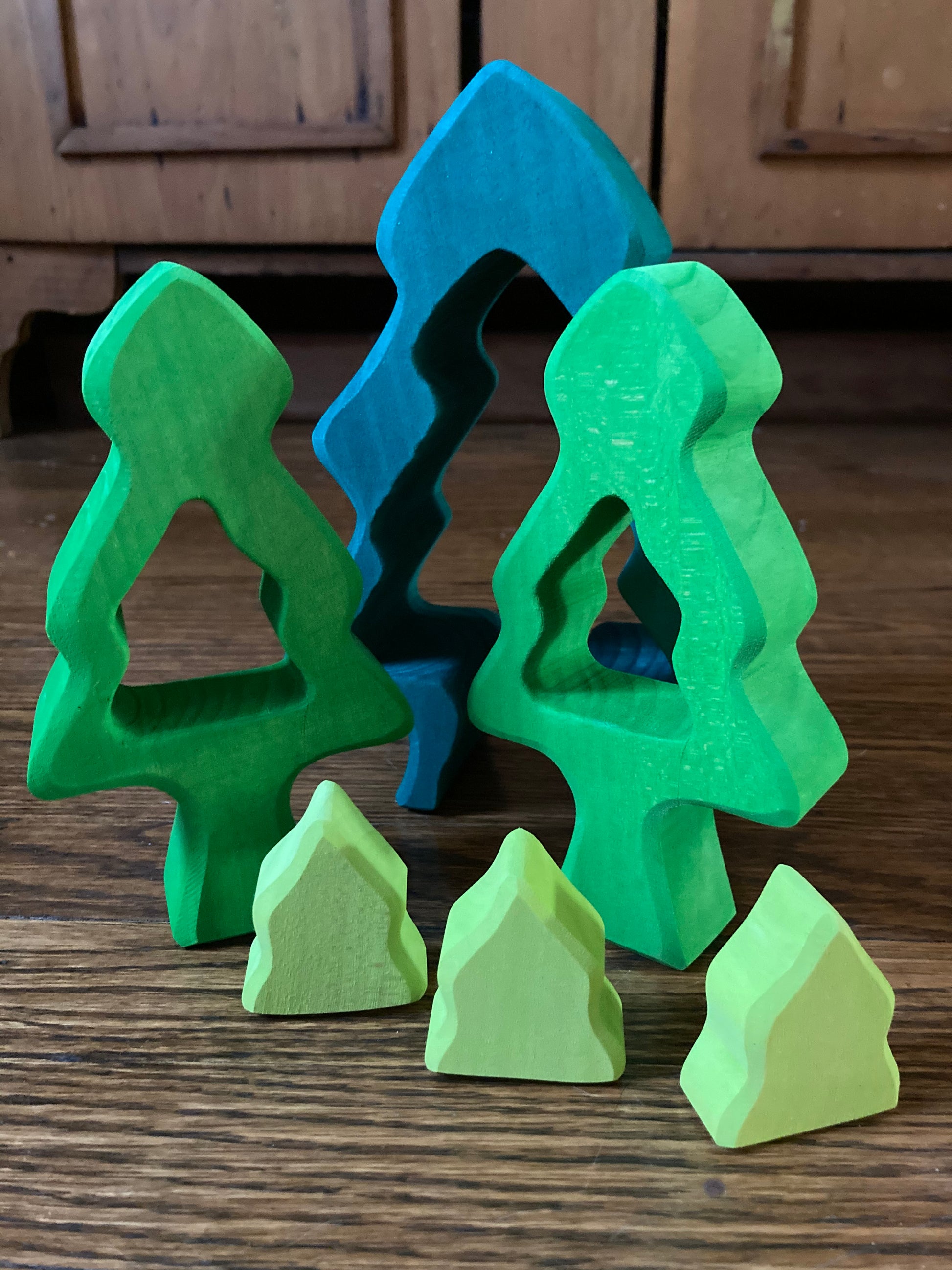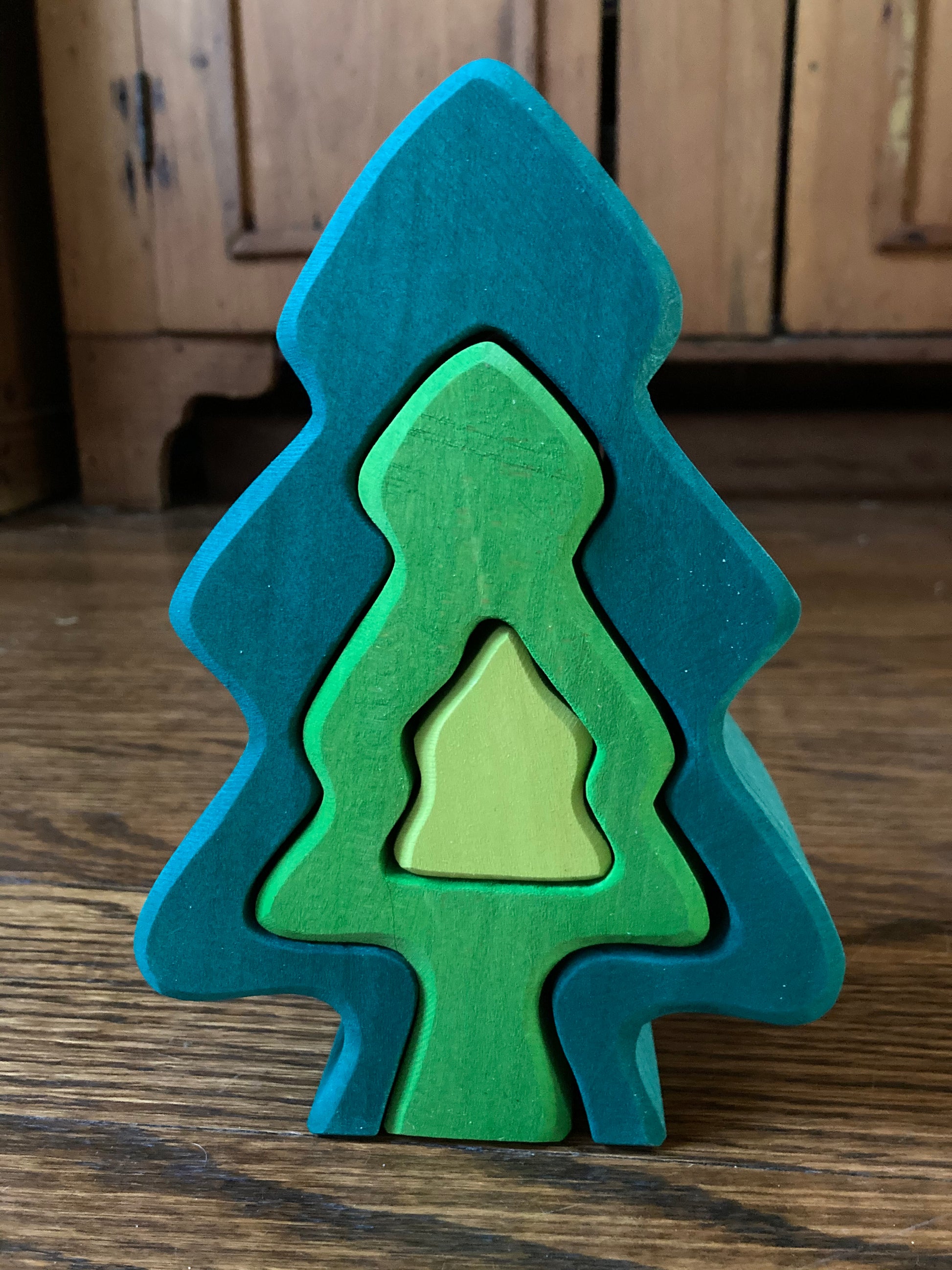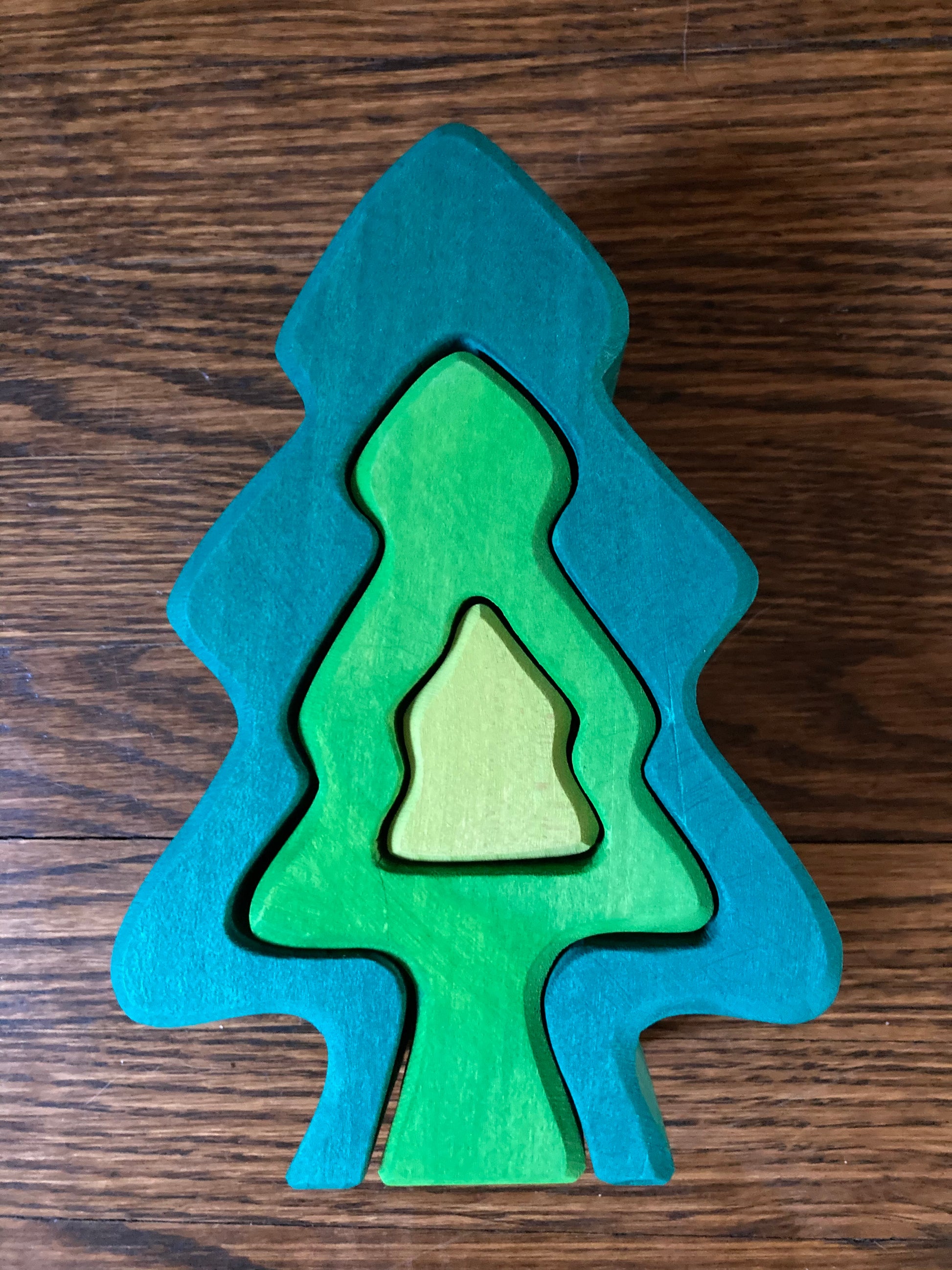 6 PINE FIR TREES fit one inside the other, to form this unique PUZZLE piece. The largest outside tree measures 20x5cm (7,5x2inches). The 3 littlest pine trees sit inside the middle tree.