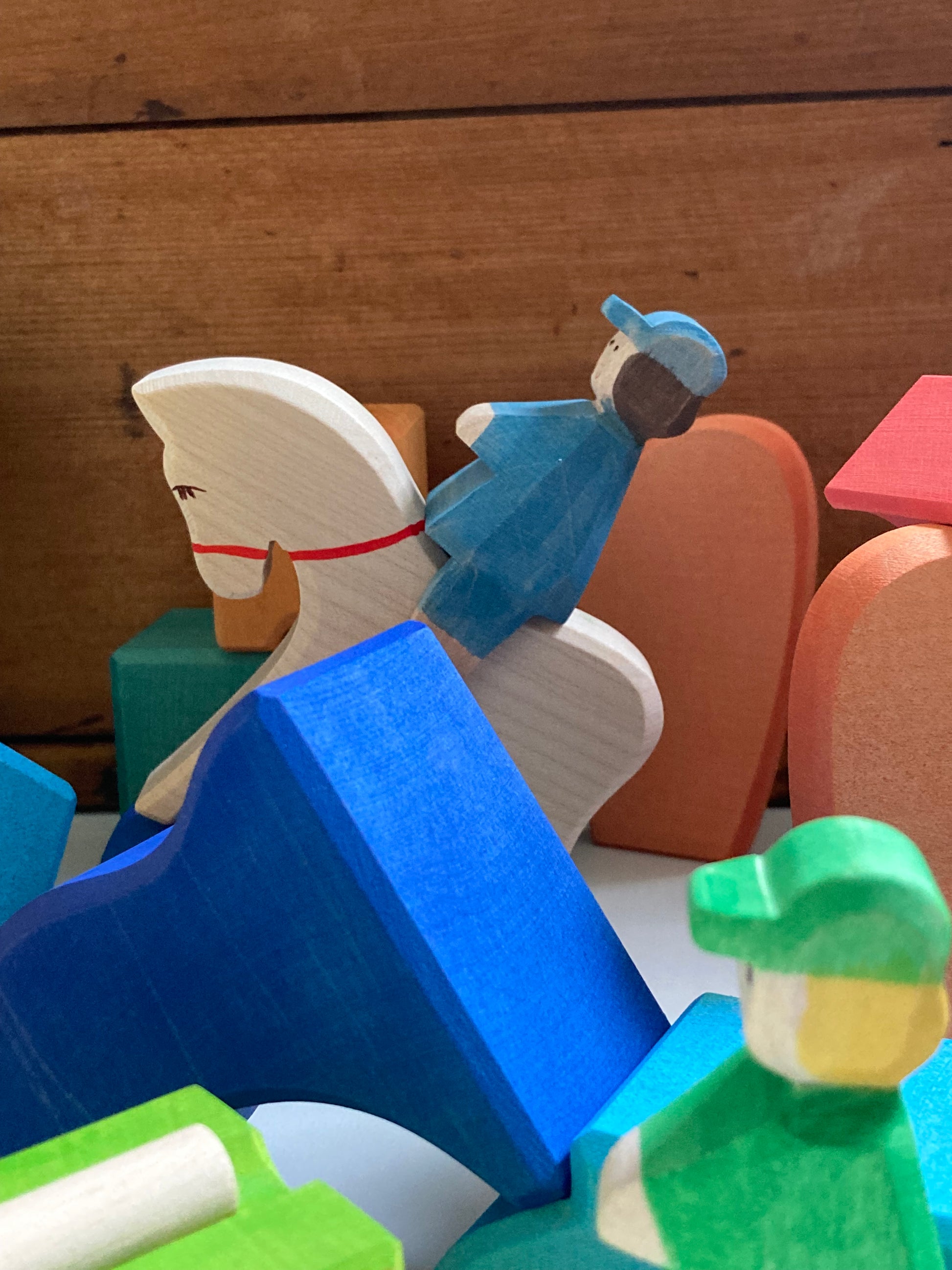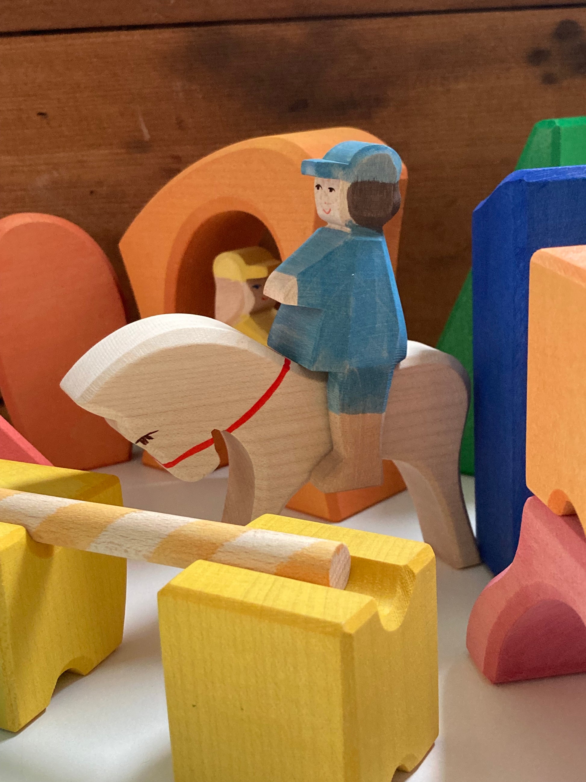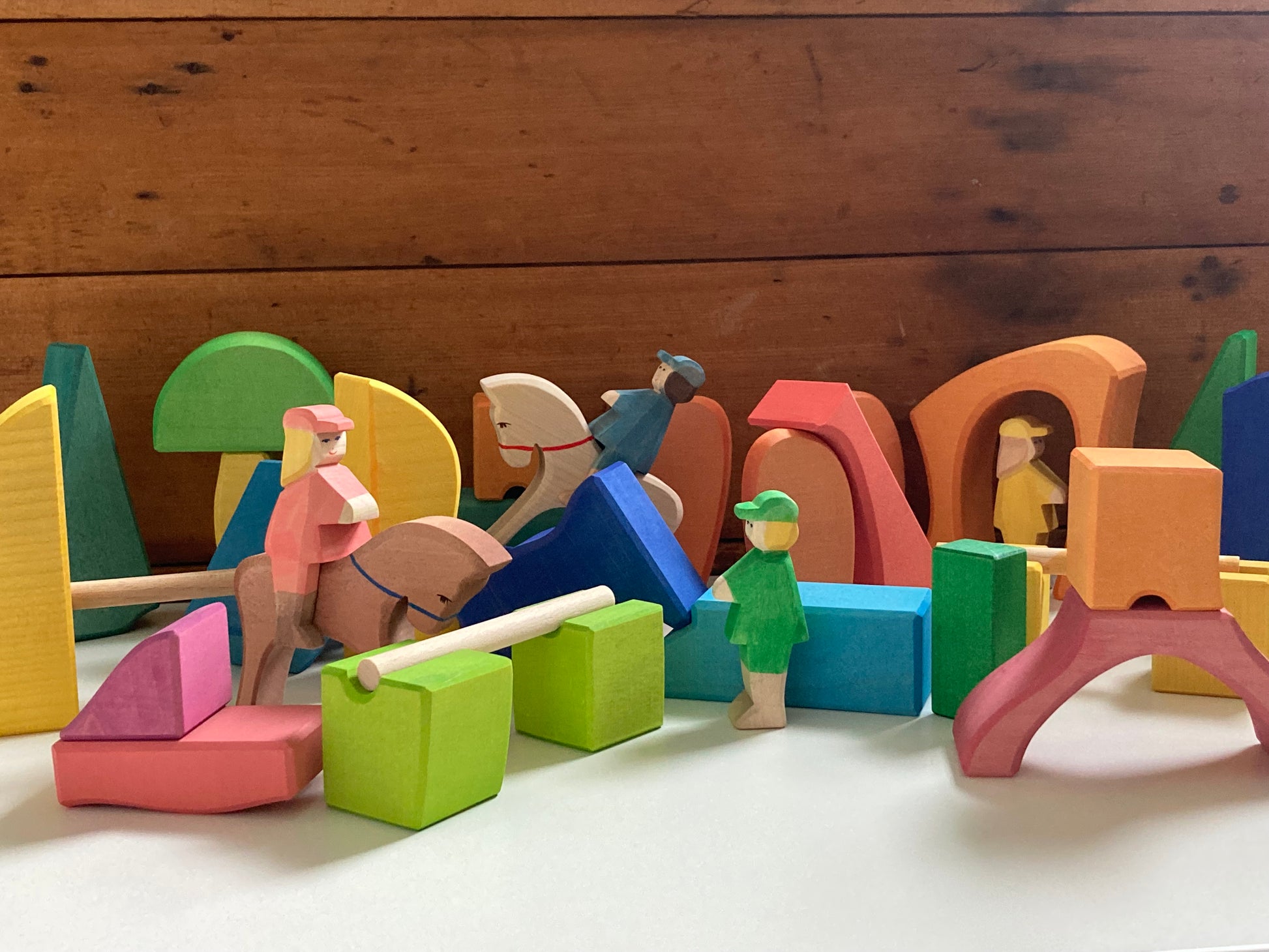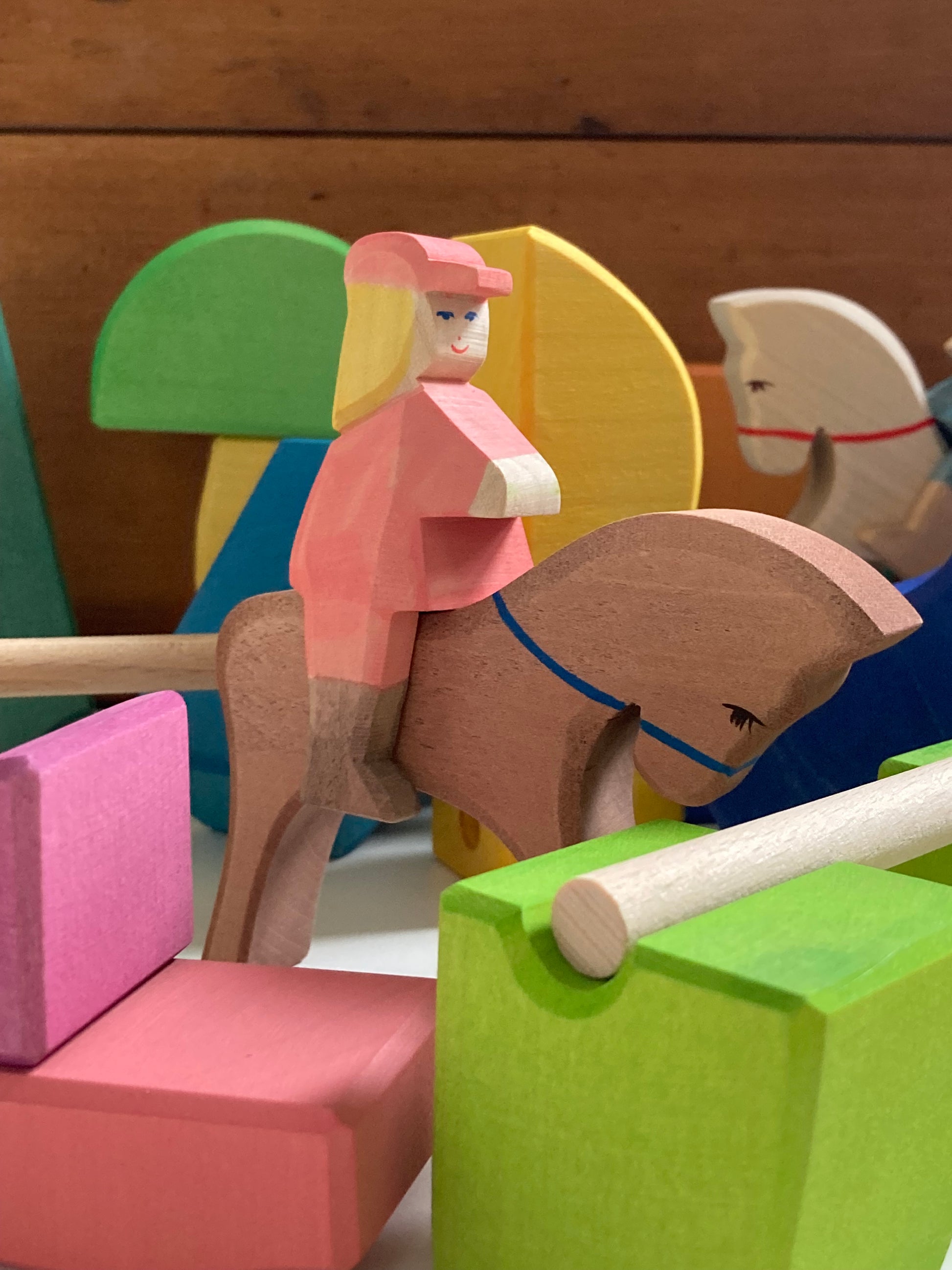 This is their RAINBOW RIDER FARM BLOCKS SET including 2 HORSES to ride, 2 colourful RIDERS, that can stand on their own or stay seated on their horse, and 2 additional colourful FIGURES, also able to stand on their own!