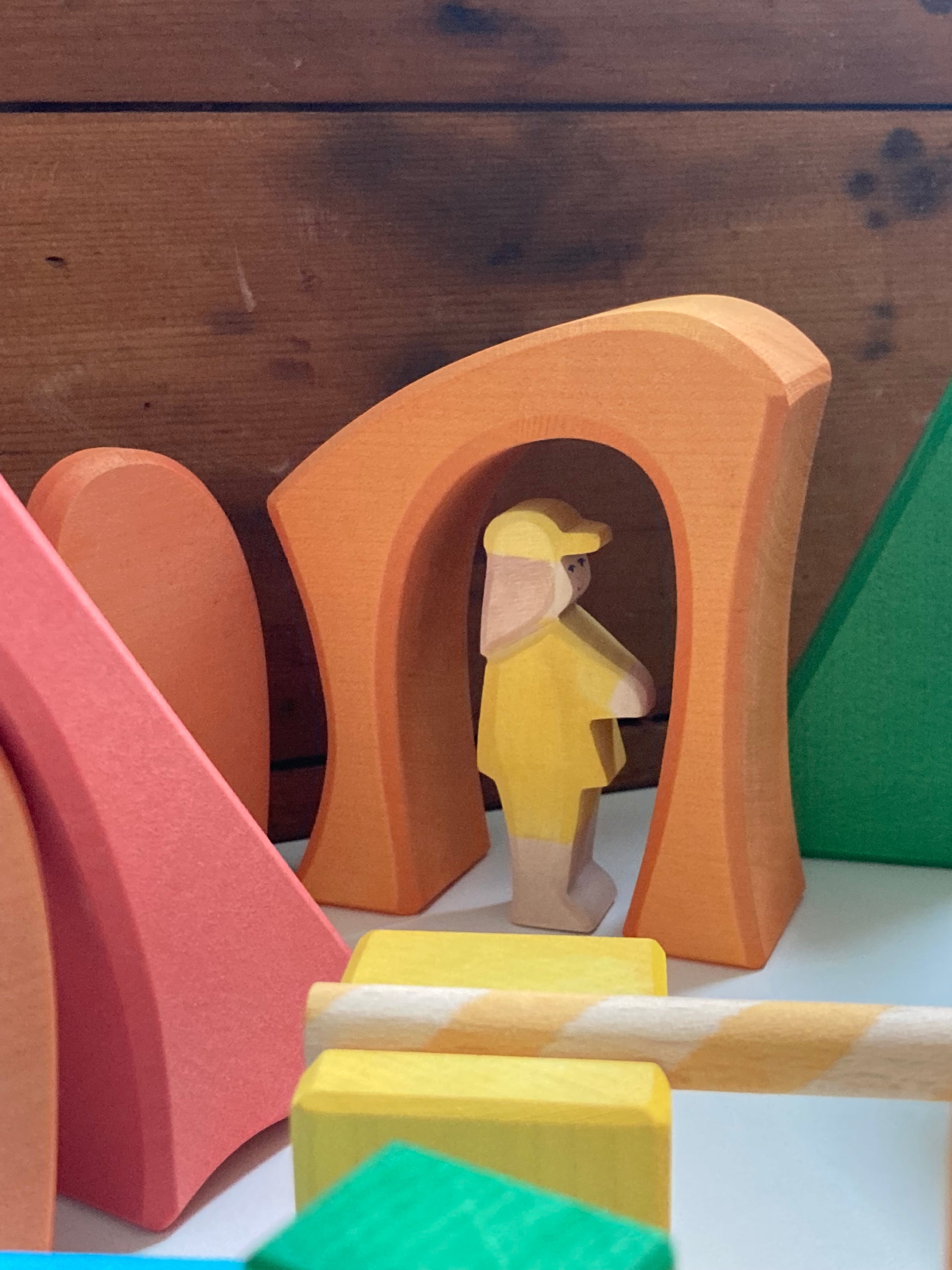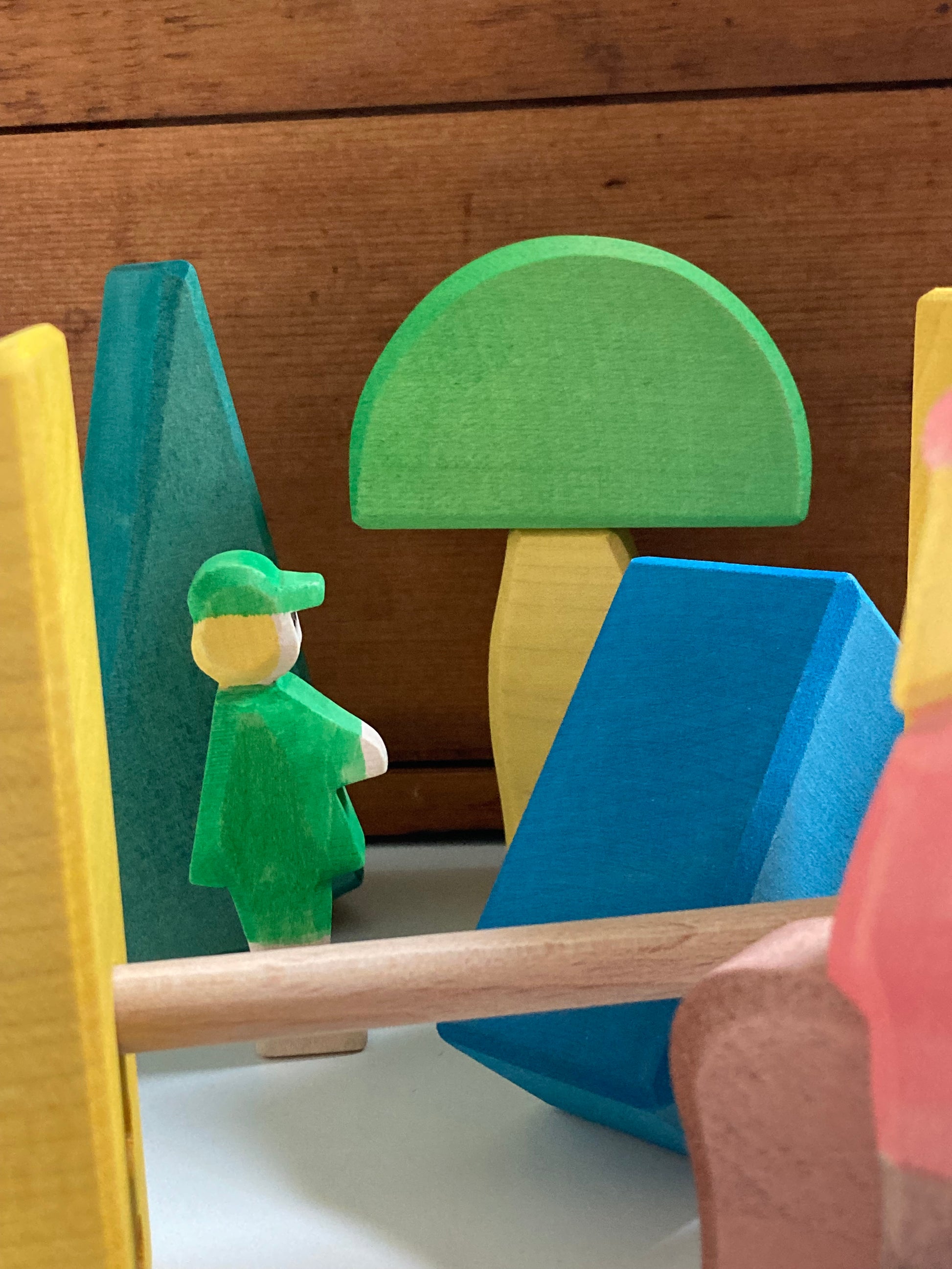 Also, from the world renowned Ostheimer woodworking shop comes this fantastic play set of mix-matching colourful blocks, with grooves for poles, and shapes for trees and bridges, and hide-ways and tunnels!