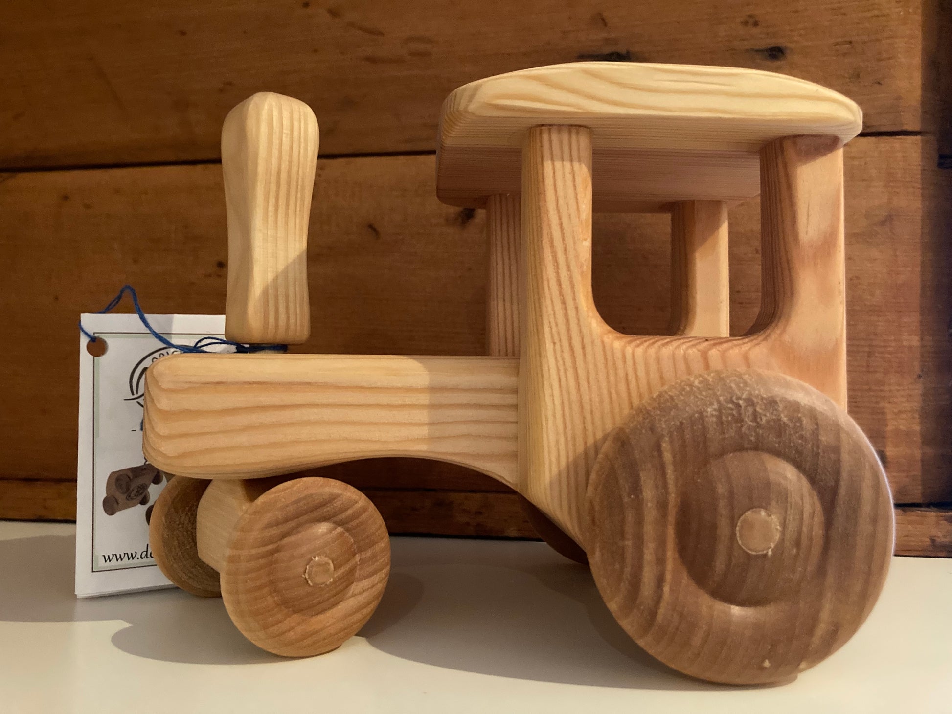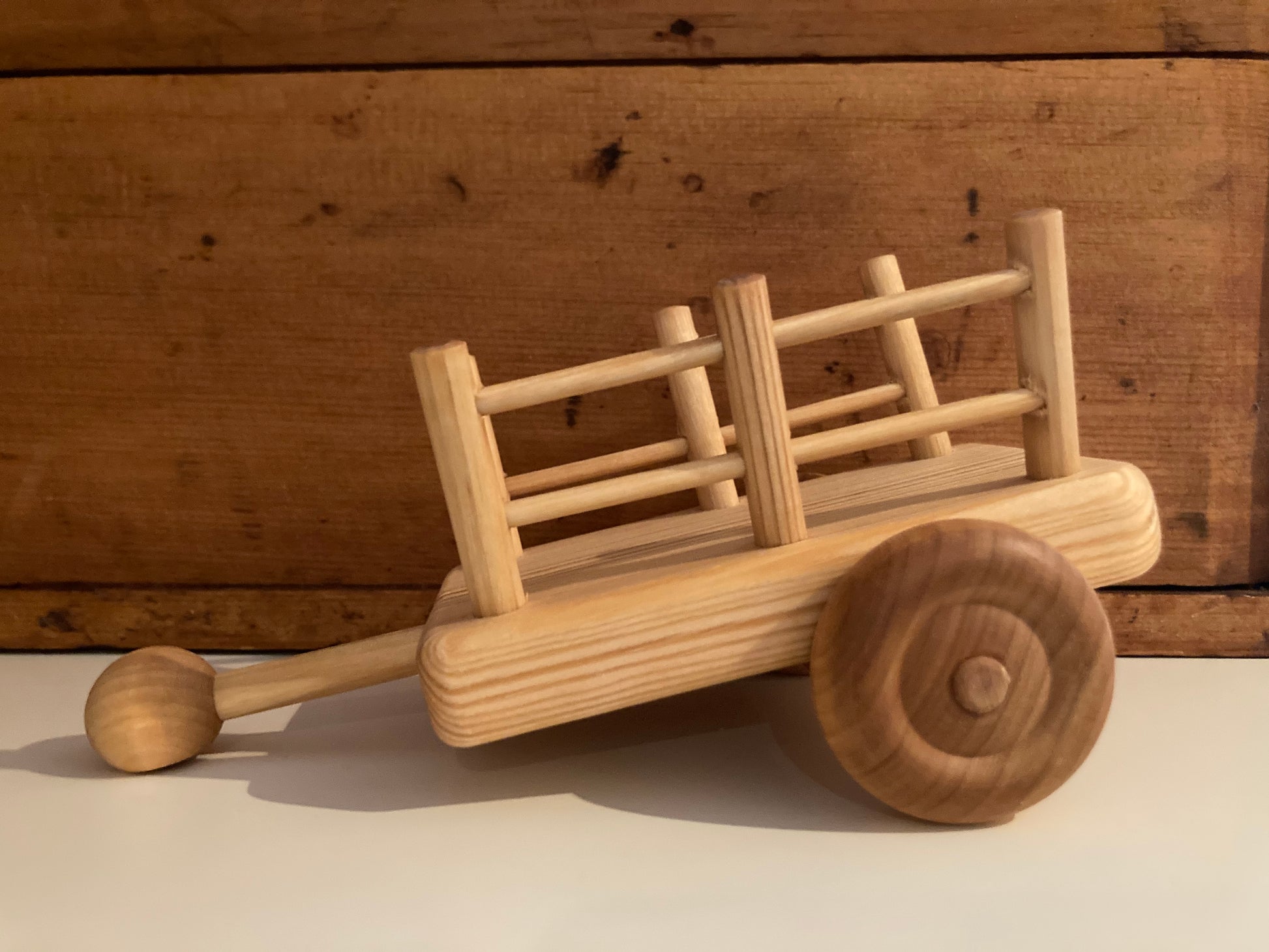 From Debresk Handmade Quality Wooden Toys in Sweden. This is their large TRACTOR with WAGON CART. Measures 40cm (with the cart attached).