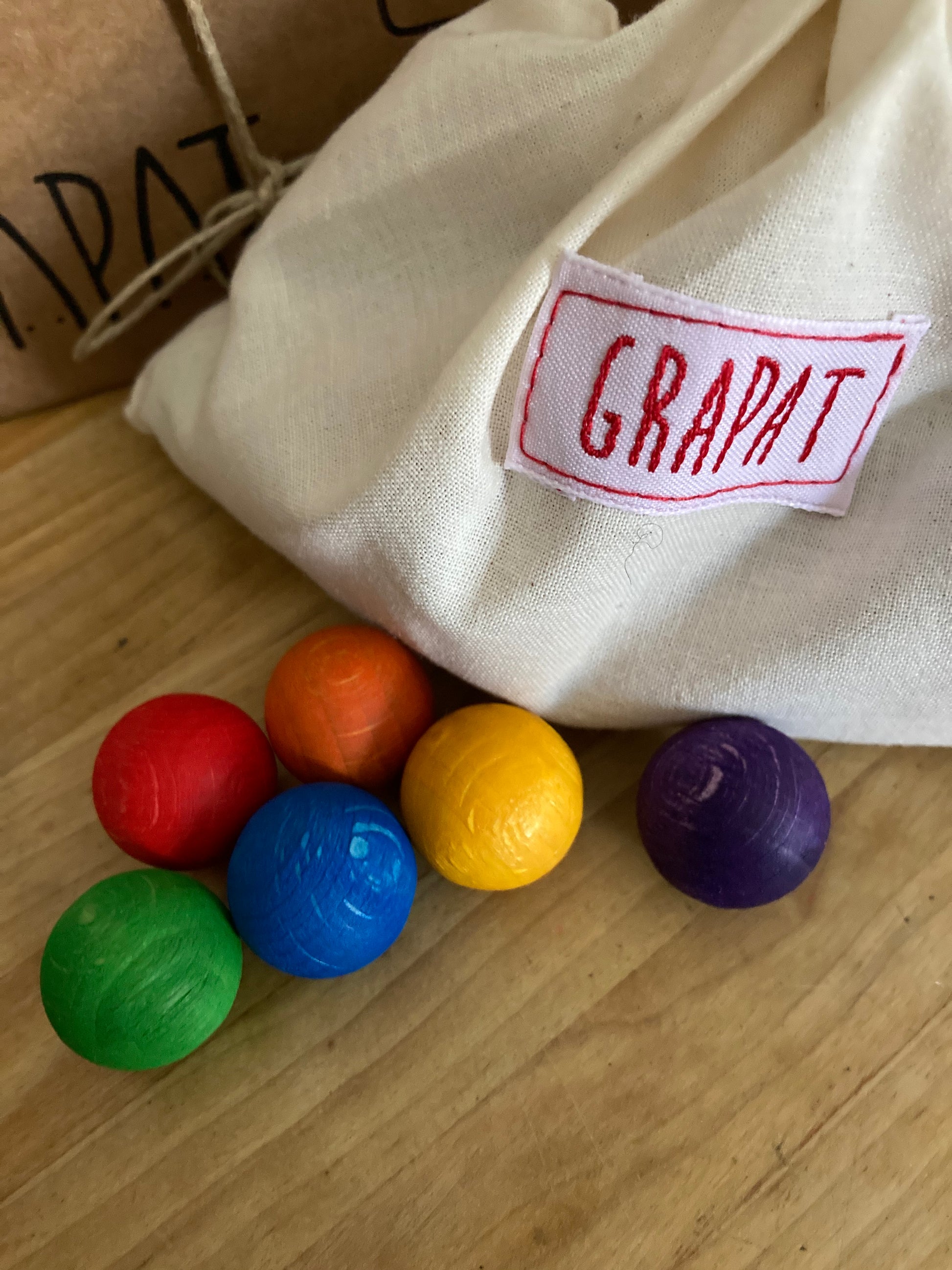 36 WOODEN MARBLES in 6 beautiful colours. All in a muslin cloth bag. For limitless fun, and helpful with counting games. Pair them with the wood bowls from Grapat. Sold separately.