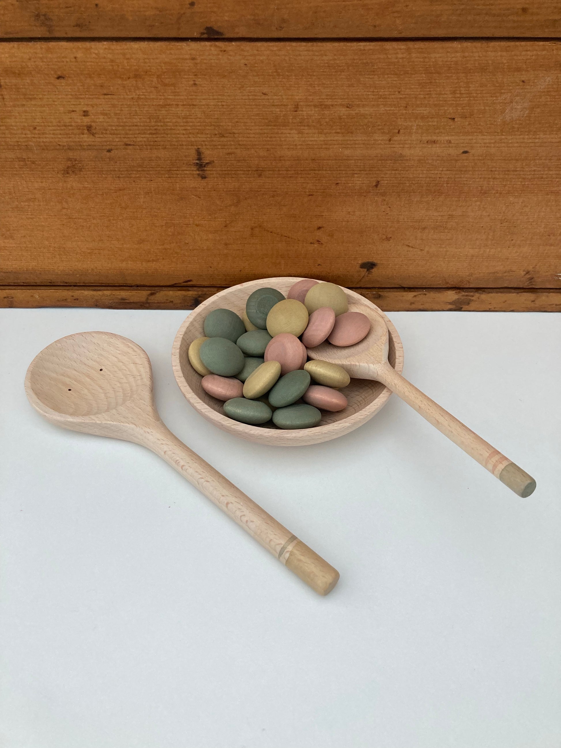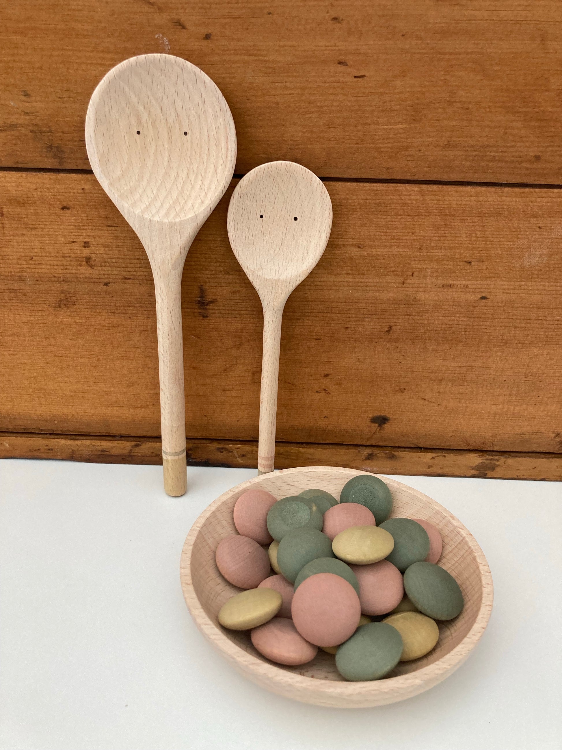 Large wooden spoon is 20cm (8inches). Bowl is 10cm (4inches) across. Unfinished, sanded smooth, hard wood. Toys that feel nice to the touch.