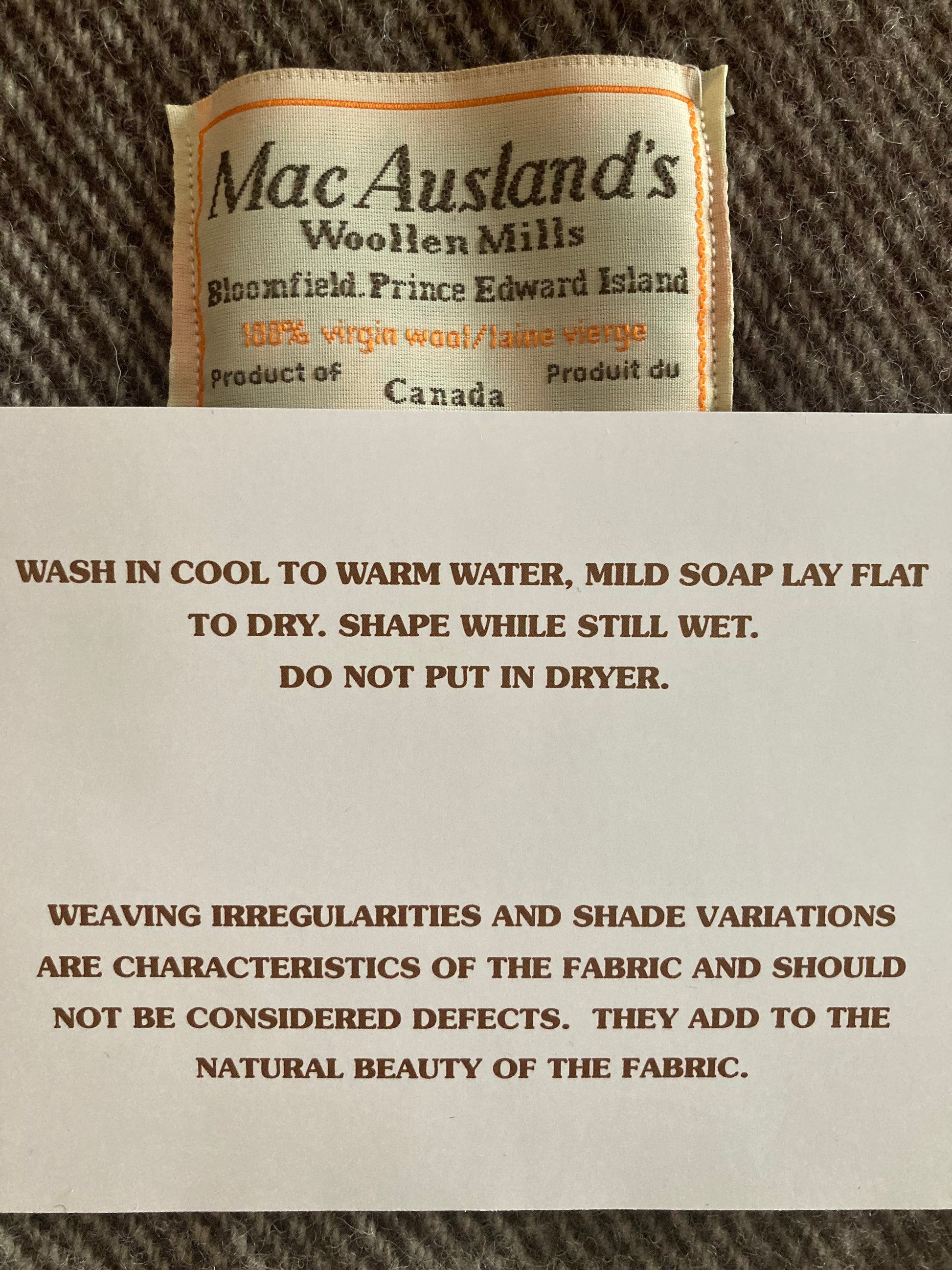 Made by MacAusland's Woolen Mill in the north-west corner of Prince Edward Island, Canada with finished edges, in a light herringbone tweed, gorgeous perfect weight, for extra winter warmth, and just perfect cozyness.