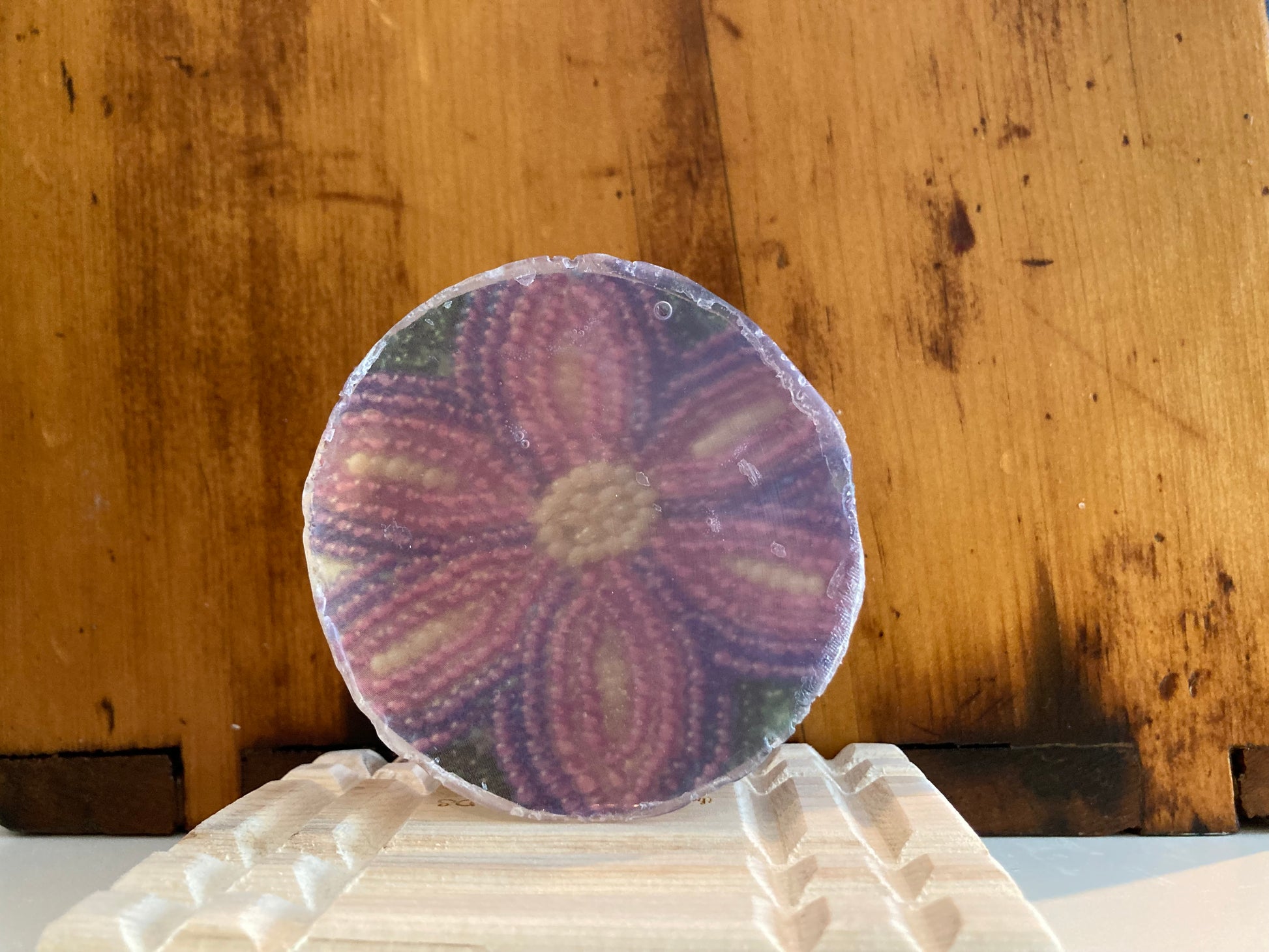 This clear bar of glycerin and coconut oil soap has a light refreshing scent. Each of these unique soaps contain an original piece of beautiful bead work to be treasured after the soap is used.