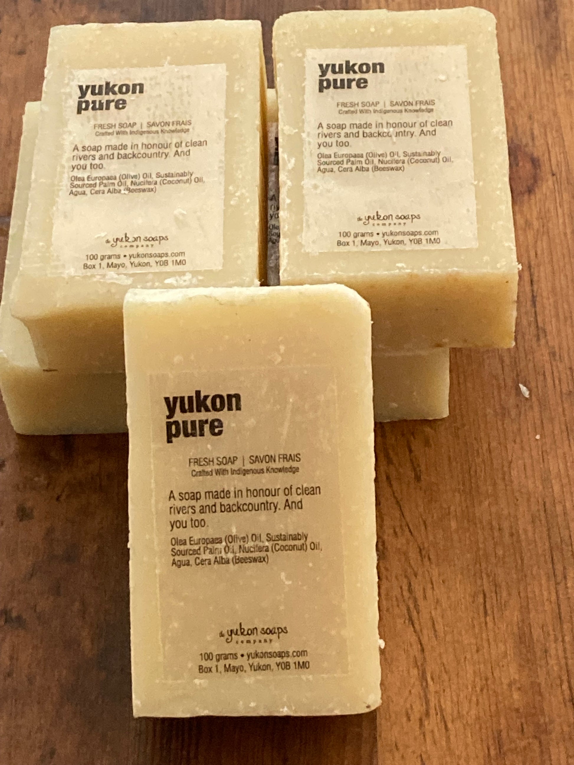 This bar of YUKON PURE SOAP has a very light, fresh scent. Crafted with Indigenous knowledge, made "in Honour of clean rivers and backcountry. And you too." All of these soaps are made with love, honouring the local land and water, made with as small a footprint as possible.